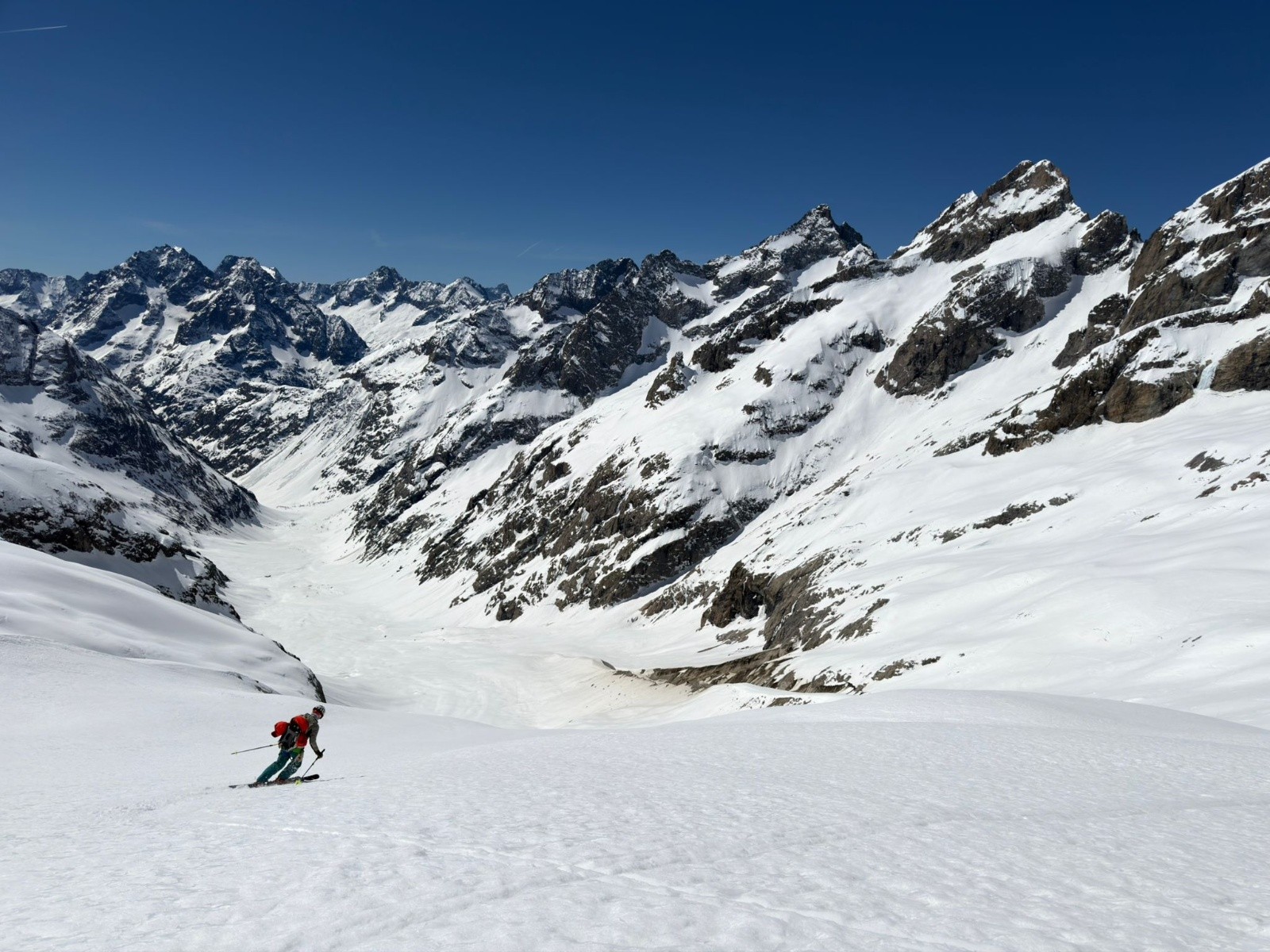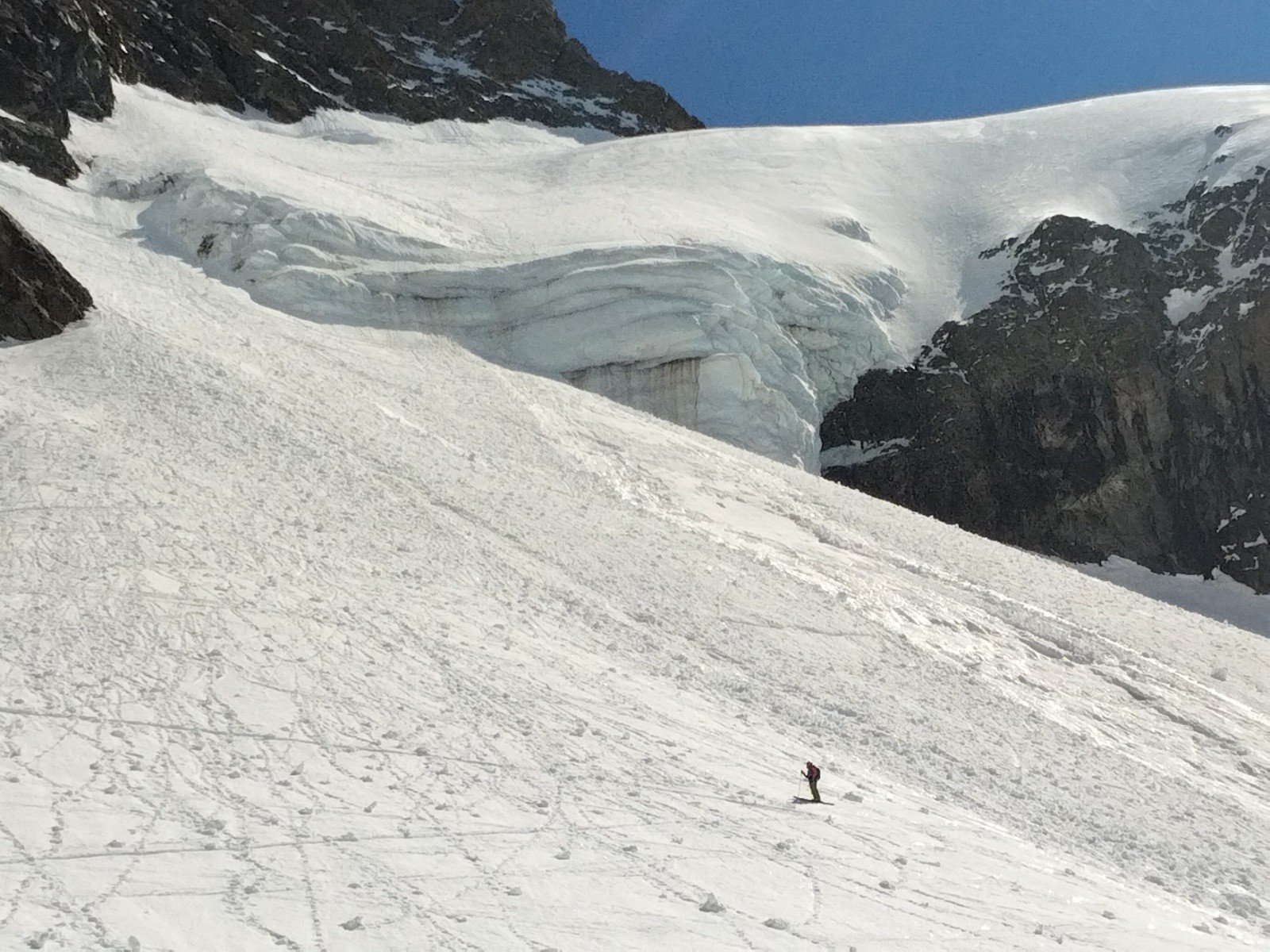Derrière nous le guide, qui avait fait la pause au refuge, regarde ses cobayes tester les conditions. Bien vite, la neige s'adoucit et la vraie descente peut commencer. La navigation dans le glacier est aisée car c'est bien tracé. C'est une jolie descente, qui a déjà bien chauffé sur le bas.