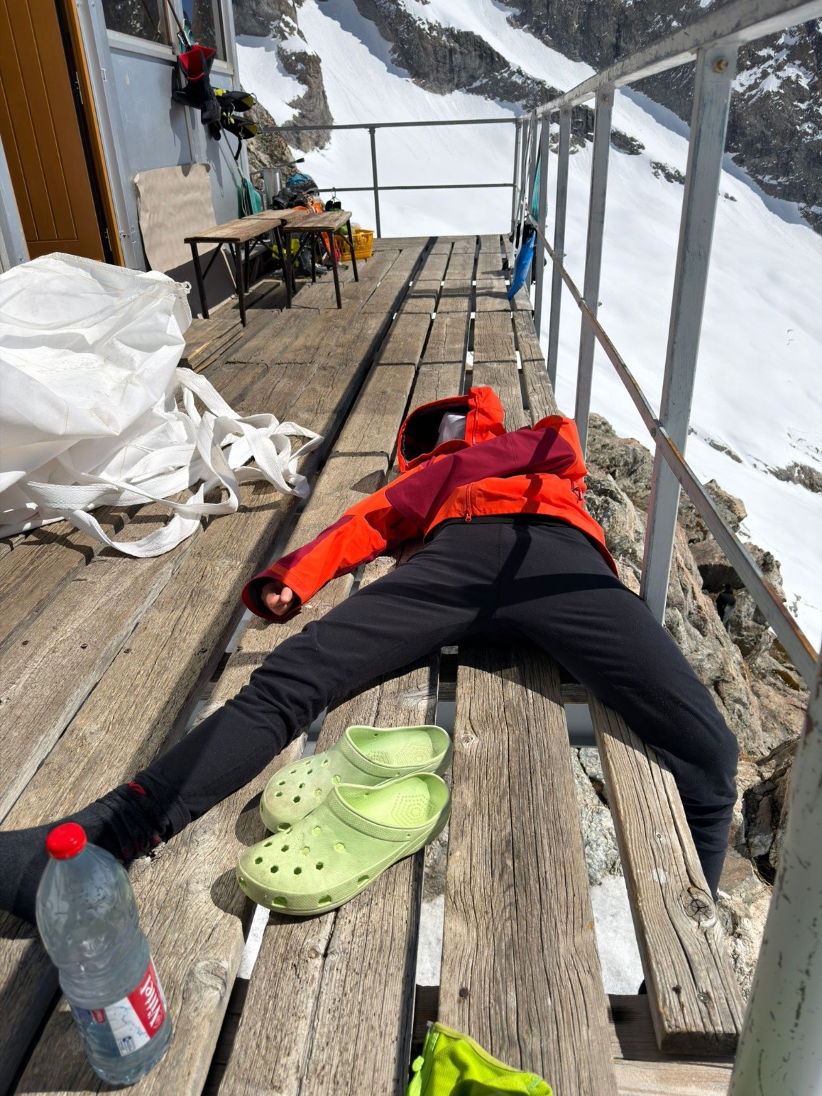 Le refuge a fait le plein de son lot de personnages forts en caractère : celui qui accroche ses chaussures sur la gouttière rafistolée au scotch marquée "ne pas toucher" , celui qui remue ciel et terre pour trouver un ibuprophene car il s'est tiré le dos (et pas un doliprane car c'est musculaire , tu comprends). La gardienne en a 4 dans sa réserve à pharmacie pour la saison, "je vais prendre les 4" , ben oui, t'as raison, ouais. Et puis y a l'étoile filante, celui qui parle fort au point que toute conversation avec ton pote est impossible, tout tourne autour de ses exploits, demain il ira faire la Meije orientale après être allé à l'aigle.