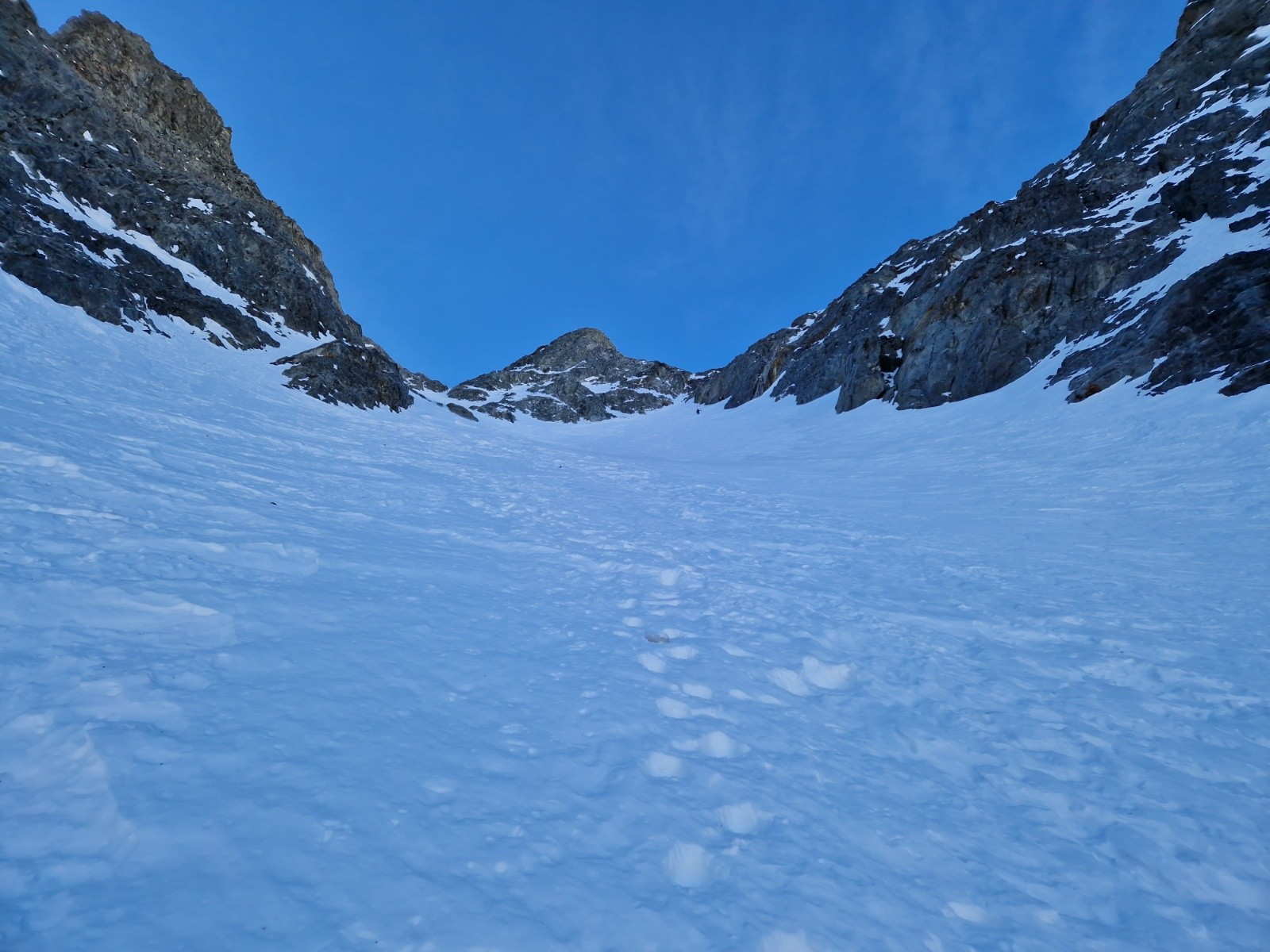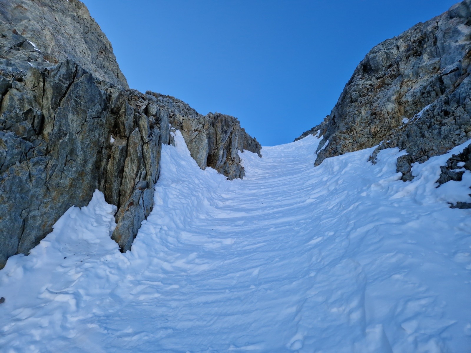 Quelques virages sur les plaques dures et ventées puis le corridor que je descends en dérapage.