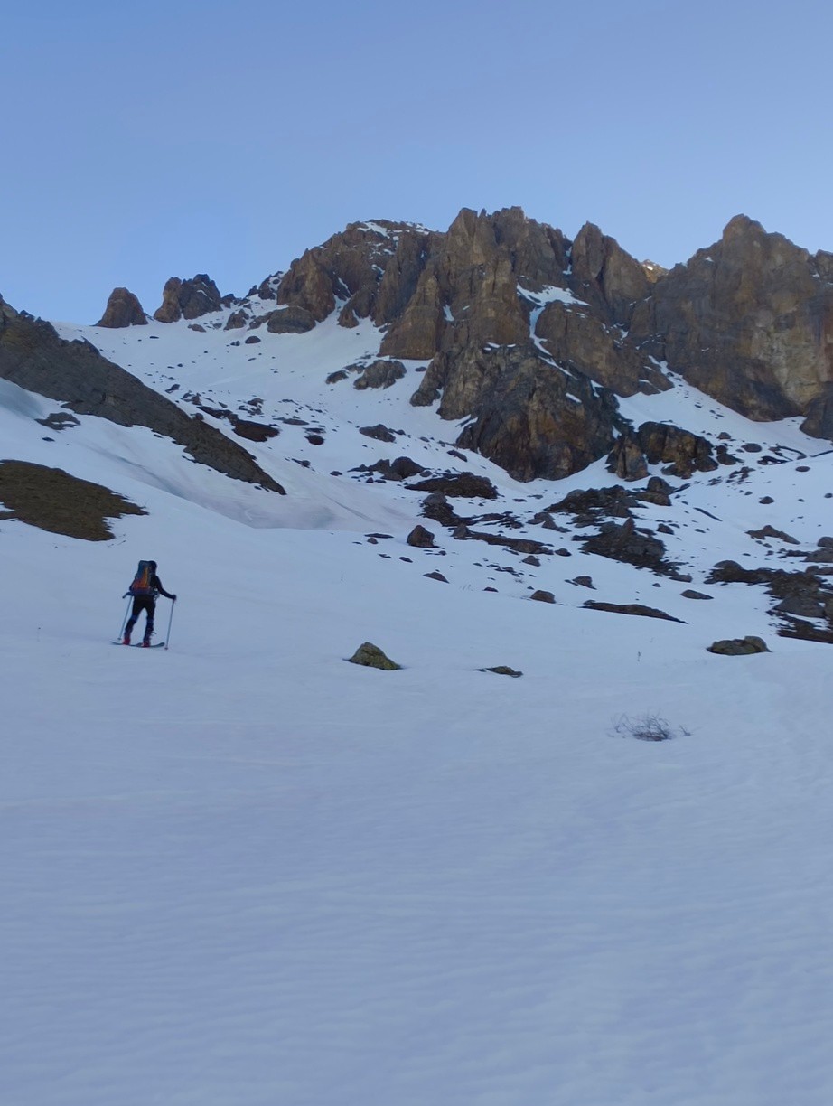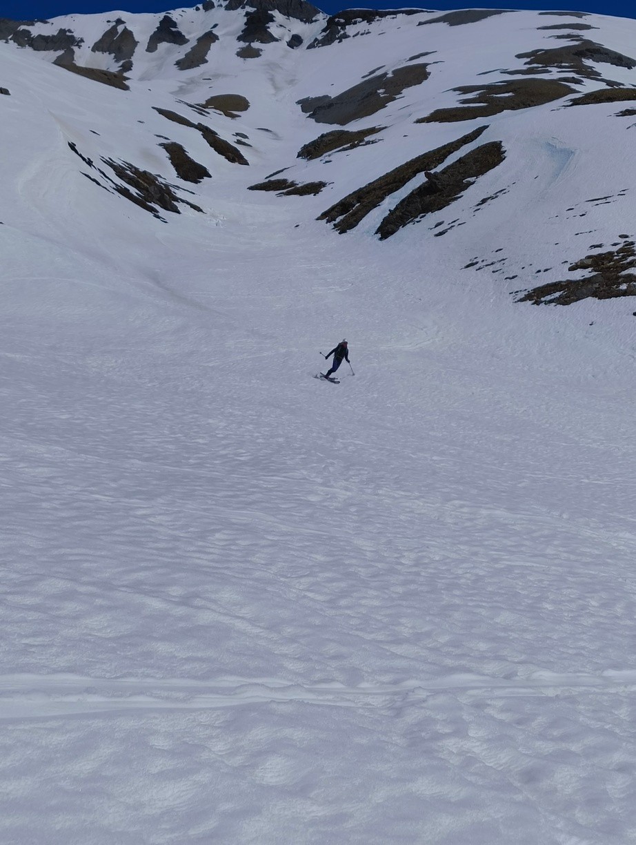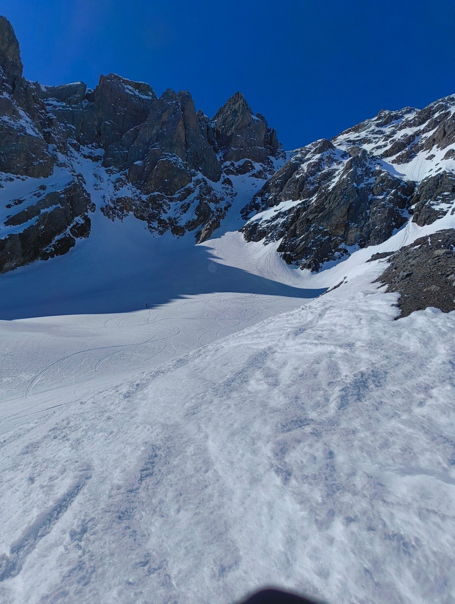 On part pas avec un optimisme de malades étant donné le peu de neige dans le 05 (pour une fois que le 38 est mieux servi). Mais bon le départ étant à 2000, on est vite rassuré. Enfin rassuré c'est vite dit quand on a l’acclimatation d'un Jordan Bardella qui s'apprête à faire son débat du 2ème tour avec Méluche. Couteaux puis crampons piolets sont obligatoires. Arrivés à l'entrée du couloir on déchante : pas assez de neige (d'où le jeu de mot débile du titre de la sortie) et en plus, elle ne semble pas très skiante. L'oeil de lynx d'Olivier détecte un passage par une traversée à gauche. On skie ensuite 100m assez raides dans une neige un peu dure mais revenue suffisamment. On plonge ensuite dans le couloir bien à l'ombre en poudre tassée qui permet de skier en confiance. A la sortie du couloir, on n'aura plus que de la neige excellente. C'est pas que j'aime m'identifier à Jordan Bardella mais mon aisance dans le débat avec les altitudes au-dessus de 2500 m ne s'est pas améliorée avec la fatigue. Heureusement la redescente depuis le col du Clot Julien est également exceptionnelle. Je n'ai pas mis "excellent" pour les conditions de neige car du sommet jusqu'à la sortie du couloir la neige n'était pas toujours facile.