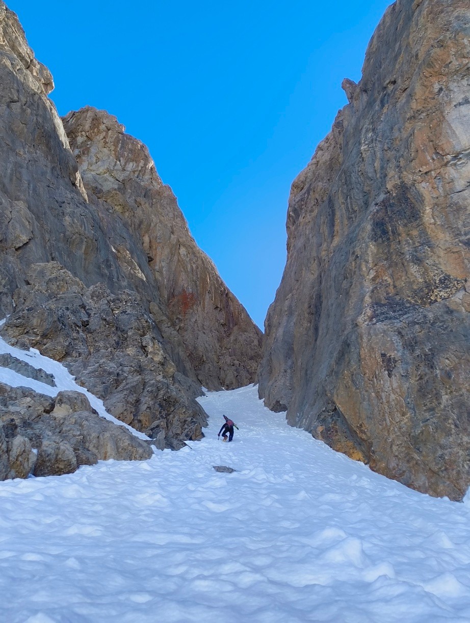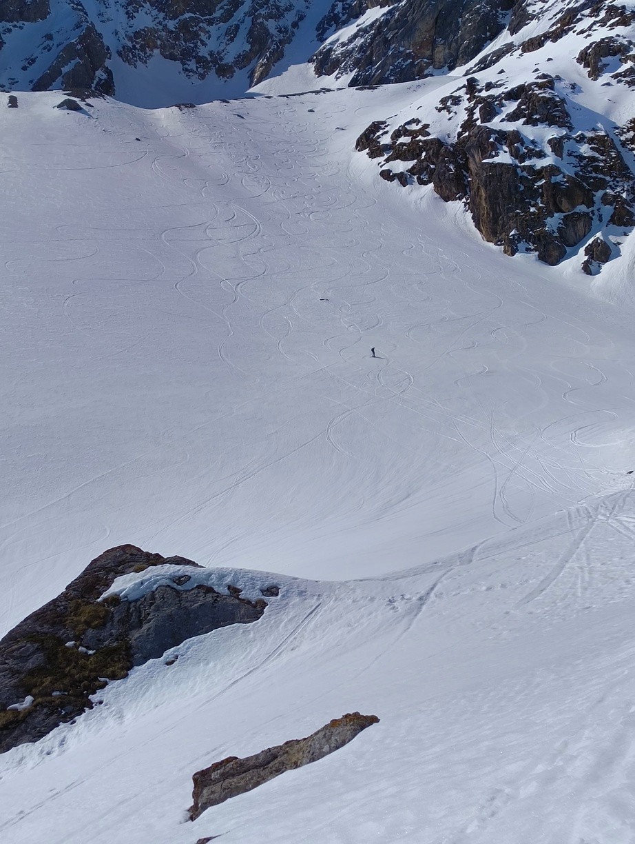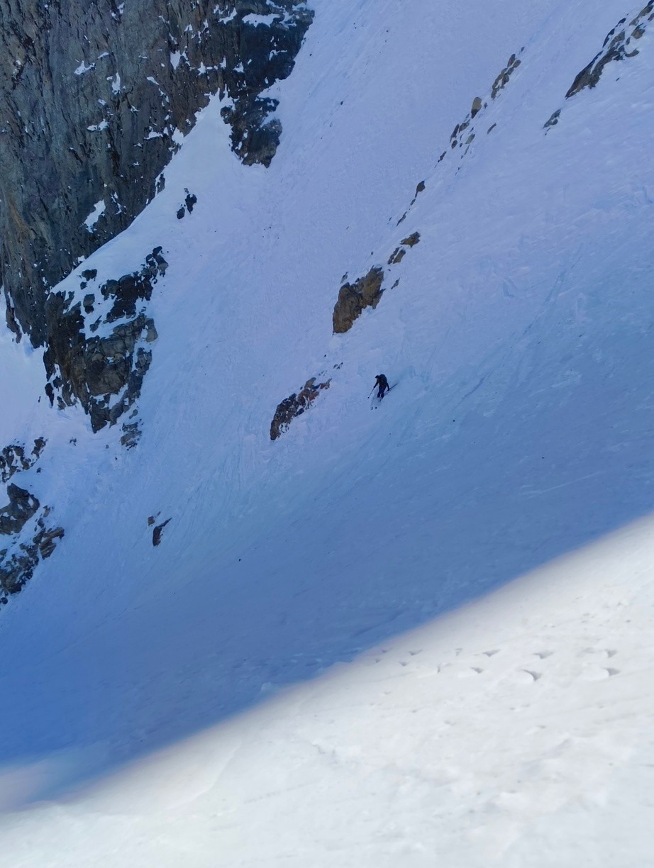 On part pas avec un optimisme de malades étant donné le peu de neige dans le 05 (pour une fois que le 38 est mieux servi). Mais bon le départ étant à 2000, on est vite rassuré. Enfin rassuré c'est vite dit quand on a l’acclimatation d'un Jordan Bardella qui s'apprête à faire son débat du 2ème tour avec Méluche. Couteaux puis crampons piolets sont obligatoires. Arrivés à l'entrée du couloir on déchante : pas assez de neige (d'où le jeu de mot débile du titre de la sortie) et en plus, elle ne semble pas très skiante. L'oeil de lynx d'Olivier détecte un passage par une traversée à gauche. On skie ensuite 100m assez raides dans une neige un peu dure mais revenue suffisamment. On plonge ensuite dans le couloir bien à l'ombre en poudre tassée qui permet de skier en confiance. A la sortie du couloir, on n'aura plus que de la neige excellente. C'est pas que j'aime m'identifier à Jordan Bardella mais mon aisance dans le débat avec les altitudes au-dessus de 2500 m ne s'est pas améliorée avec la fatigue. Heureusement la redescente depuis le col du Clot Julien est également exceptionnelle. Je n'ai pas mis "excellent" pour les conditions de neige car du sommet jusqu'à la sortie du couloir la neige n'était pas toujours facile.