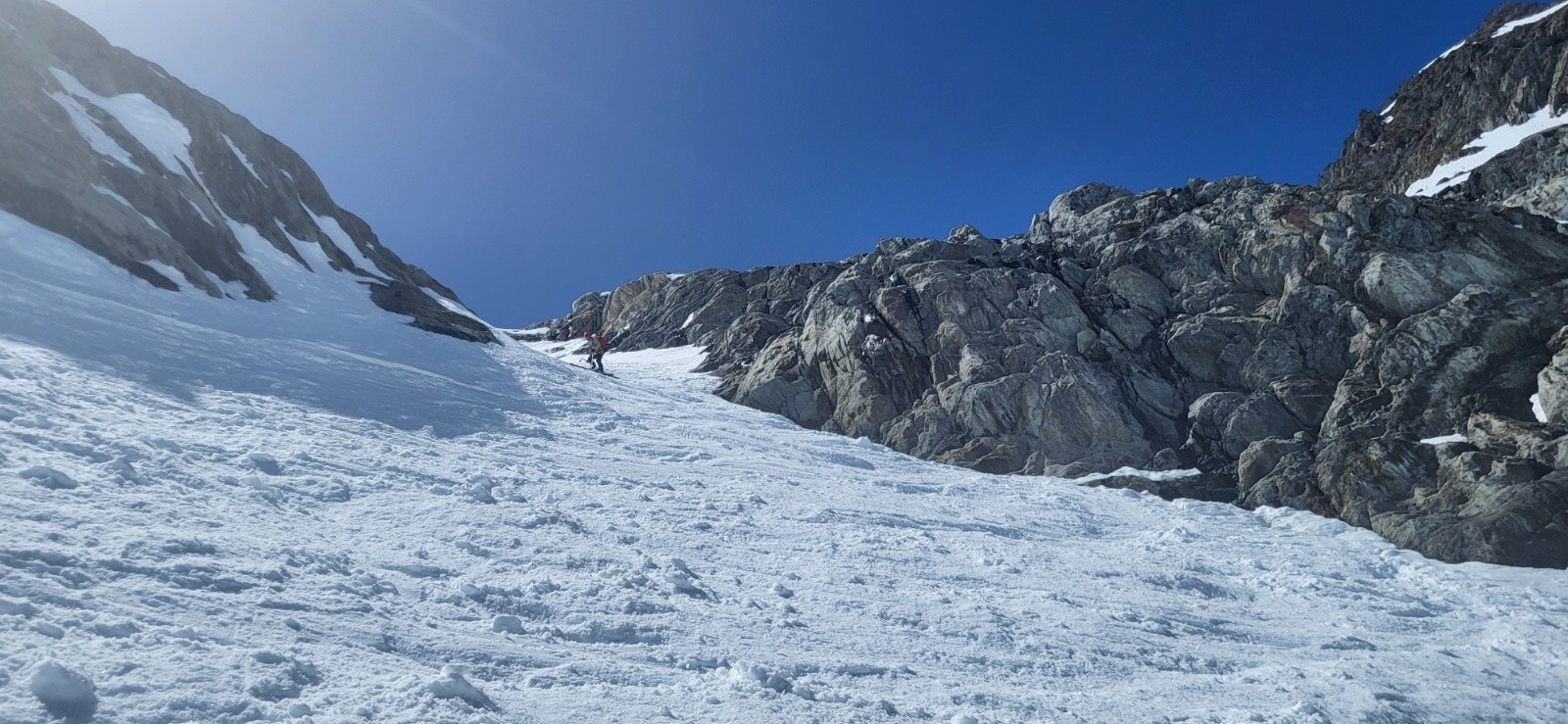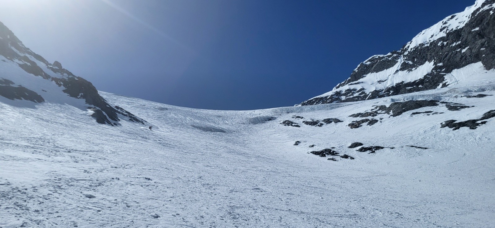 Descente : bonne neige sur le haut (voir même poudreuse), puis à partir de 2700m neige ayant bien chauffée au soleil. Attention dans le goulet à 2000m (voir ci-dessous).