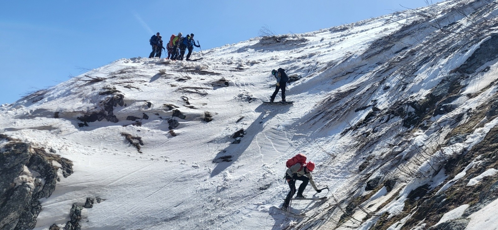 Le meilleur pour la fin : le passage du dernier goulet (ravagé par une avalanche) à 2000m en mode "chacun sa technique" : en ski avec déchaussage au milieu, en ski piolet, en crampons, etc