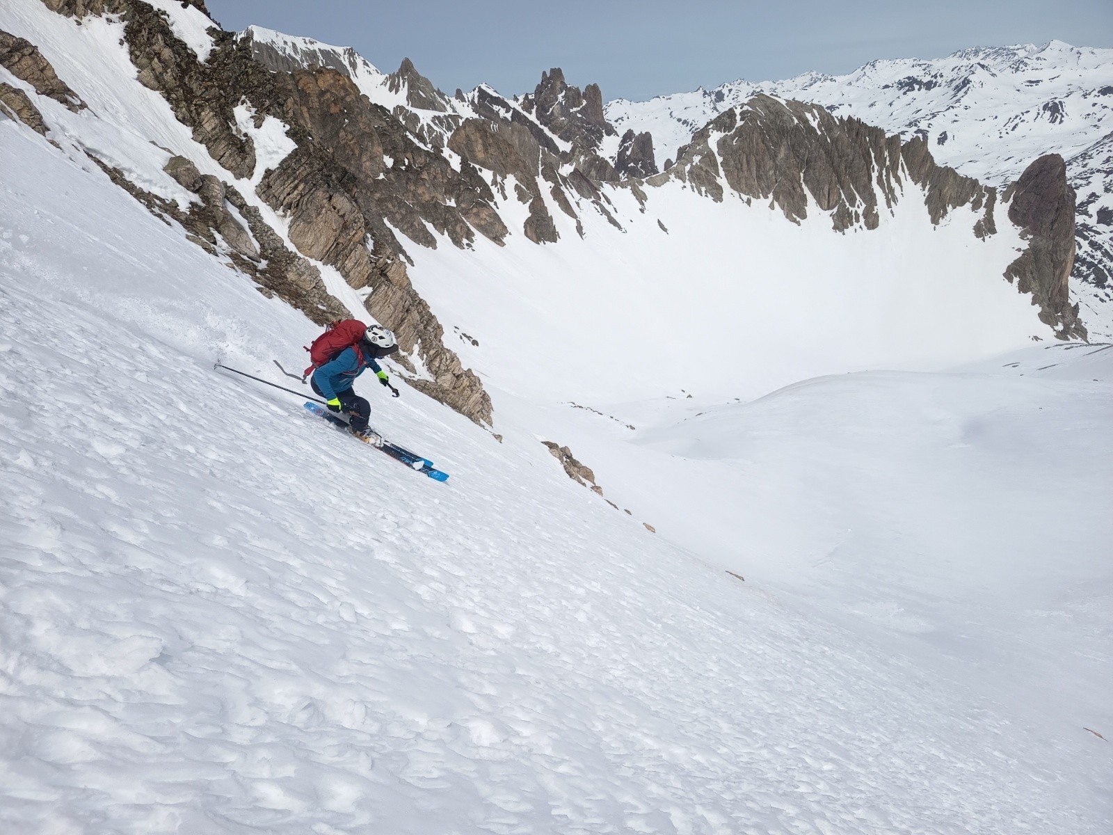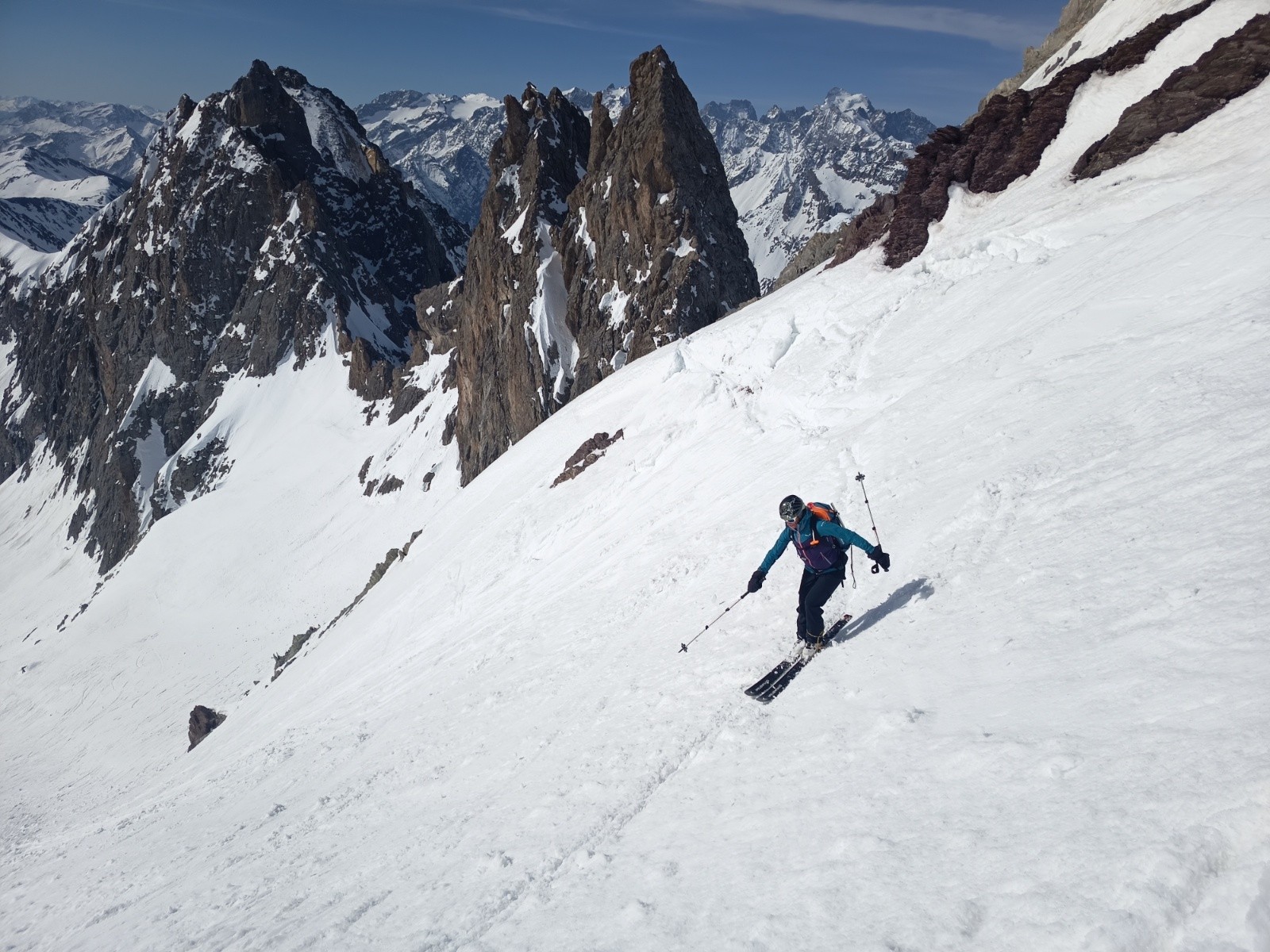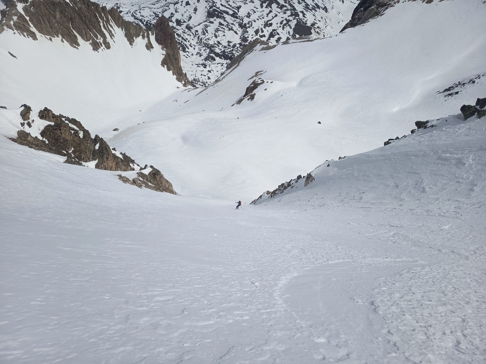 Le couloir est en bonne condition de neige froide, ça déroule avec la banane jusqu'en bas.