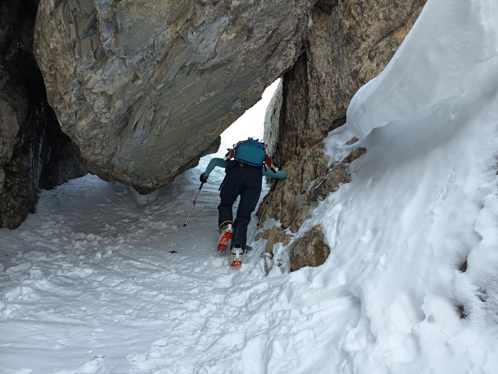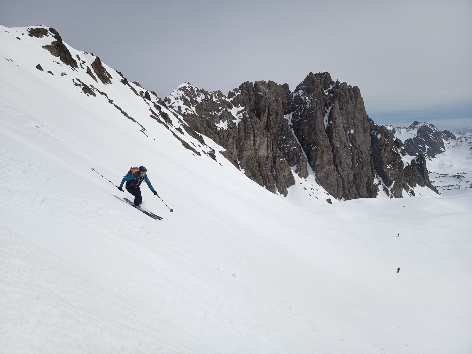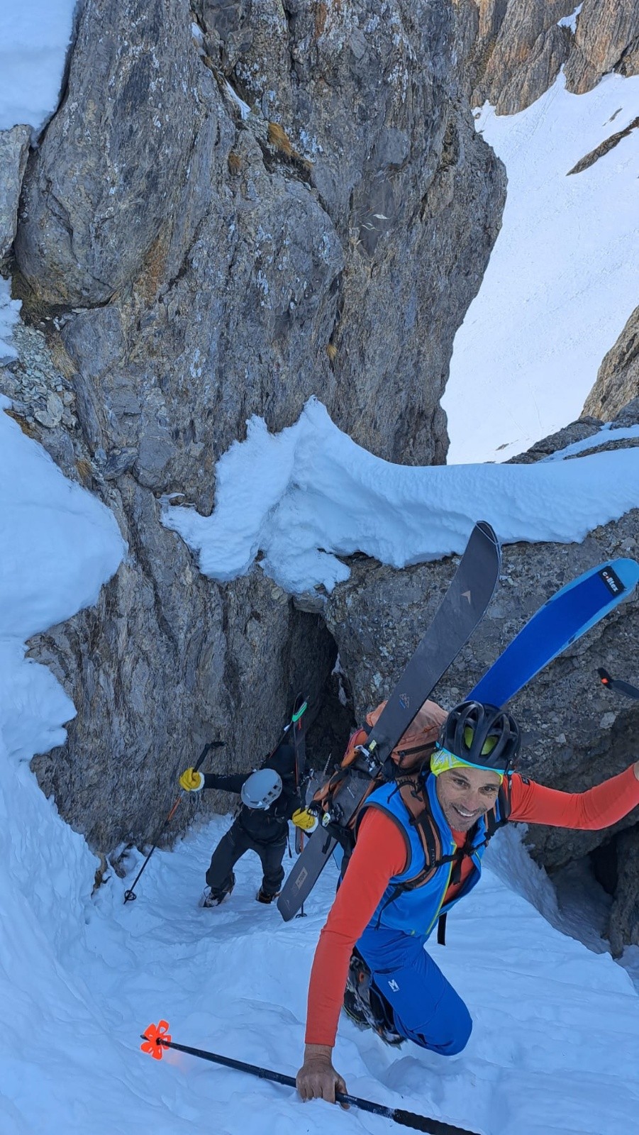 Le couloir est en bonne condition de neige froide, ça déroule avec la banane jusqu'en bas.