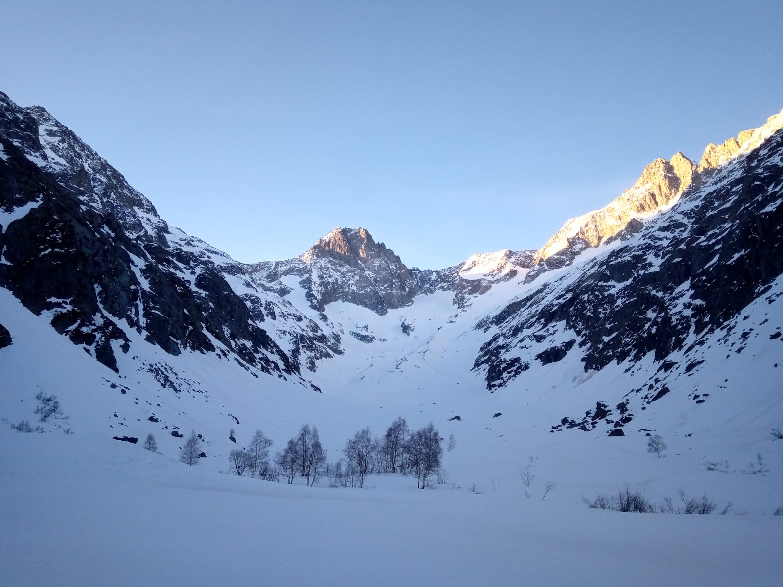 Conditions pour le ski : Couloir : transfo aérée avec beaucoup de reliefs, petit ressaut deneigé en haut ; Pentes en-dessous : bonne moquette, un peu de relief ; Vallon : lisse, devenant collant à 13h30, forêt en lourdasse