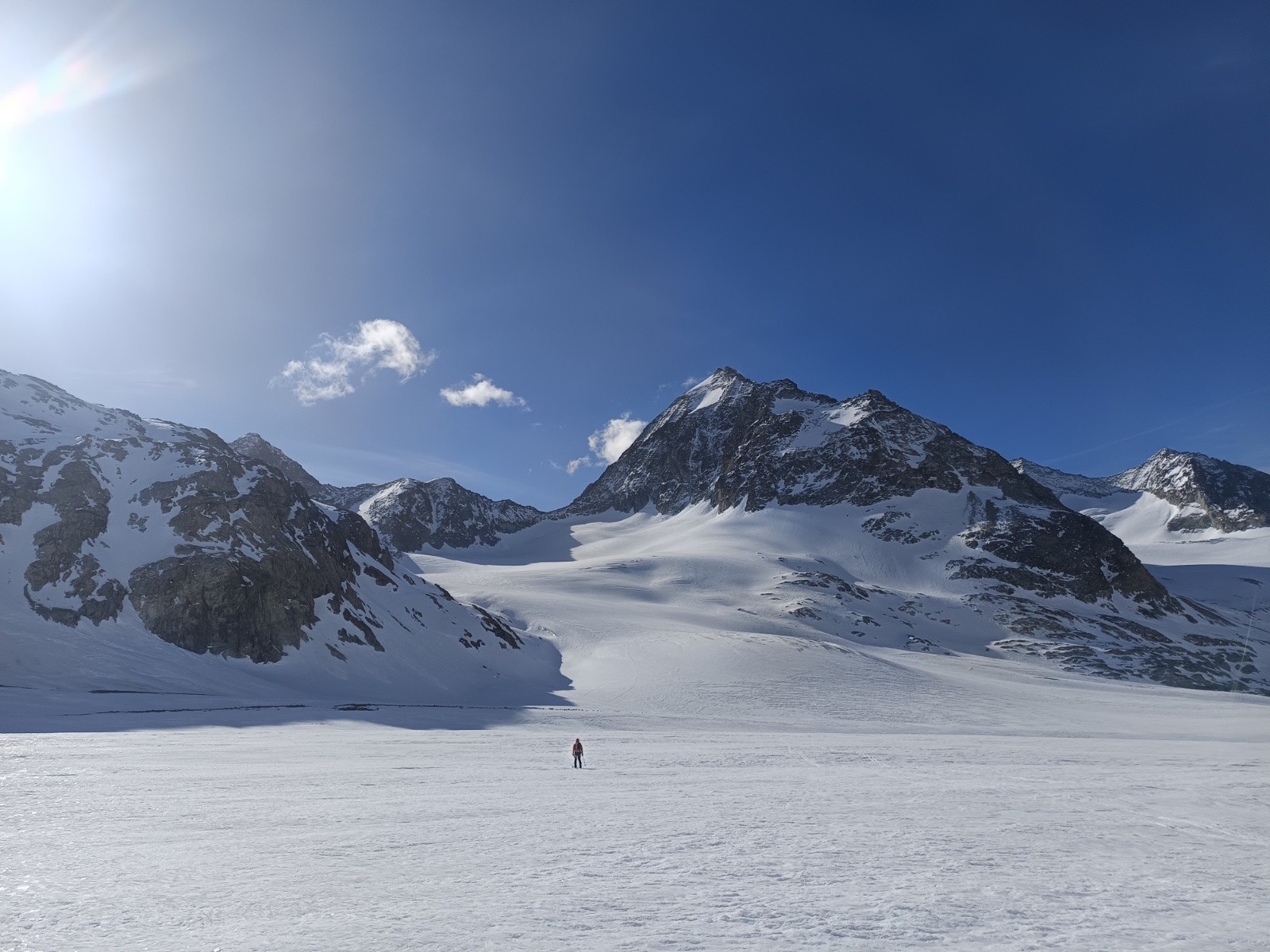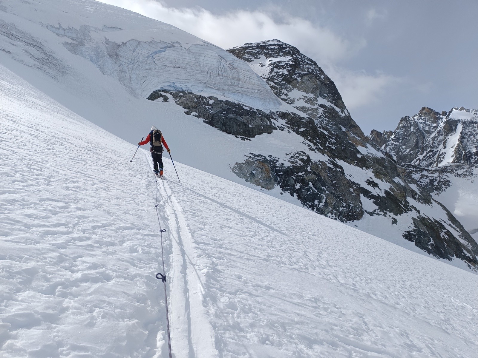 J4 : Départ à 7h15 pour le plateau du Couloir. Nous partons couteaux aux skis jusqu'à mi-pente environ. Nous chaussons ensuite les crampons pour la deuxième moitié de la pente. Nous atteignons le sommet à 09h15. Ensuite, belle descente sur le glacier du Mont Durand (sur la moraine centrale pour éviter les jolis trous). Nous remontons pour passer l'arête du Mont Avril puis s'offre à nous une belle descente moquette sur les pentes de l'ancien glacier de Fenêtre avant de remonter au refuge Chanrion, où l'on arrive vers 12h30. Refuge très moderne (refait en 2021) tenu par de jeunes gardiens très accueillants.