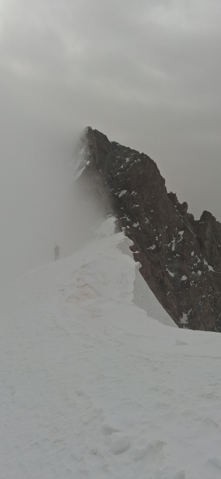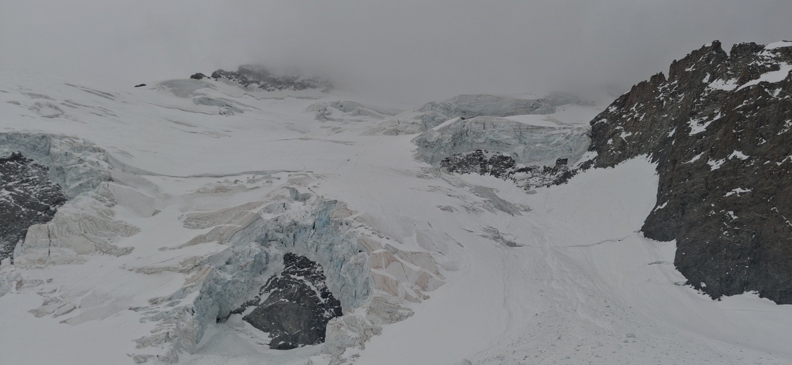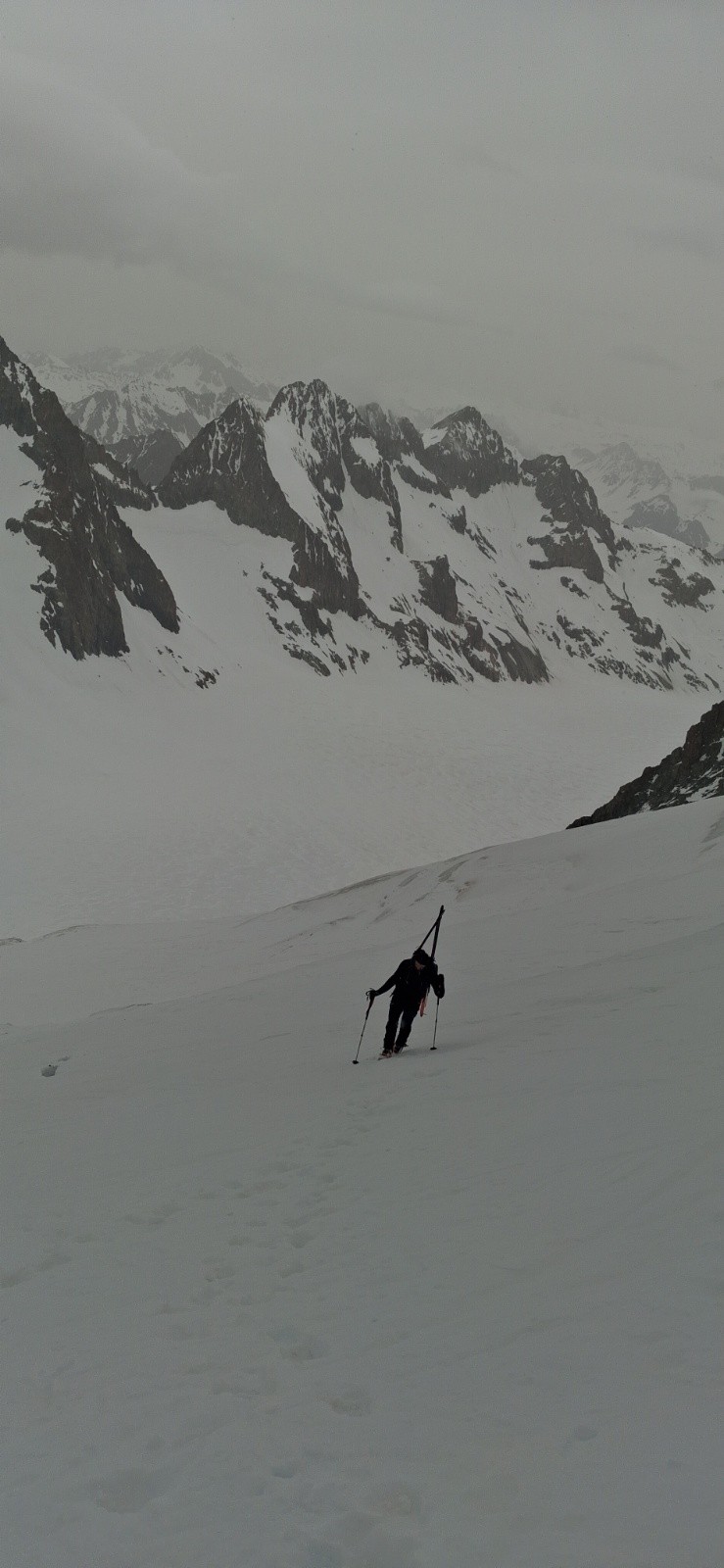 Conditions pour le ski : moyenne, sur le dome de la neige ventée, sur le glacier en rive gauche, de la neige non décaillée et en contrebas elle n’avais pas regelée faute au nuage.