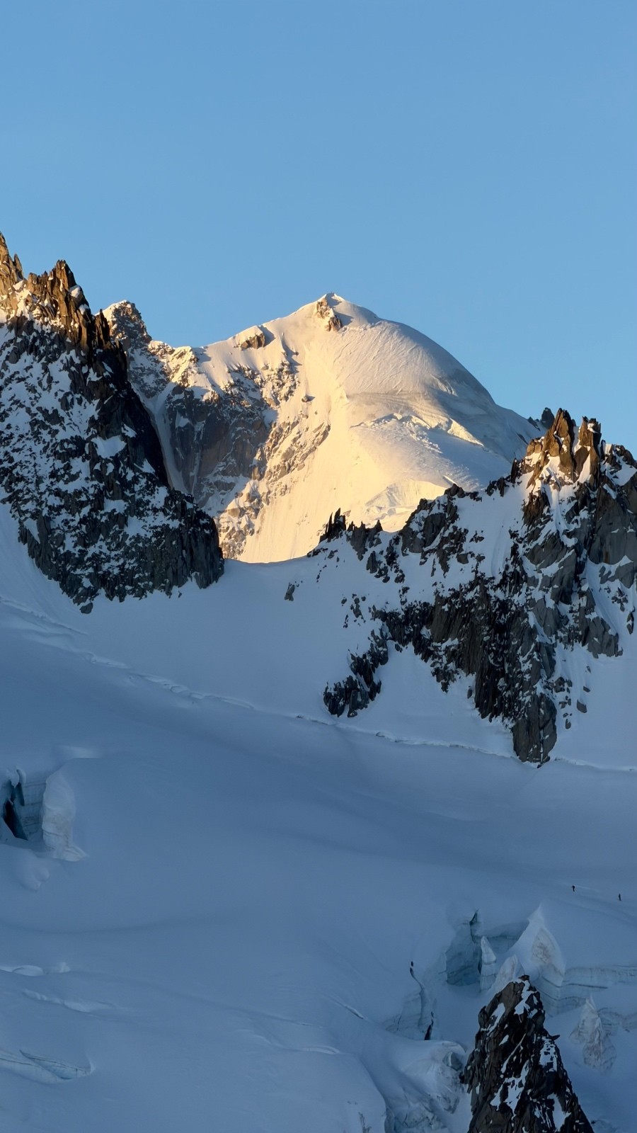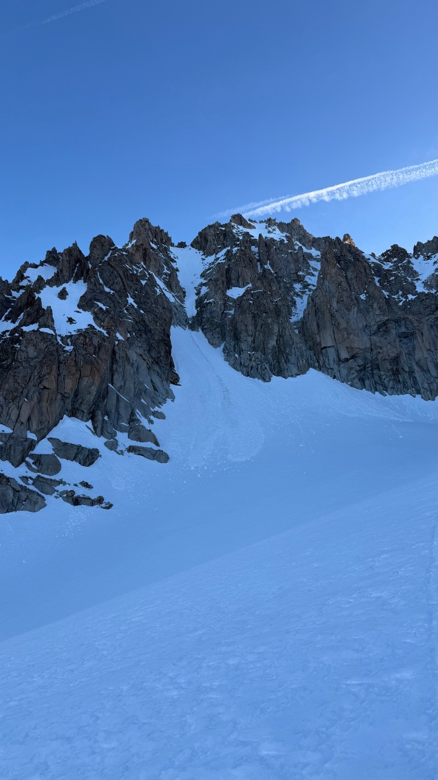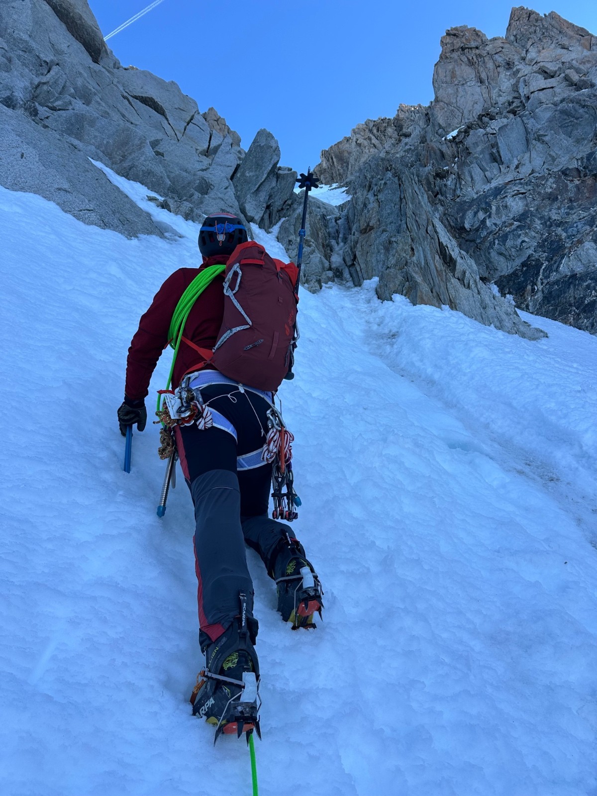 Je passe en tête pour cette première partie + la première partie du ressaut en mixte. Relais sur bécquet au pied, neige dure, sortie en glace noire, bien protégeable sur friends (un coinceur câblé est présent en +), relais sur béquet 20m au-dessus. Je fais monter Cédric, qui prend la suite sur 20m de nouveau, relais sur friends, avec même le plaisir de poser une broche. Il me fait monter. Puis c'est parti pour la deuxième partie du couloir en neige dure mais pas trop, corde tendue et courte, Cédric en tête. On monte bien, safe et efficaces. Sommet du couloir vers 9H15. Superbe ambiance, météo splendide, conditions parfaires.
