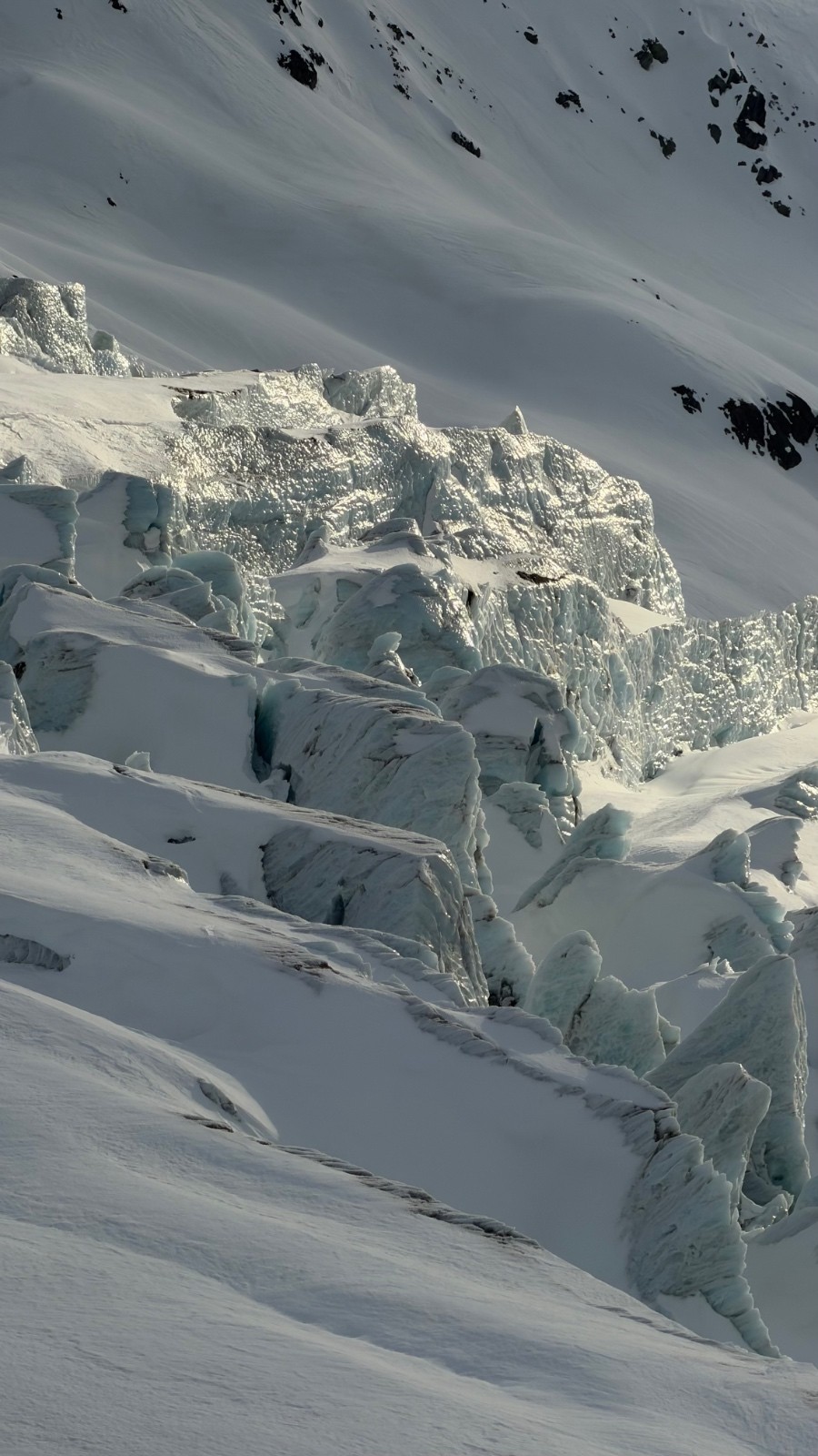 N'ayant jamais essayé de skier encordés, on tente, c'est délicat et finalement après 200m, je remets la corde sur le sac. Descente topissime entre 3100 et 2500m, moquette poils longs sur fond dur et lisse, un régal ! On passe sous le refuge, rive droite, puis la neige devient plus molle voire casse-gueule par endroits. Concentrés à ne pas se la mettre, couillons que nous sommes, nous oublions de traverser vers la rive gauche et descendons trop bas. Le temps qu'on s'aperçoive de notre erreur, on hésite à poursuivre en passant par l'ancien chemin d'été, mais pas envie de refaire comme la veille. On repeaute donc, et c'est parti pour 150 D+ pour aller chercher le croisement vers la rive gauche. Passages assez raides (200m à 40°) mais bien damés, donc pas pire, on y va tranquilles. Tout le bas passe très bien et termine dans un boarder invraisemblable mais nickel jusqu'au village du Tour. Retour à la voiture vers 15H00.