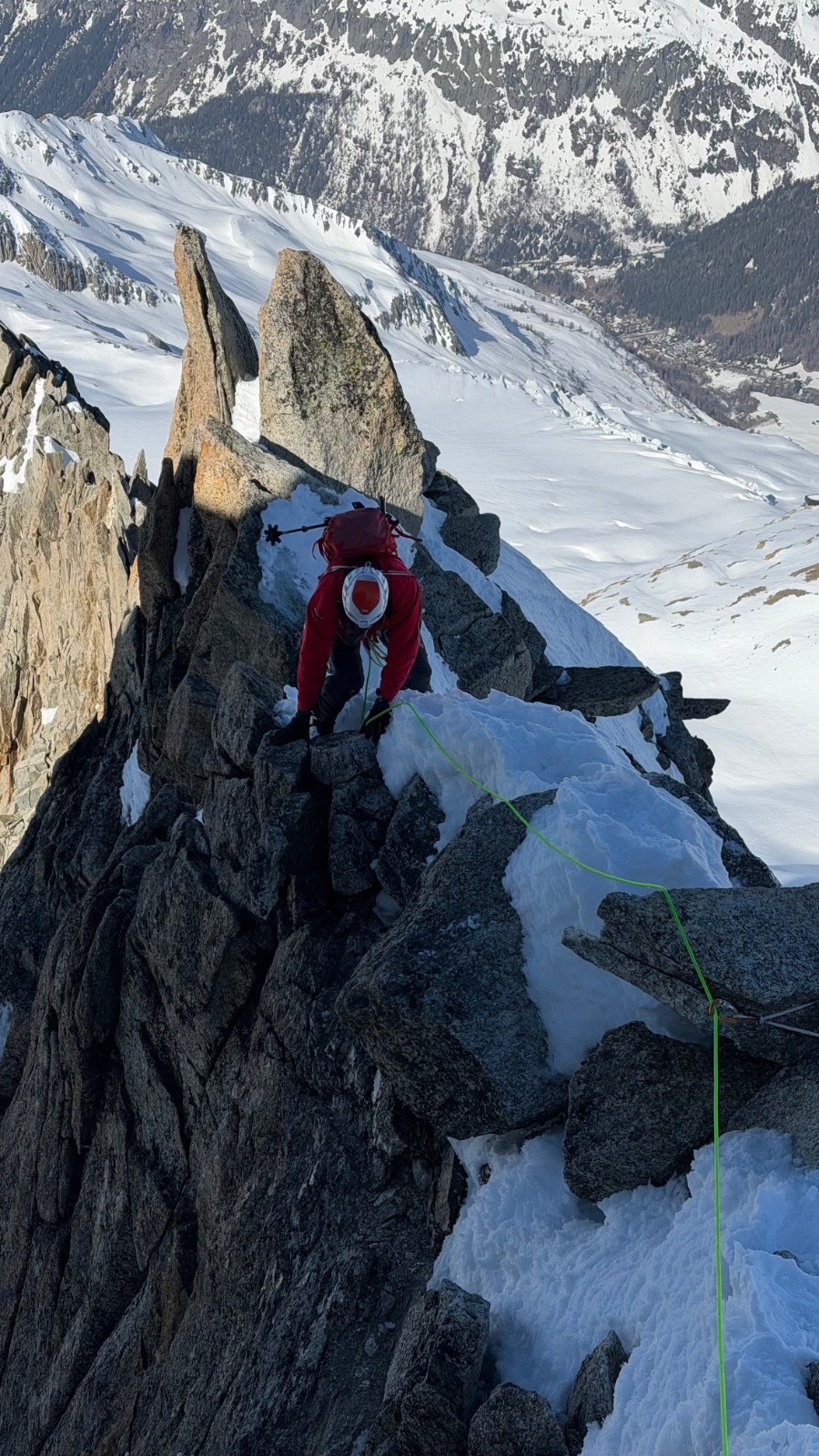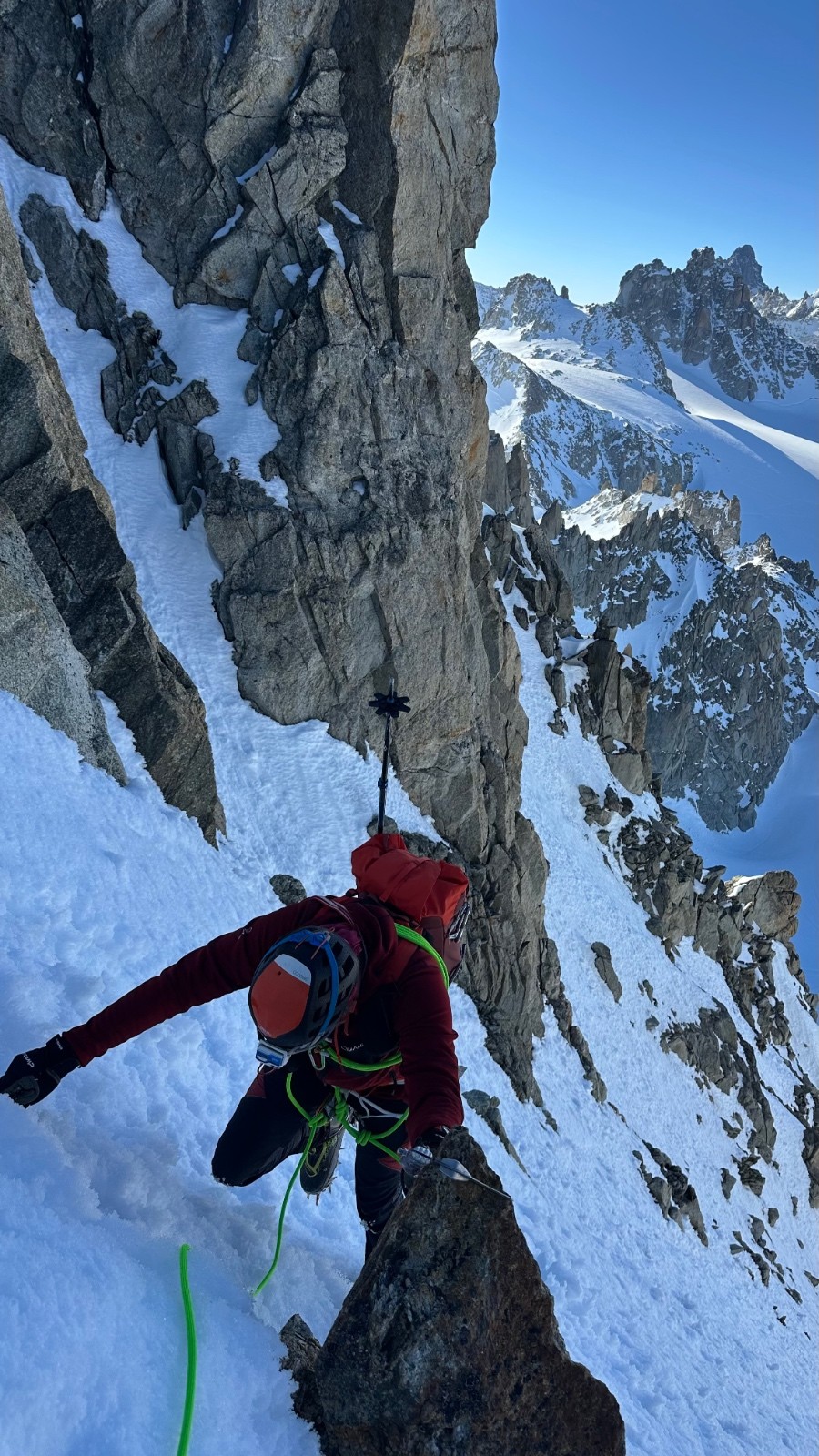 J'attaque l'arête sommitale sur un superbe granit, rien de difficile, même si je ne suis jamais très à l'aise sur ce genre de terrain, protection sur sangles / bécquets, pose de friends pour que j'apprenne à les poser correctement (mais ça passe sans friends évidemment, juste avec les bécquets), progression corde tendue. Puis pour le dernier tiers, Cédric prend la tête, bien à son aise sur ces arêtes. Lorsqu'il arrive au sommet à 10H30, il croise un gars monté en solo par la VN, venant de je ne sais où. Nous aurons donc été absolument seuls à faire ce couloir aujourd'hui, et nous sommes seuls au sommet, rare !