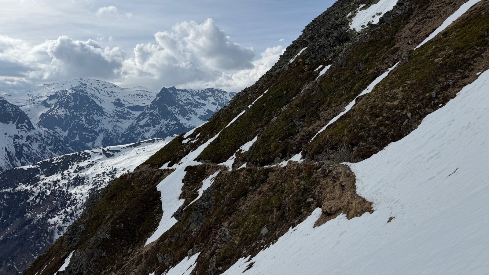JOUR 1 : montée au refuge Albert 1er par le "nouveau" chemin d'été (Charamillon puis sous le Bec du Picheu). Traversée vraiment expo, chute interdite, skis sur le dos, alternance de passages secs et neige épaisse molle de printemps. Clairement à éviter tant que ce n'est pas complètement sec.