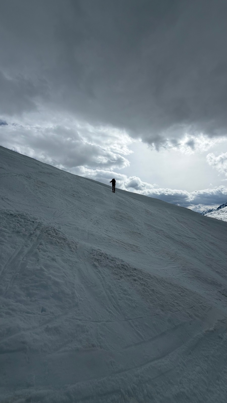 Pour le 1er jour, travaillant tous deux le matin, nous partons du parking du Tour (39€ pour 25h de stationnement... l'arnaque) à 15H15. Nous avons fait le choix de nous soulager avec le télécabine de Charamillon (18€ / personne pour 400m D+, re-arnaque...), rapidement le temps se couvre ce qui est très bien pour nous éviter de monter sous un gros cagnard. La traversée jusqu'à l'arête sous le Bec du Picheu se passe bien, nous apercevons deux personnes au loin sur l'arête, que nous recroiserons plus tard. J'enlèverai quand même les skis dans la pente juste avant car neige assez dure non décaillée et chute délicate si jamais. Skis sur le dos, nous entamons la traversée délicate de ce premier jour. J'avais dit à Cédric qu'il était probable que le plus plus délicat soit ce passage, et effectivement. Les condis oscillent entre chemin sec d'été et gros gros névés de neige lourde et molle (à cette heure avec ces températures). Il y a 2 passages vraiment très expos, chute interdite, et on est contents de ne pas être limites en termes de niveau pour ces passages qui relèvent plus de l'alpi expo que de la rando... C'est ici que nous croiserons et doublerons 2 jeunes anglais, skis horizontaux sur le sac (!), allant faire une goulotte au Chardonnet le lendemain. Ils semblent être très contents de nous voir car très inquiets de cette traversée. Nous ne sommes pourtant pas très rapides, mais eux sont lents, vraiment lents. Arrivés au refuge, plus tard dans la soirée, les Anglais seront bien arrivés, mais j'ai quand même insisté auprès du gardien du refuge pour lui dire que, à mon avis, ils n'avaient pas le niveau pour une goulotte au Chardonnet...Pour une prochaine fois, prendre son courage à deux mains et faire la montée en rive gauche du glacier depuis le bas (mais les Z doivent être vraiment pénibles à faire dans la partie raide au milieu, pente à 40° sur 200m...) ? Ou alors via Argentière et le Col du Passon comme recommandé sur le site du refuge ?