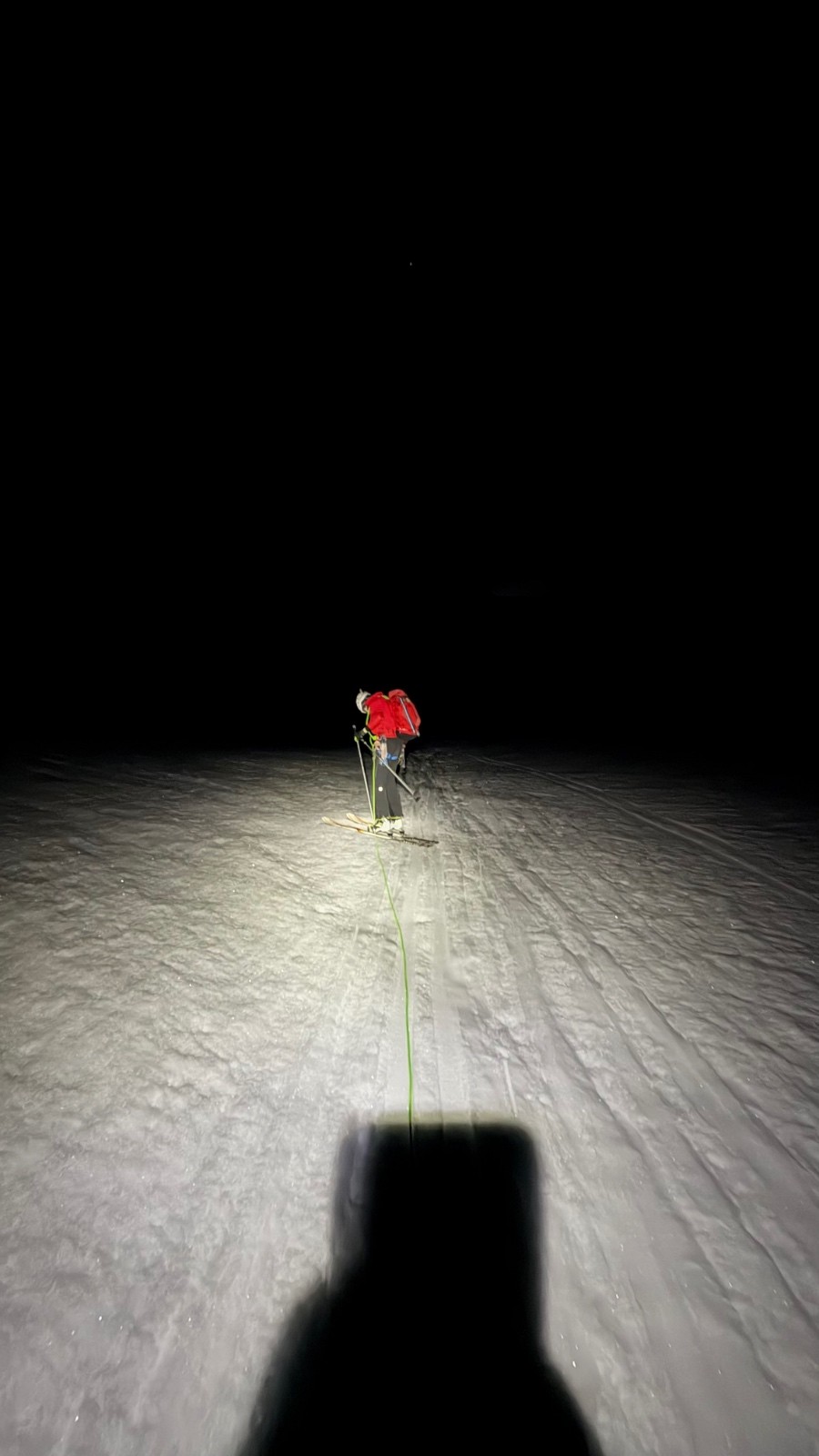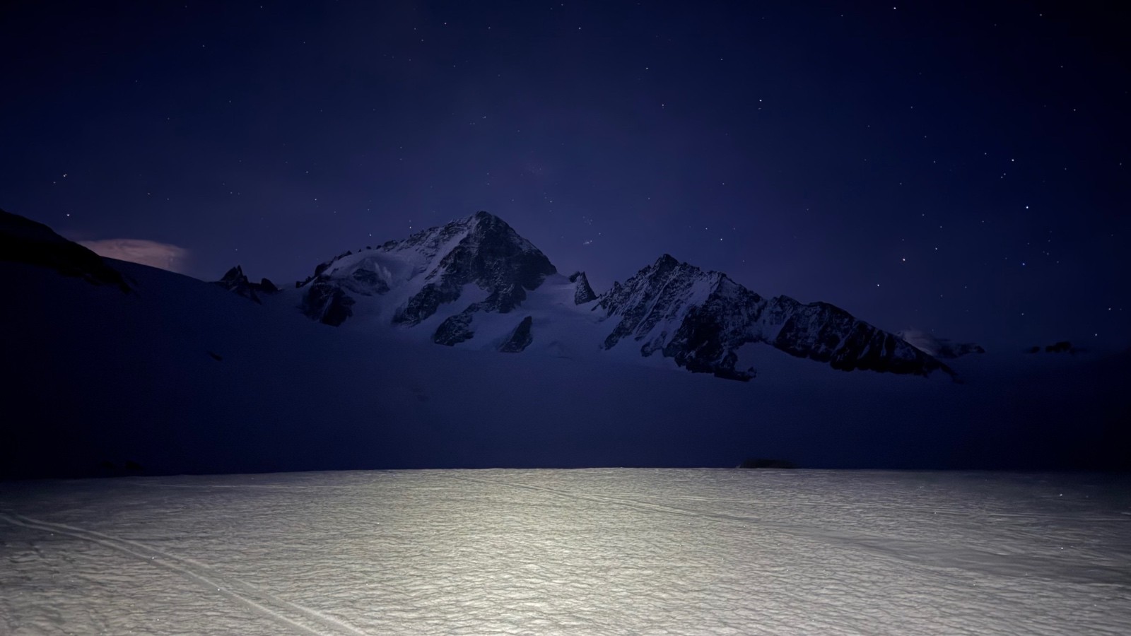 Deuxième jour, réveil à 4H15, déjeuner tranquille, seuls, avec muesli, corn flakes, cake, pain complet, beurre, confiture, miel, oranges fraîches, thé, café, etc. Mieux que dans certains hôtels ! On s'équipe tranquillement dans la pièce du bas, crampons aux pieds, skis sur le sac, pour descendre les 50m D- menant sur le glacier en neige béton. Départ à 5H15. Une fois sur le glacier complètement bouché, nous mettons les skis, nous nous encordons à 10m et c'est parti, il est 5H30. Nous avons l'impression d'être les premiers, et ce sera vrai. Neige crissante avec un bon grip pour les peaux, c'est parfait. Cédric est devant, nous montons tranquillement jusque vers le Signal Reilly. Le jour se lève, les étoiles quittent le ciel, c'est magnifique. Une dernière petite traversée puis nous laissons les skis un peu au-dessus de la voie de descente tout à l'heure, sous le Col supérieur du Tour. Nous atteignons la base du couloir de la Table à 7H30, le temps de sortir les piolets, de s'encorder court, on attaque le couloir à 7H45.