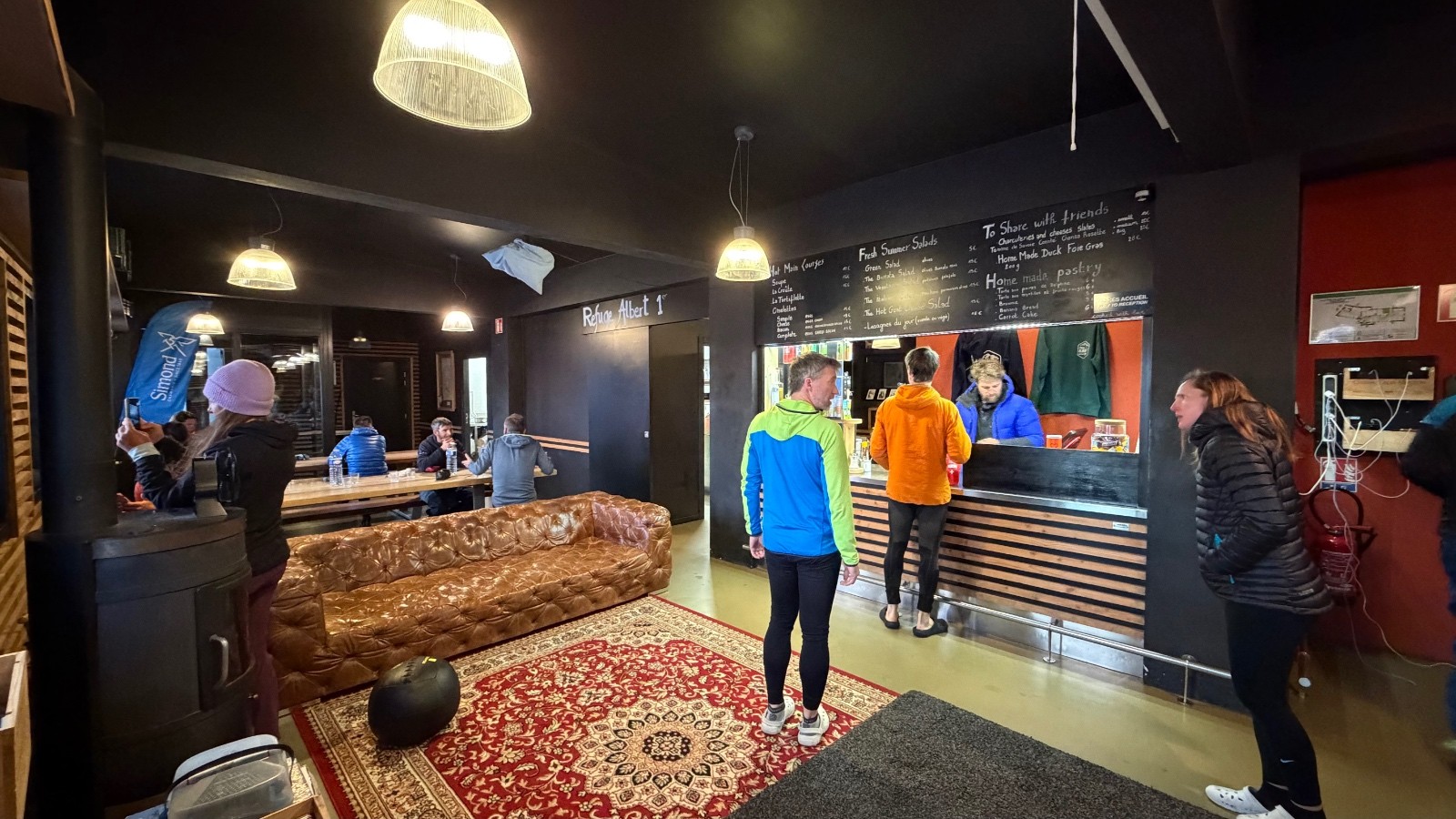 Pour le refuge, n'étant pas revenu ici depuis des lustres, j'ai été très très agréablement surpris de la rénovation et du niveau d'équipement ! Une salle nous accueille en bas pour retirer tout le matos tranquillement, assis. Juste à côté une pièce pour faire sécher les affaires (gros ventilo qui se déclenche plus tard pour la nuit), montée intérieure, toilettes tout en bas et au milieu (fermée car problème temporaire d'eau courante), puis la grande pièce principale, avec de belles tables, un énorme canapé en cuir, des poufs, une vraie bibliothèque montagnarde digne de ce nom, et même des poutres d'entraînement ! Personnel aux petits soins, c'est très très agréable. Matelas de bonne qualité, oreiller moins, et couette bien appréciable en lieu et place des couvertures qui piquent et pleines de poussière ! Pour le lendemain matin, c'est un petit-déjeuner buffet, donc on se lève quand on veut, terminé le temps du réveil par le gardien criant "Pour le Couloir de la Taaable, il est 4H00 !", nous extirpant d'une nuit de peu de sommeil...