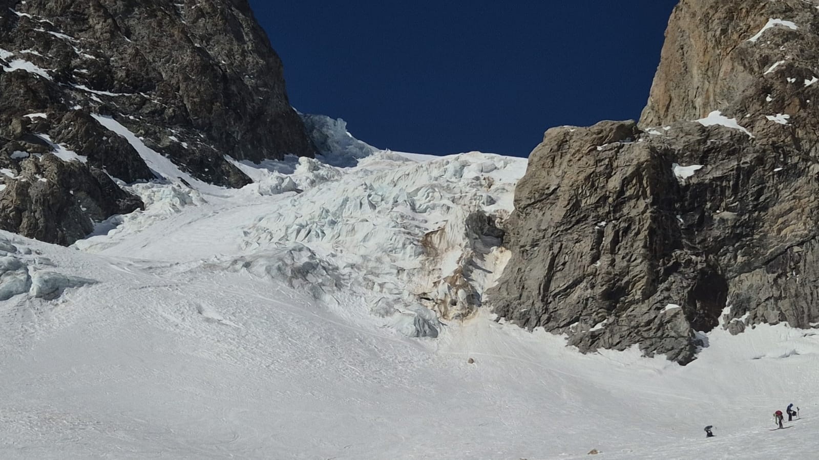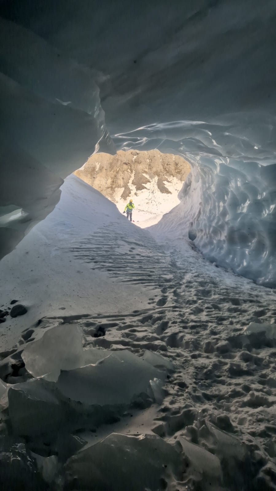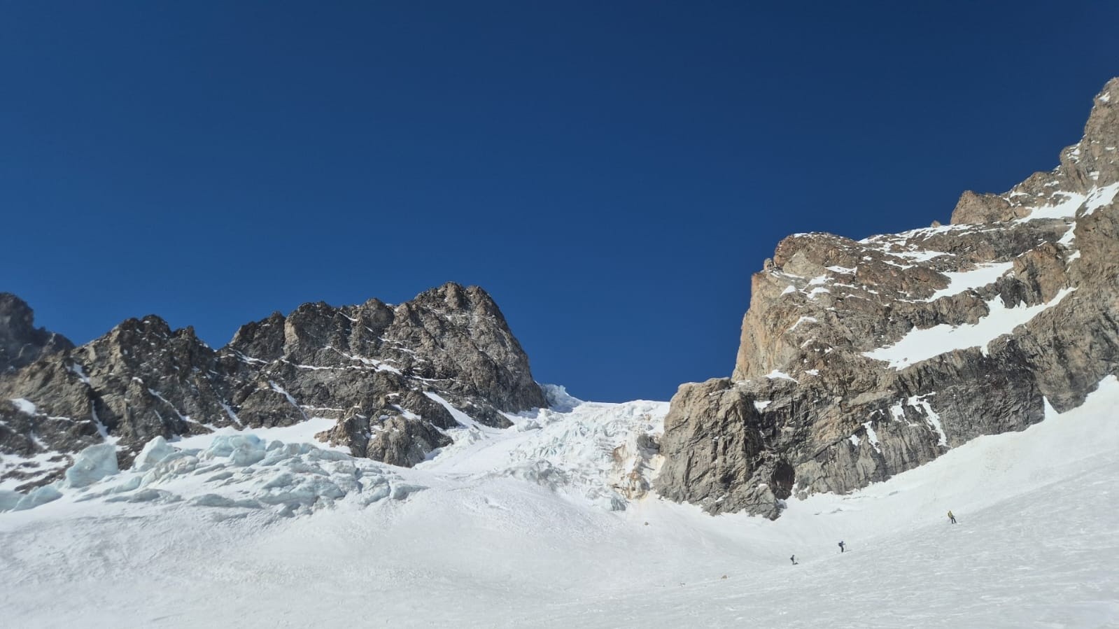 - Vers 9h, entrée dans le couloir sous le refuge très dure et bien raide, avec neige traffoleé ; chute interdite dans ces conditions. On choisit donc de commencer en crampons piolet et on chausse quelques dizaines de mètres plus bas. Tout le haut du glacier est encore très très dur, pas une partie de plaisir mais le cadre est grandiose. Il y a même quelques passages où la glace est présente, ça passe à skis mais méfiance et concentration ! La neige s’assouplit au fur et à mesure qu’on descend jusqu’à devenir un peu lourde. Petite visite dans les grottes du glacier, on remplit les gourdes plus bas. Il reste de la neige pour traverser la Romanche.
