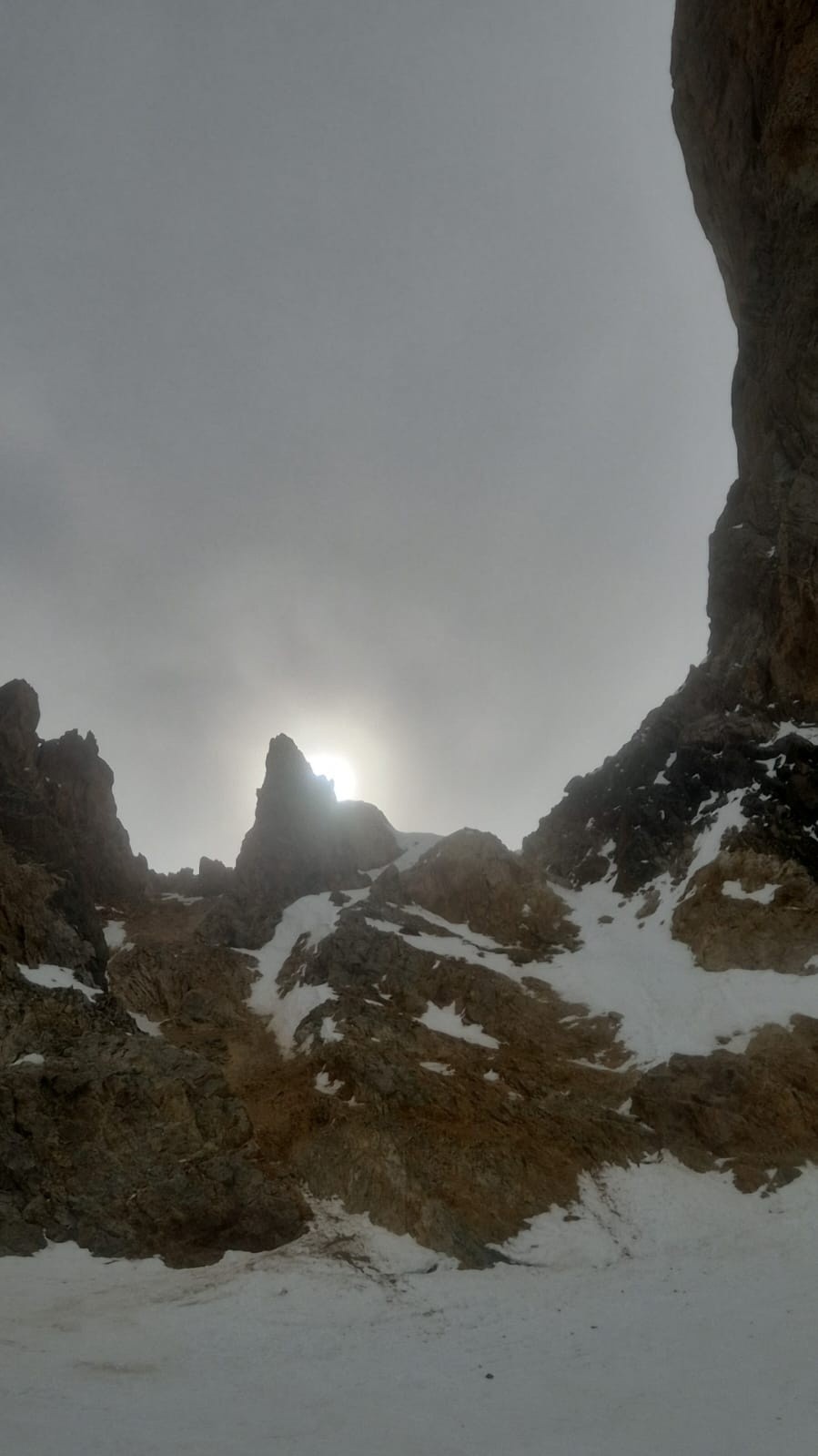- Arrivés en haut on part sur la droite (erreur) en pensant suivre ce que le gardien du refuge nous a dit, mais vraisemblablement ce n’était pas la meilleure option. On descend un couloir peu enneigé puis on tombe sur un rappel. Un peu juste pour nos cordes de 30m il faudra finir sur le bas avec 5m de désescalade dans du mixte ni très dur ni très raide mais pas très confort comme arrivée… On verra depuis le bas qu'il y avait un passage plus logique et simple dans une pente de neige davantage dans le milieu.