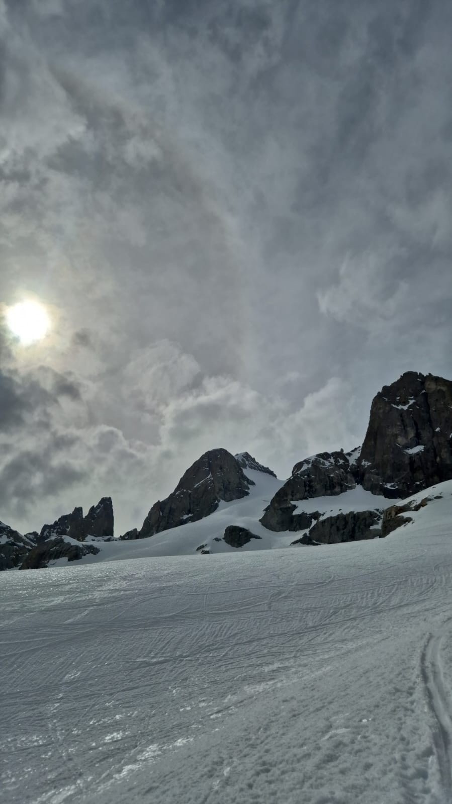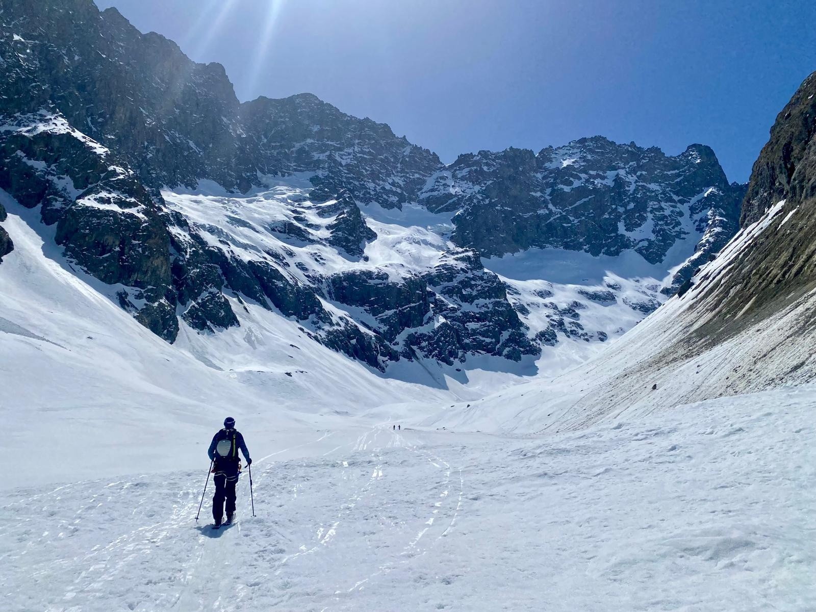 - La descente face Est est bien raide au début et des cailloux sont apparents dans l’étroiture. On fait le choix sage de commencer en crampons jusqu’à passer l’étroiture. Ça brasse bien dans ce couloir Est à cette heure-là - heureusement qu’on descend et qu’on ne monte pas ! La suite de la descente est bien lourde, ça skie mais ce n'est pas très agréable. Quelques passages plus à l’abri du soleil sont meilleurs. On descend jusqu’au fond du vallon ; mais il y avait probablement possibilité de couper bien plus haut ça semblait passer entre les barres.