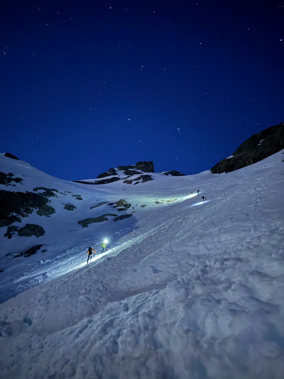 Départ 4h40 aux lumières de nos 6 frontales depuis le Refuge du Pelvoux (2704m). Première difficulté une petite barre rocheuse juste 30m au dessus du refuge. Nous déchaussons pour escalader et nous passer les skis.