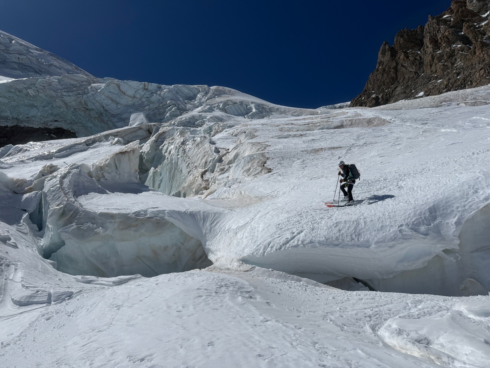 Vers 3130m dernière crevasse : pas possible de l'éviter, elle s'étend sur toute la largeur ! On la saute à ski un par un. Et un par un c'est la chute.