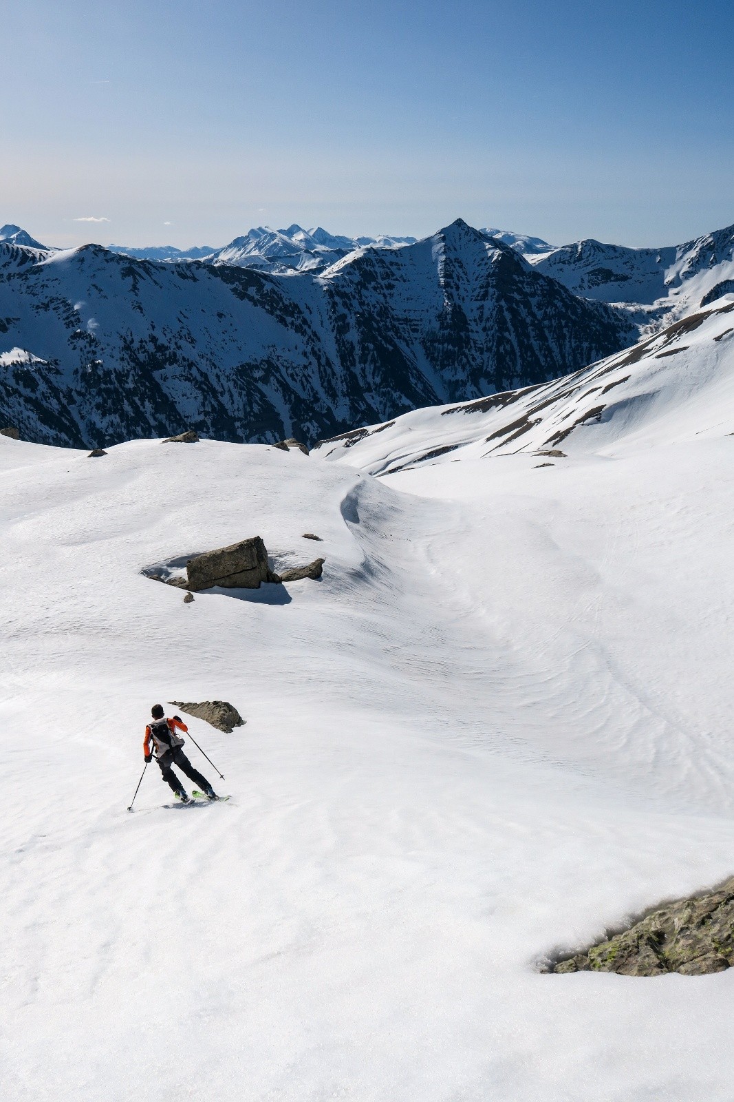Remontée du refuge à la baisse de l'Aiguille : il y a 40 m de dénivelé déneigé où il faut porter, mais tout le reste passe.