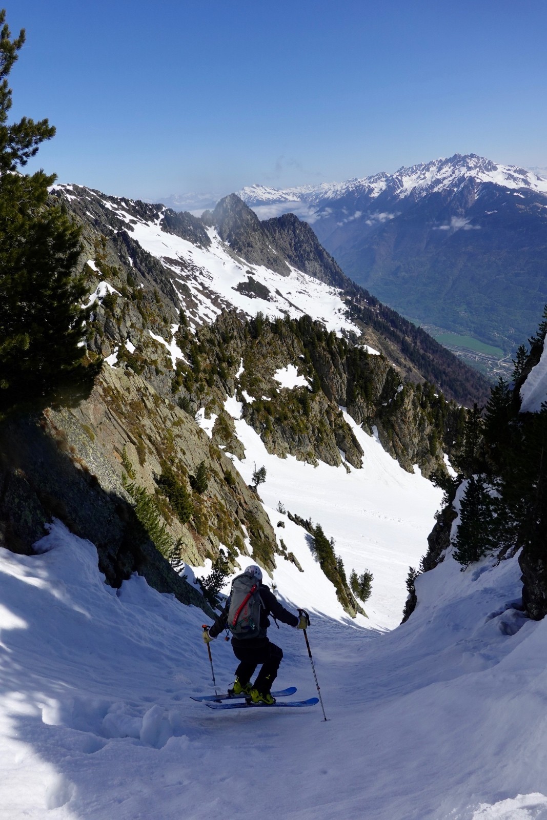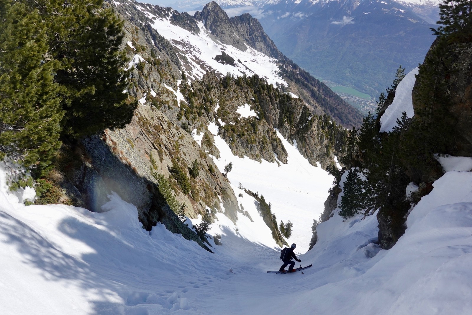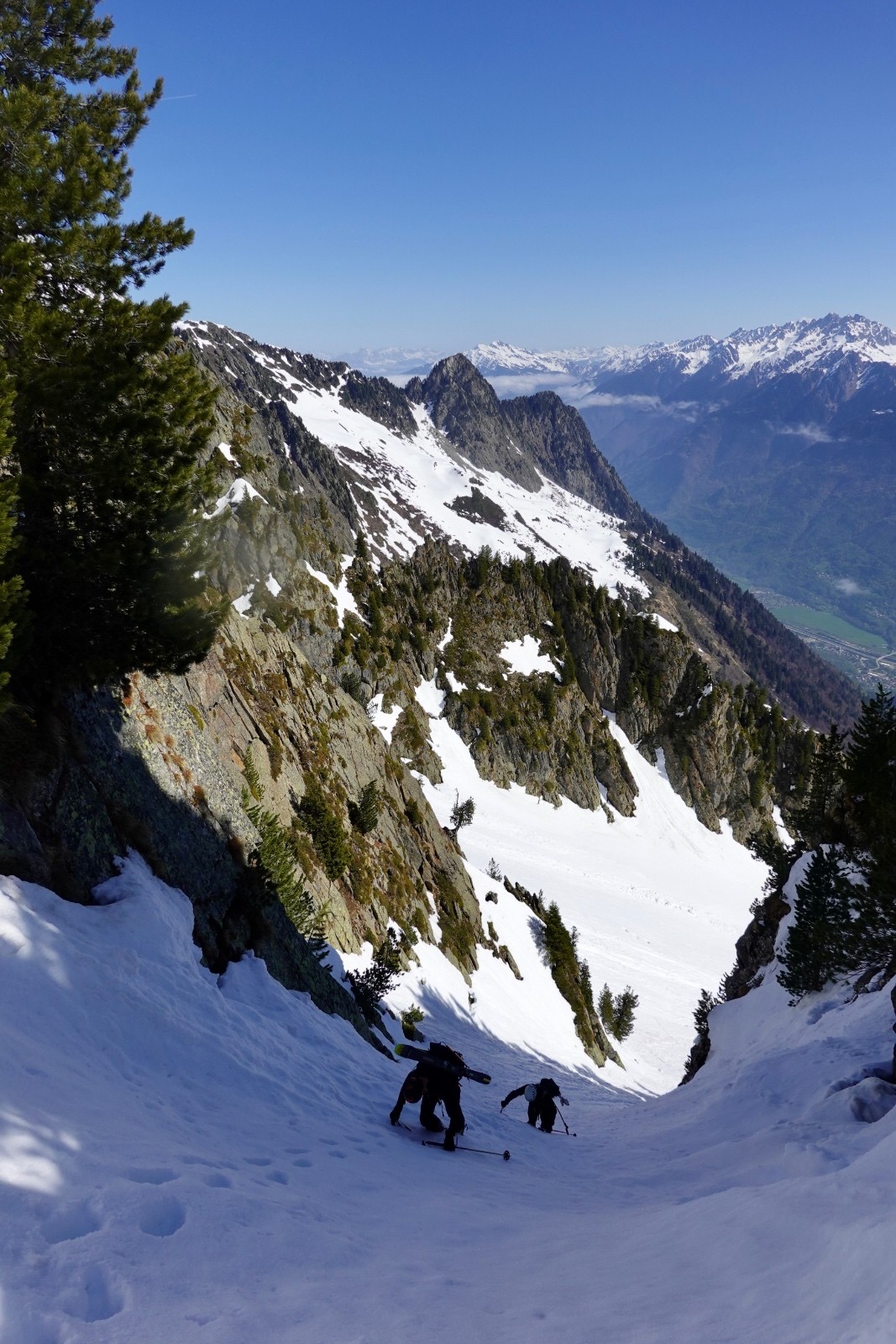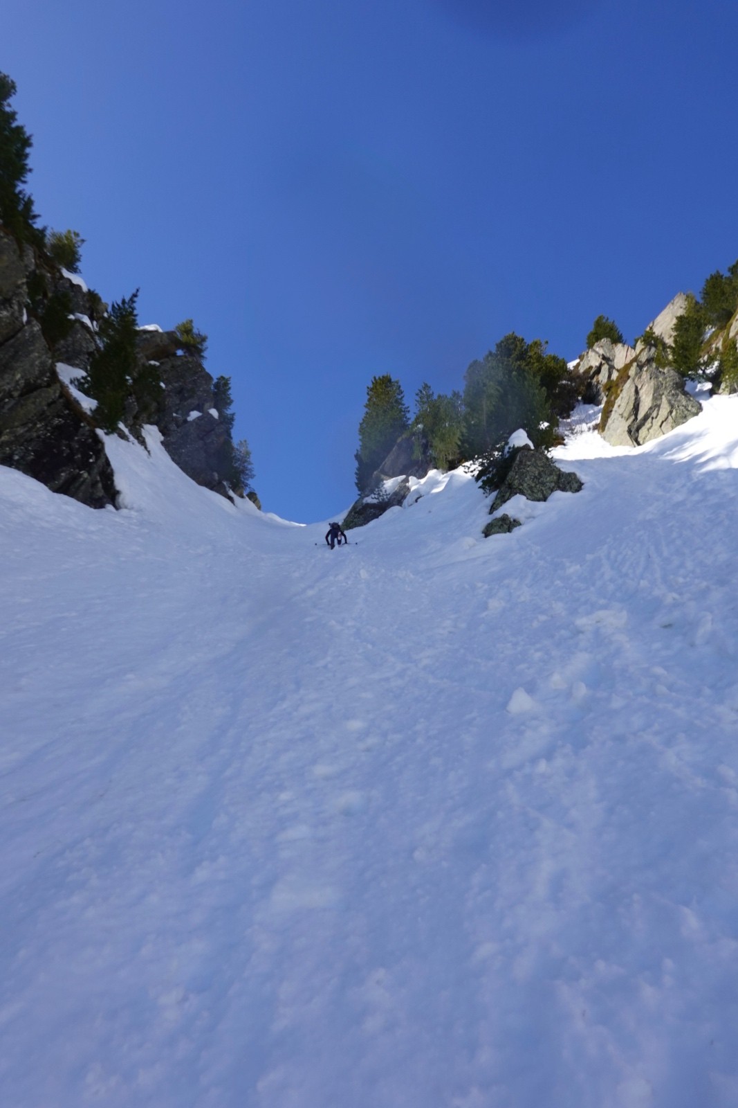 Conditions pour le ski : regel insuffisant dans les orientations qui voient le soleil ; près de 60-80 cm de neige pourrie sous le couloir ; neige croutée portante dans le couloir à l'ombre, crampons très utiles