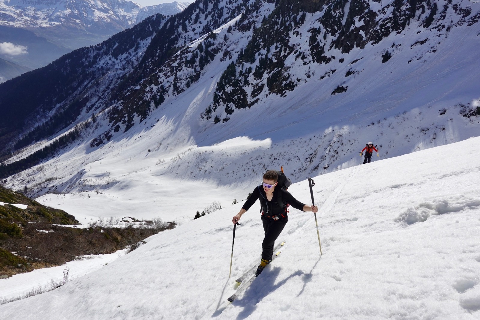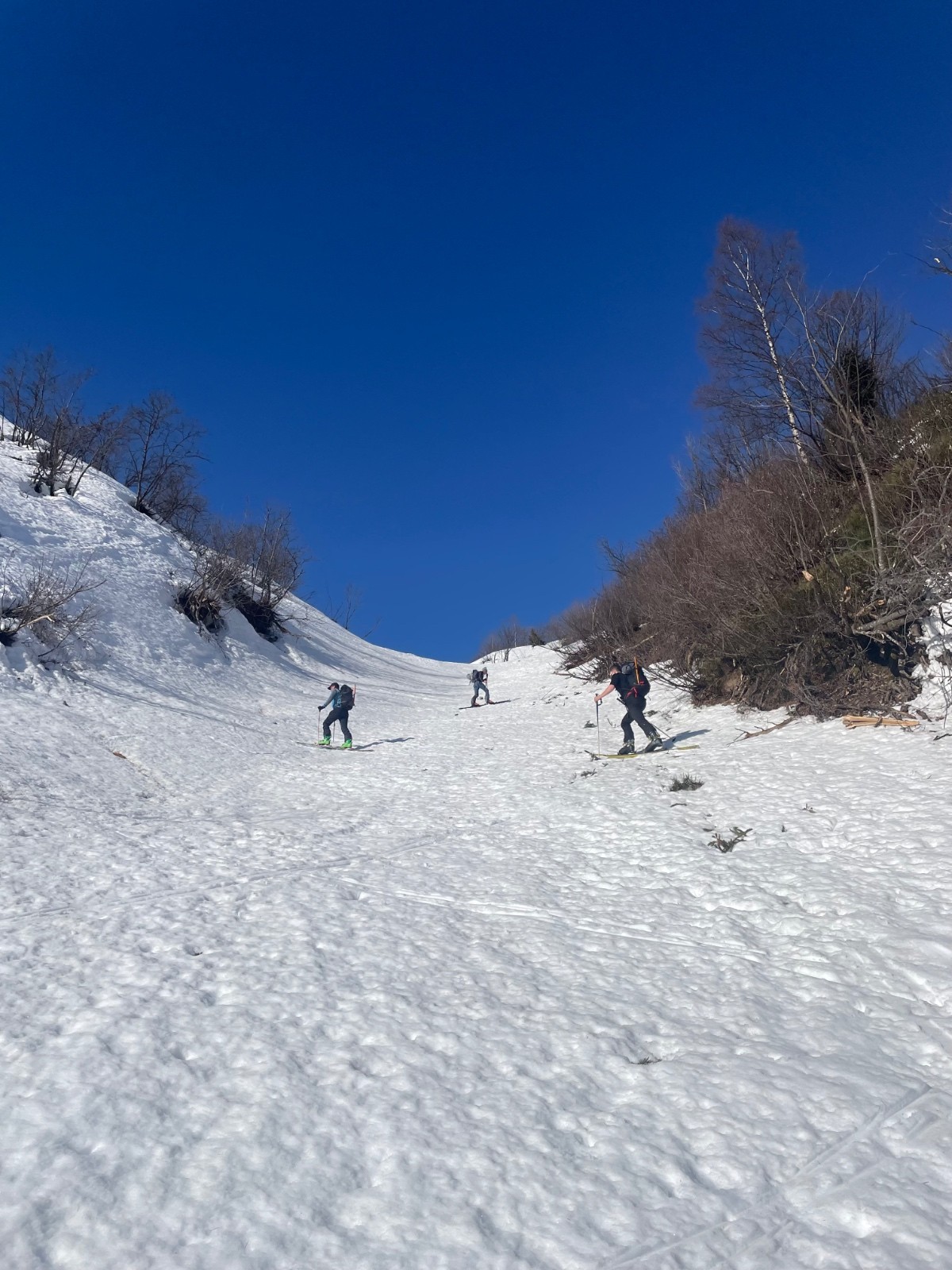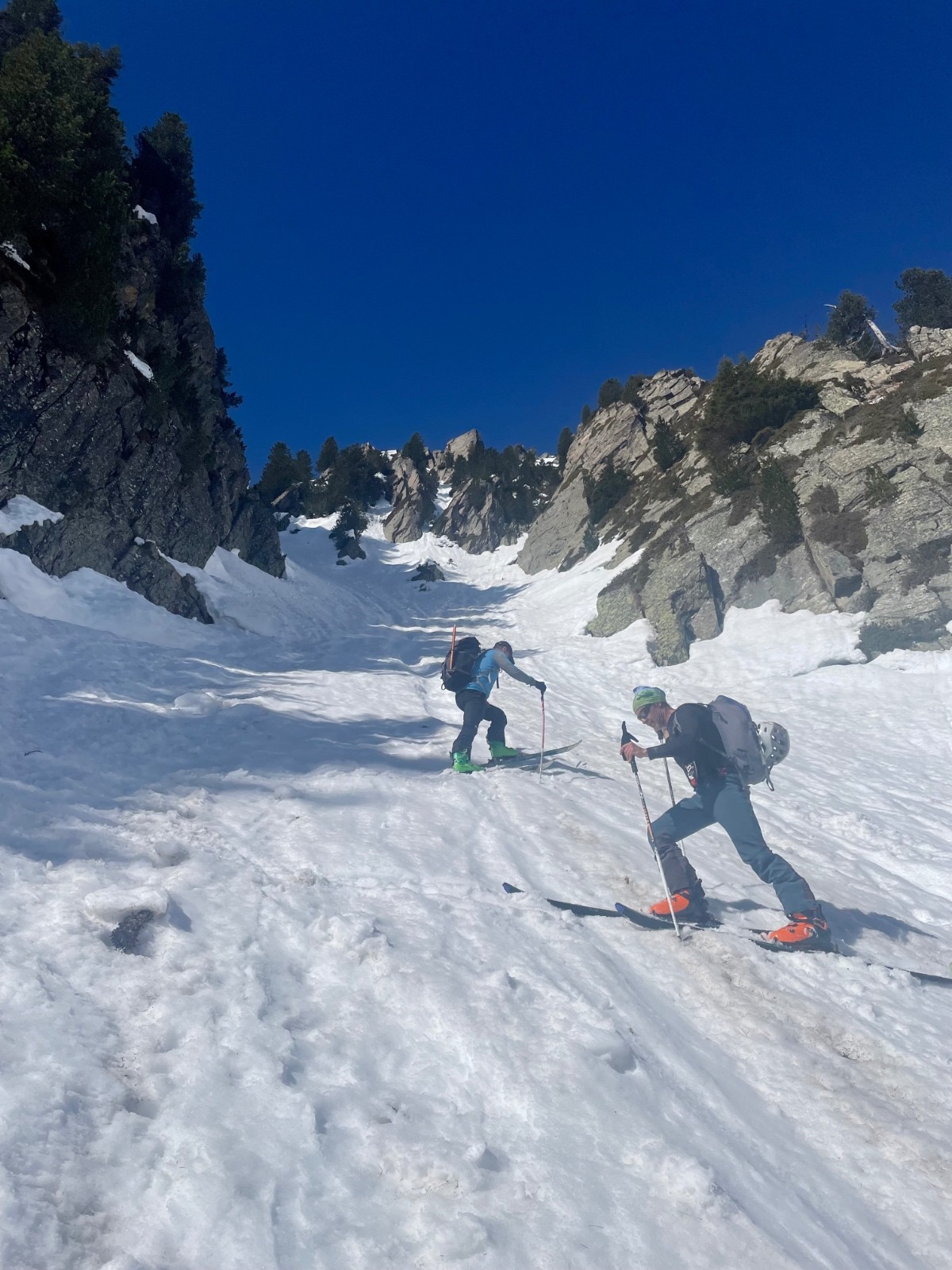 Conditions pour le ski : regel insuffisant dans les orientations qui voient le soleil ; près de 60-80 cm de neige pourrie sous le couloir ; neige croutée portante dans le couloir à l'ombre, crampons très utiles