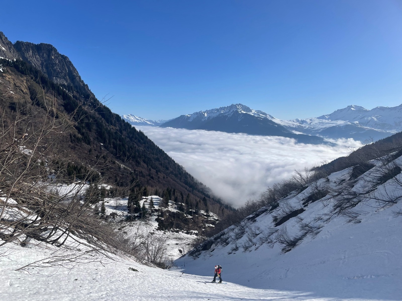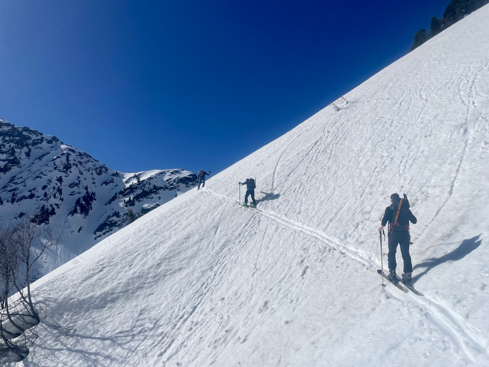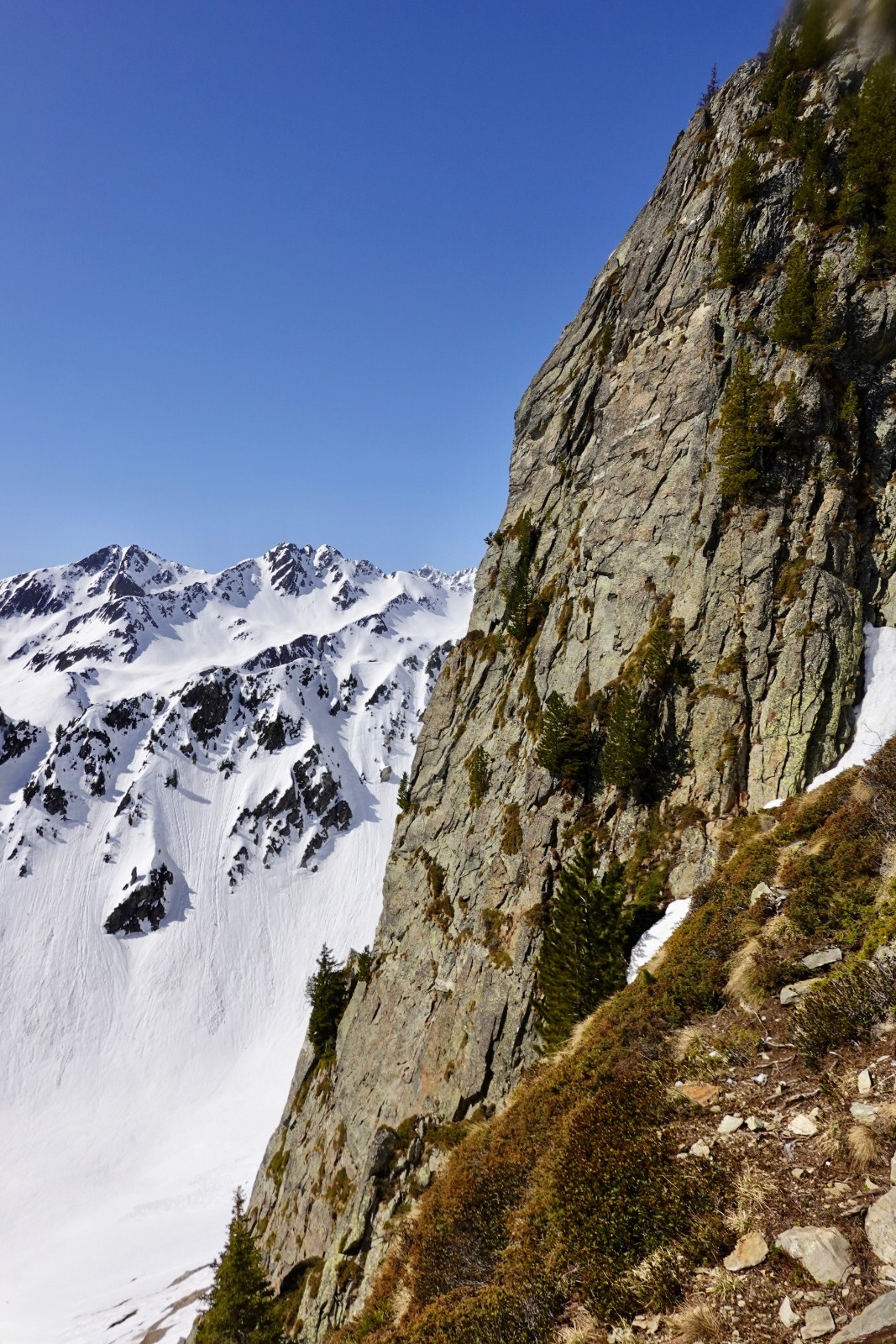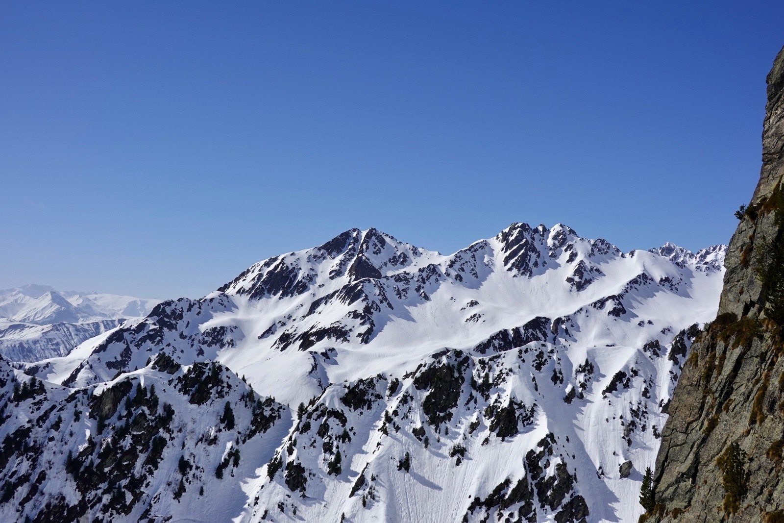 Conditions pour le ski : regel insuffisant dans les orientations qui voient le soleil ; près de 60-80 cm de neige pourrie sous le couloir ; neige croutée portante dans le couloir à l'ombre, crampons très utiles