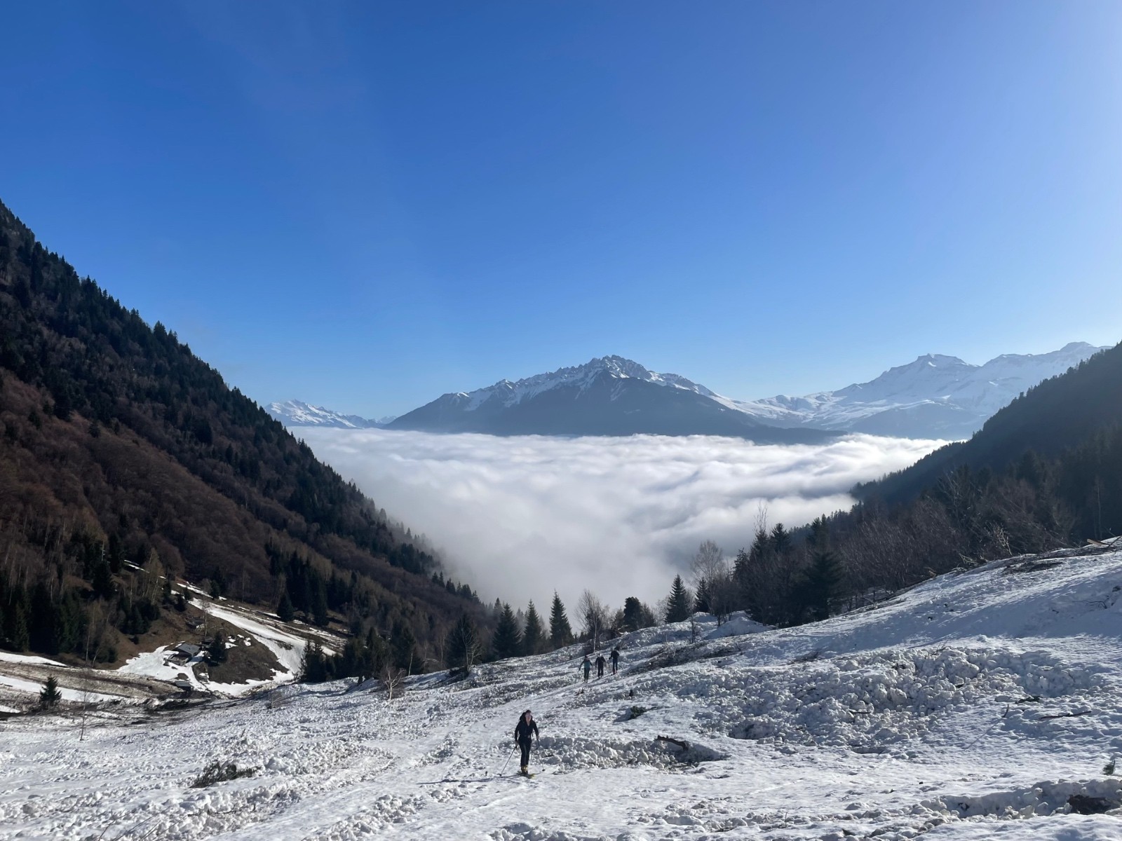 Conditions nivo et activité avalancheuse : nombreuses traces d'avalanches passées, des boules dans les pentes raides