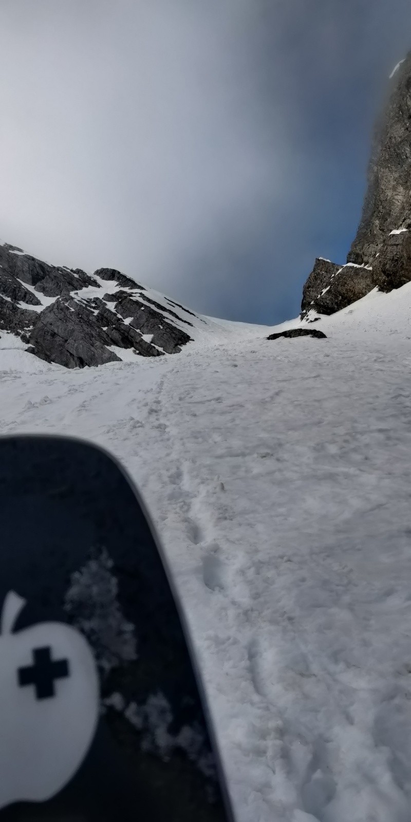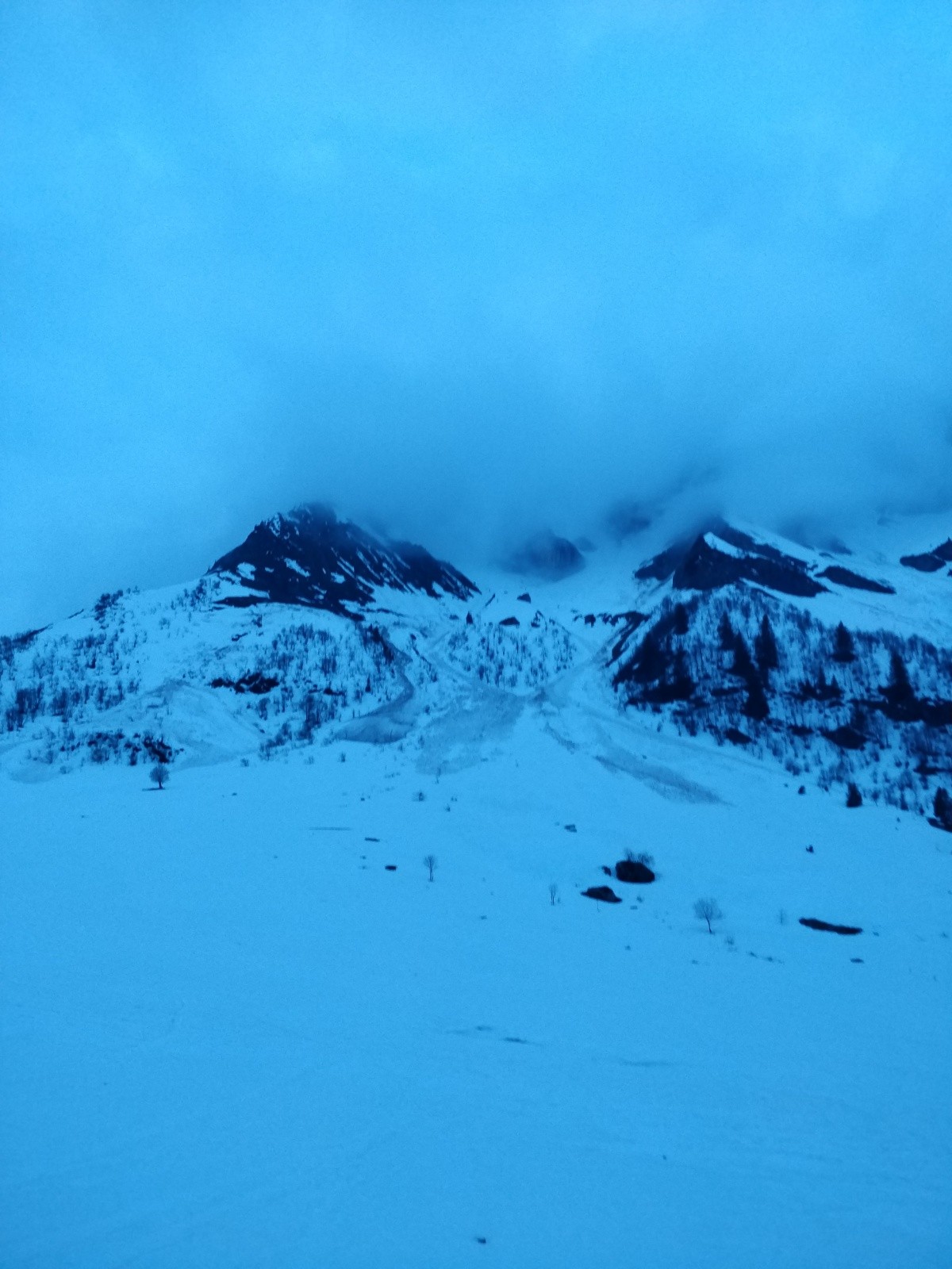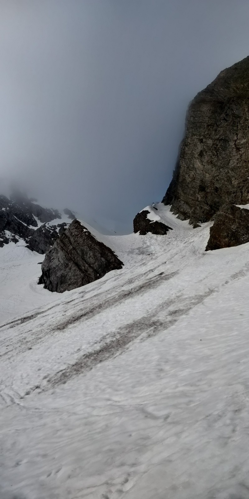 Conditions nivo et activité avalancheuse : Couloir complément purgé, grosses coulées qui rendent la montée et descente un peu plus difficile. Bien choisir sa trace dans la descente pour pas skier dans les blocs de neige des coulées (gauche jusqu'à fin du couloir, puis droite / milieu, sur la bosse prendre à droite dans les arbustes). A la montée, rester à droite ça passe mieux.
