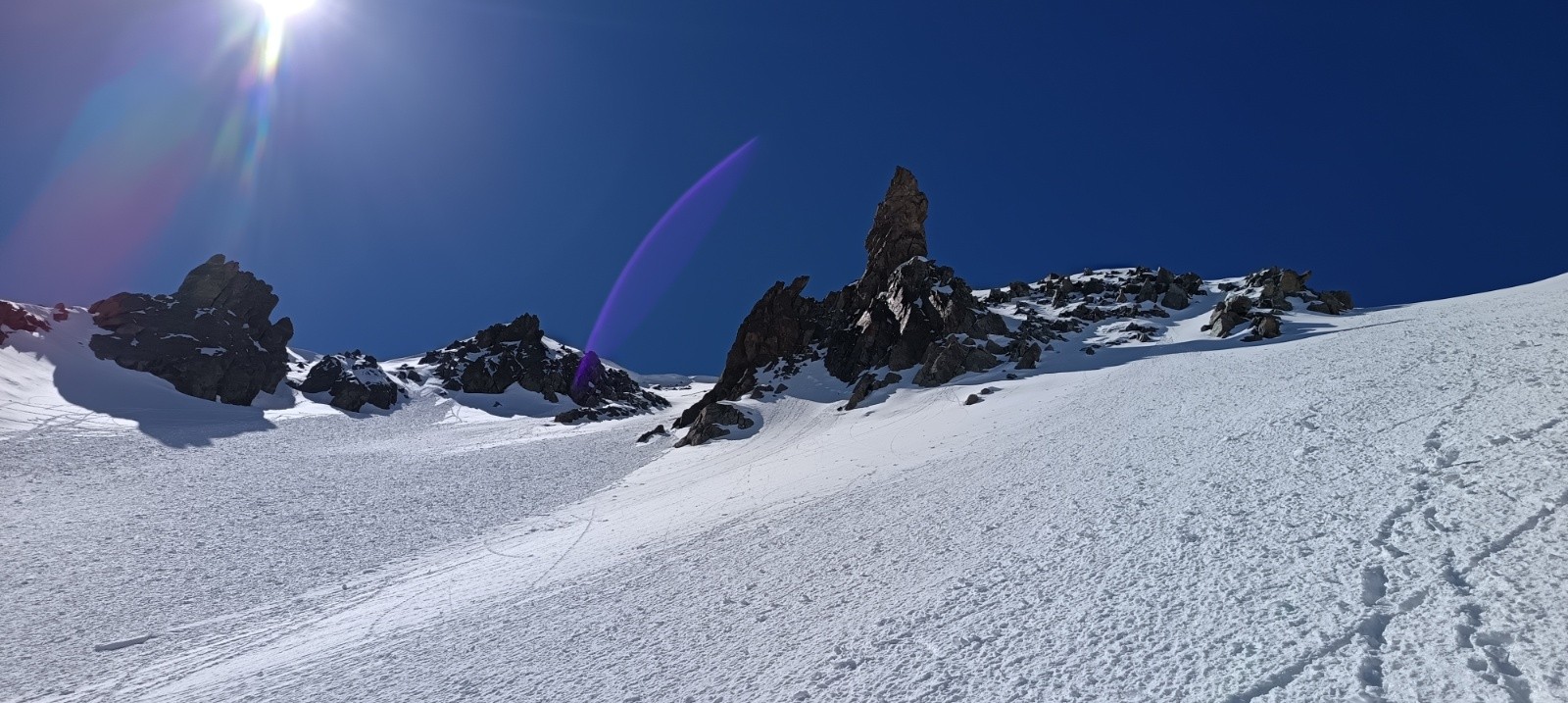 Conditions nivo et activité avalancheuse : Qqs grosses coulées récentes de neige lourde versant W en bas du vallon (parties de plus haut dans les couloirs raides) sinon RAS, ça chauffe vite, évidement sur tout ce qui voit le soleil le matin.