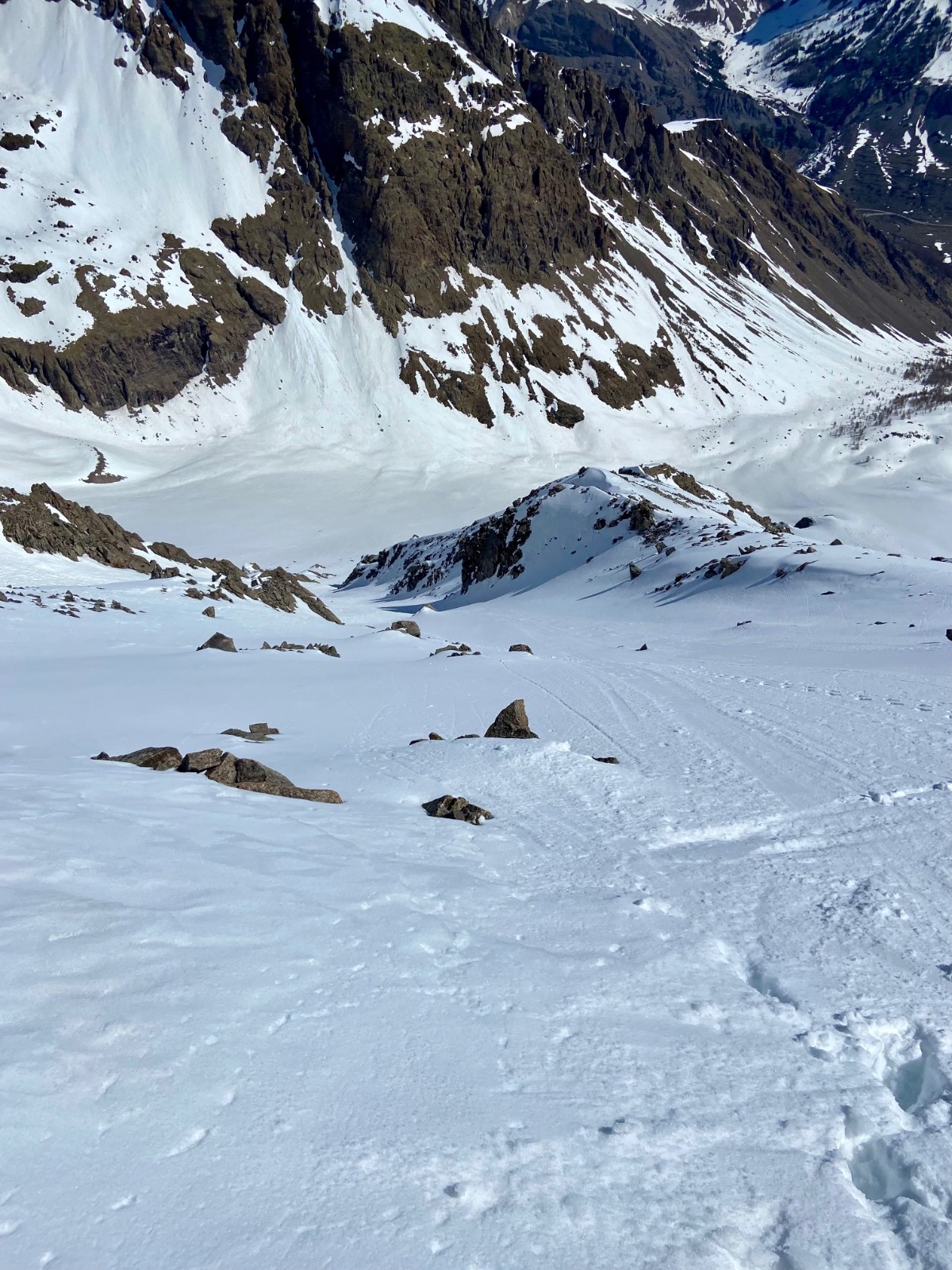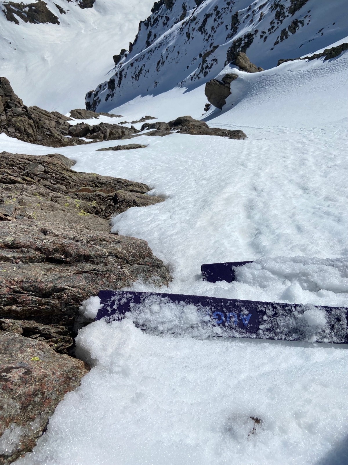 Conditions nivo et activité avalancheuse : traces d’un départ massif en NE et N datant de quelques jours. Beaucoup de gobelets près des crêtes, attention aux heures chaudes!