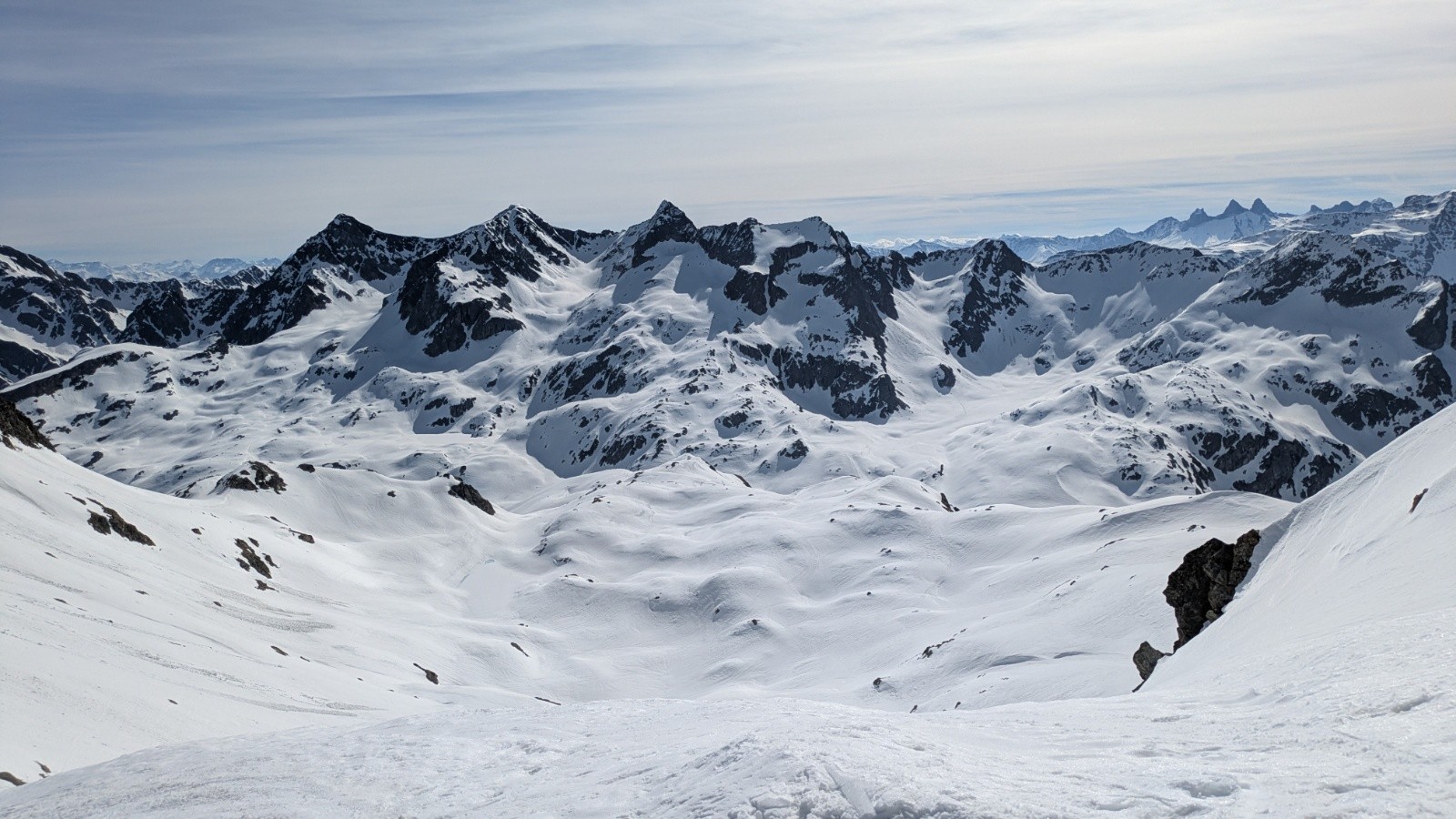 Un petit tour au départ de Pipay pour profiter de la station fermée : Montée au col de pouta, cime de la jasse par l'arête (bonne marches tout le long, crampons piolets conseillés quand même), descente dans les vallons du pra et remontée à la belle etoile en passant par l'évêque. La combe qui monte à l'évêque est ravagée par une vielle coulée, très désagréable. Mieux vaut descendre (voir montée) par la combe d'à côté qui est lisse. Retour au dome des oudis ensuite pour finir cette belle matinée