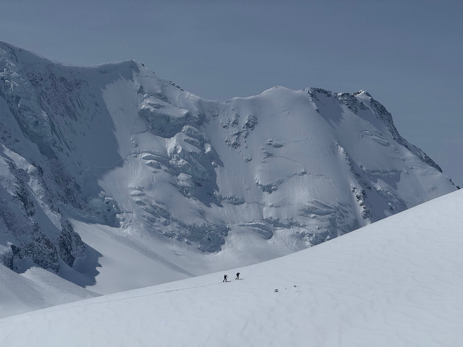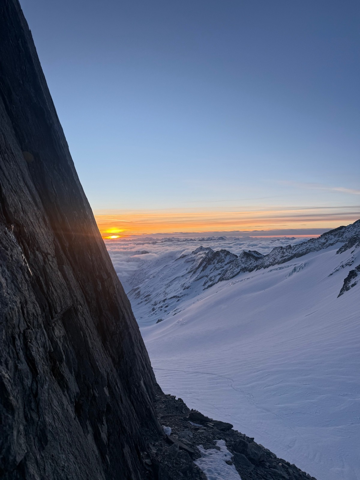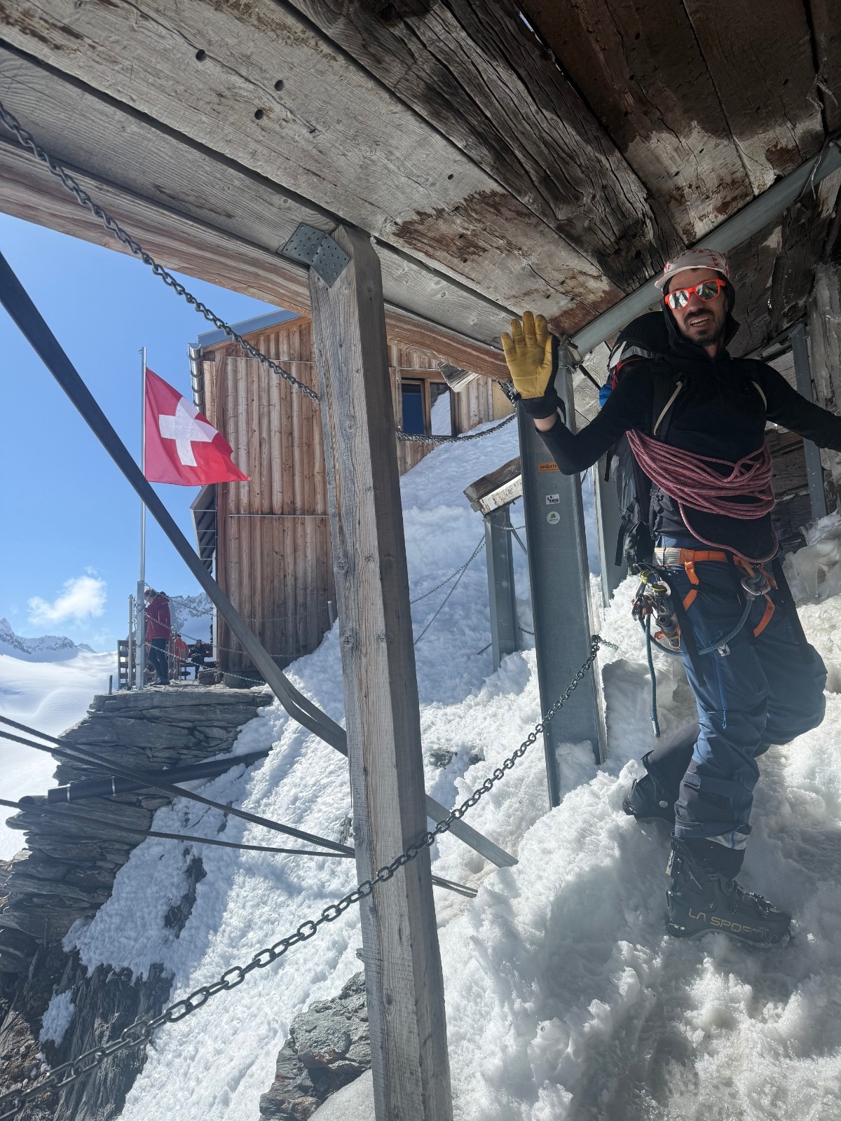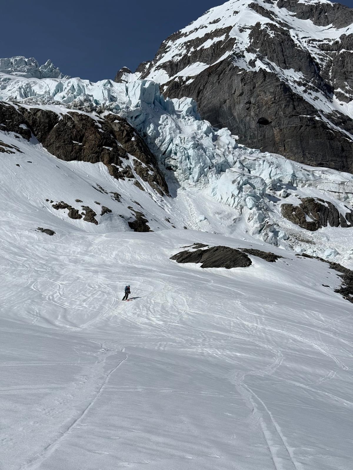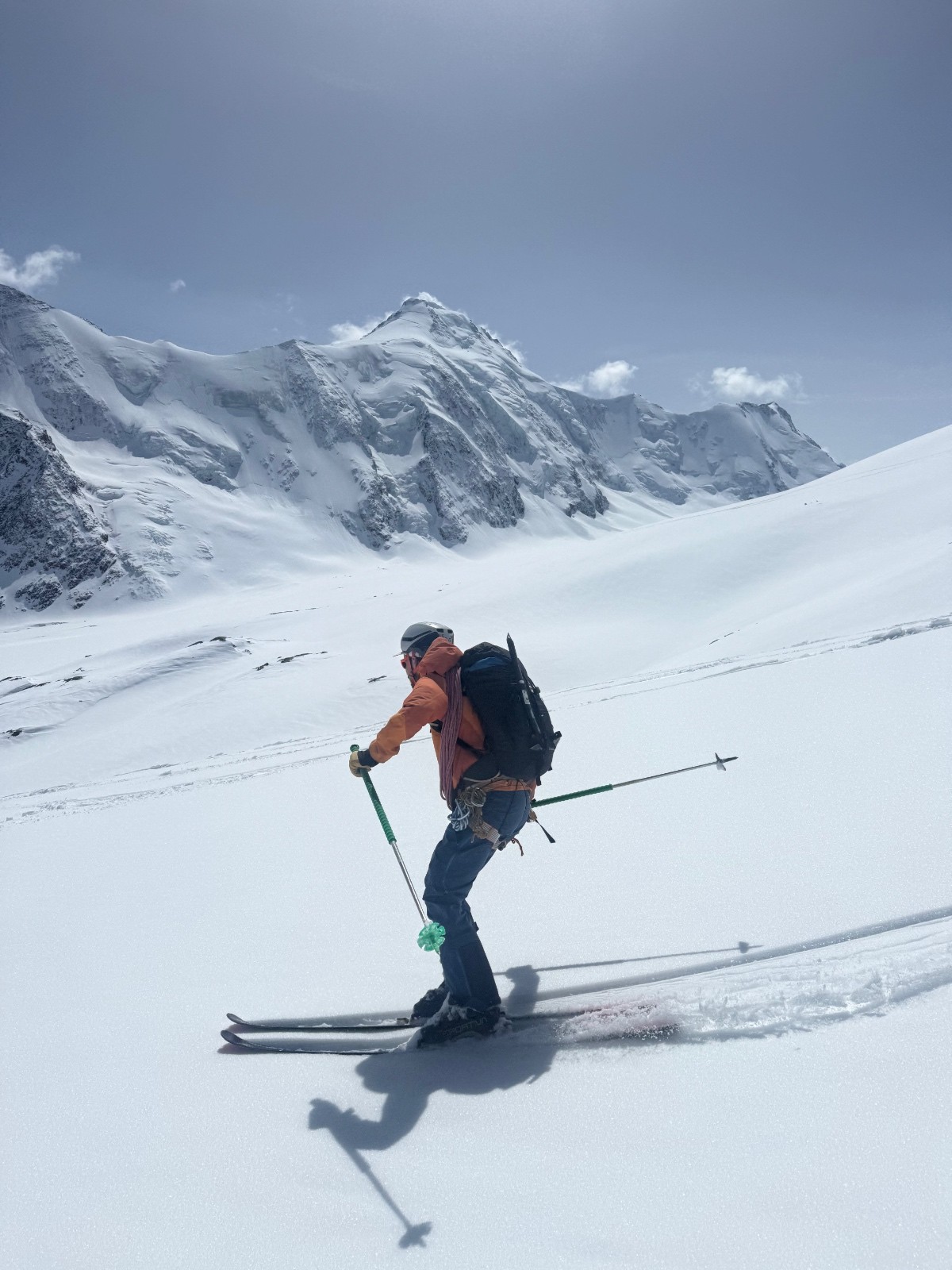 Une longue étape sauvage et variée pour rejoindre la Gaulihütte. La traversée au Scheuchzerjoch était en neige dure puis poudre sur la moitié de la descente jusqu’à l’Unteraargletscher. La fin de la descente dans la moraine est un peu sketchy et peut être problématique si peu de neige. Montée à la Lauteraarhütte par les échelles car pas assez de neige pour passer par la moraine S. Le passage du Hiendertelltijoch nécessite de faire un rappel de 40m(équipement en place). Une corde fixe était en place à notre passage (atteignable par un premier rappel de 15m). Pour atteindre ce rappel, partir 20m vers l’est.