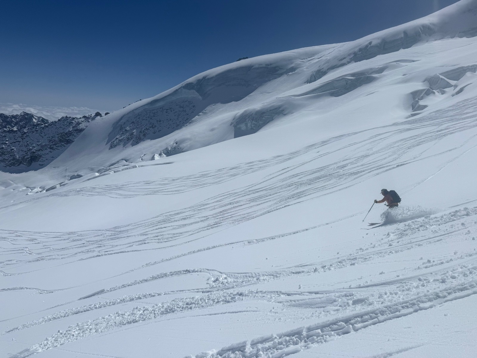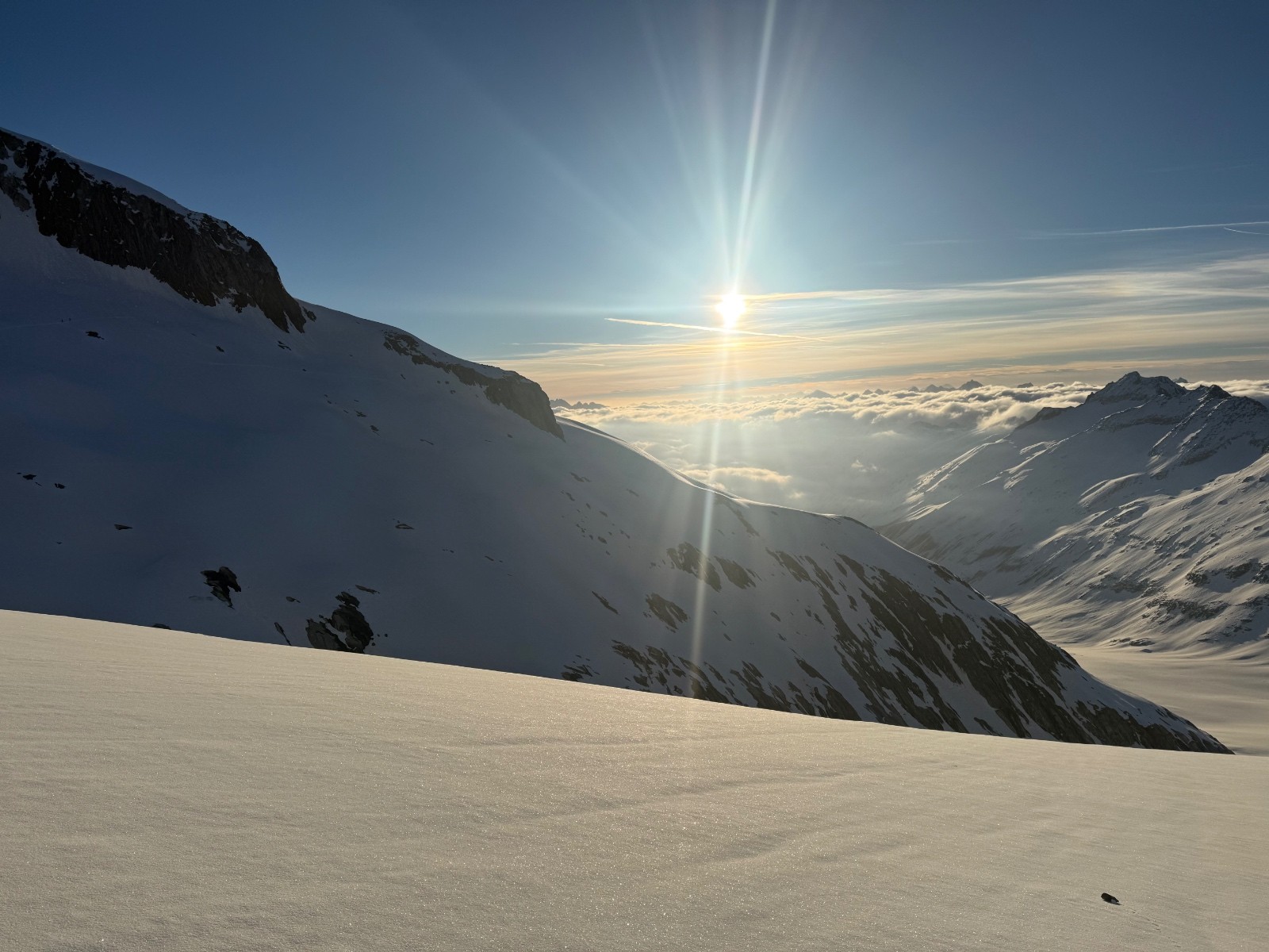 Très belle et longue étape avec une descente fabuleuse du Wannenhorn, quasiment tout poudre. La remontée au refuge sous le cagnard est longue!