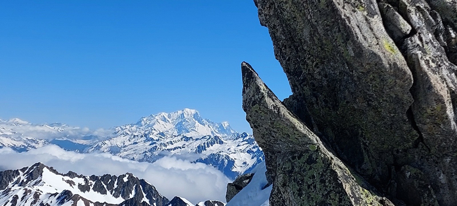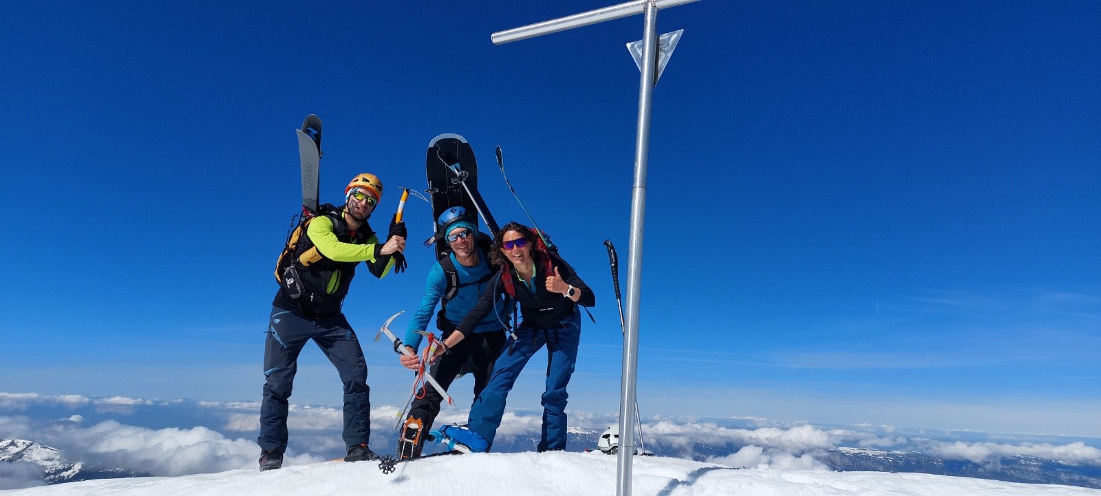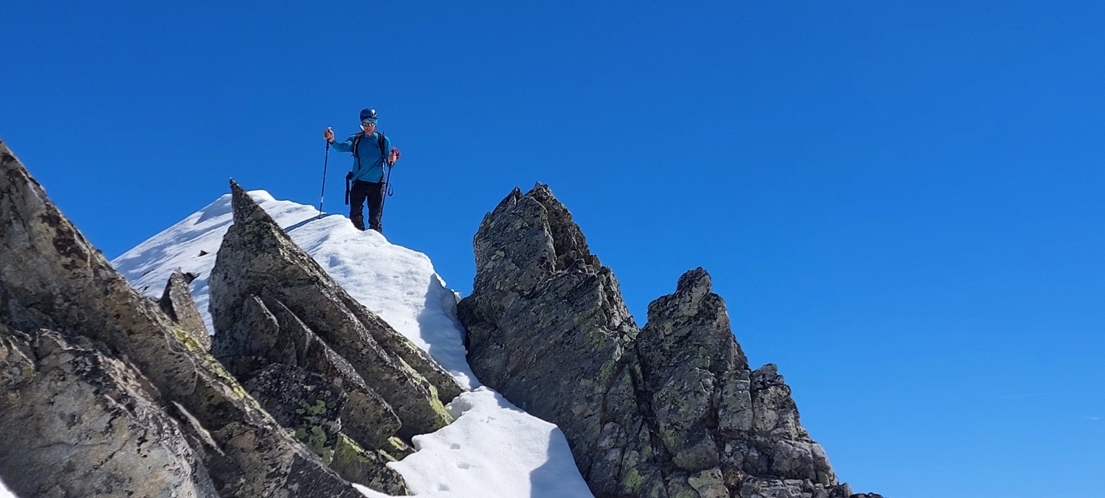 Une longue course assez alpine, avec pas mal de manips' et autres montées/descentes, il ne faut pas traîner (11h au sommet pour nous). Autant l'arête du Petit Charnier passe plutôt bien (Astrid sans crampons la veille avec ses Grelounettes, 2h plus tard que nous), autant la montée en Nord-Ouest au Grand Charnier (au dessus du collu/replat surplombant le col du Gollet) est nettement moins abordable actuellement : en neige béton dans cette pente fuyante, sans traces/marches, les mollets chauffent bien sur les pointes avant des crampons (et le piolet "ton meilleur ami" dixit Cherko - d'ailleurs on n'aurait pas dit non à un 2ème piolet dans ces conditions), et la concentration est de mise (d'ailleurs on a beaucoup moins tchatché dans ce passage 😮 !...).