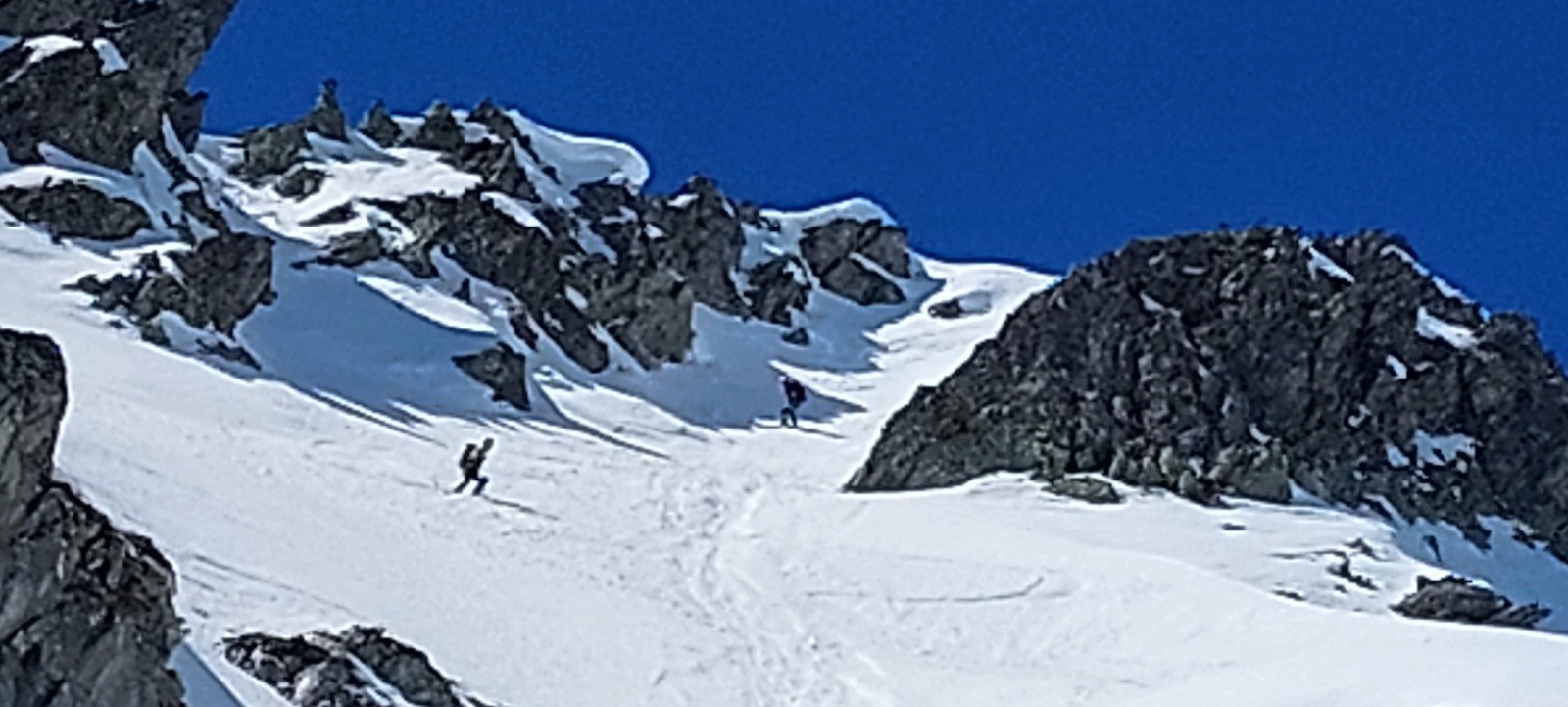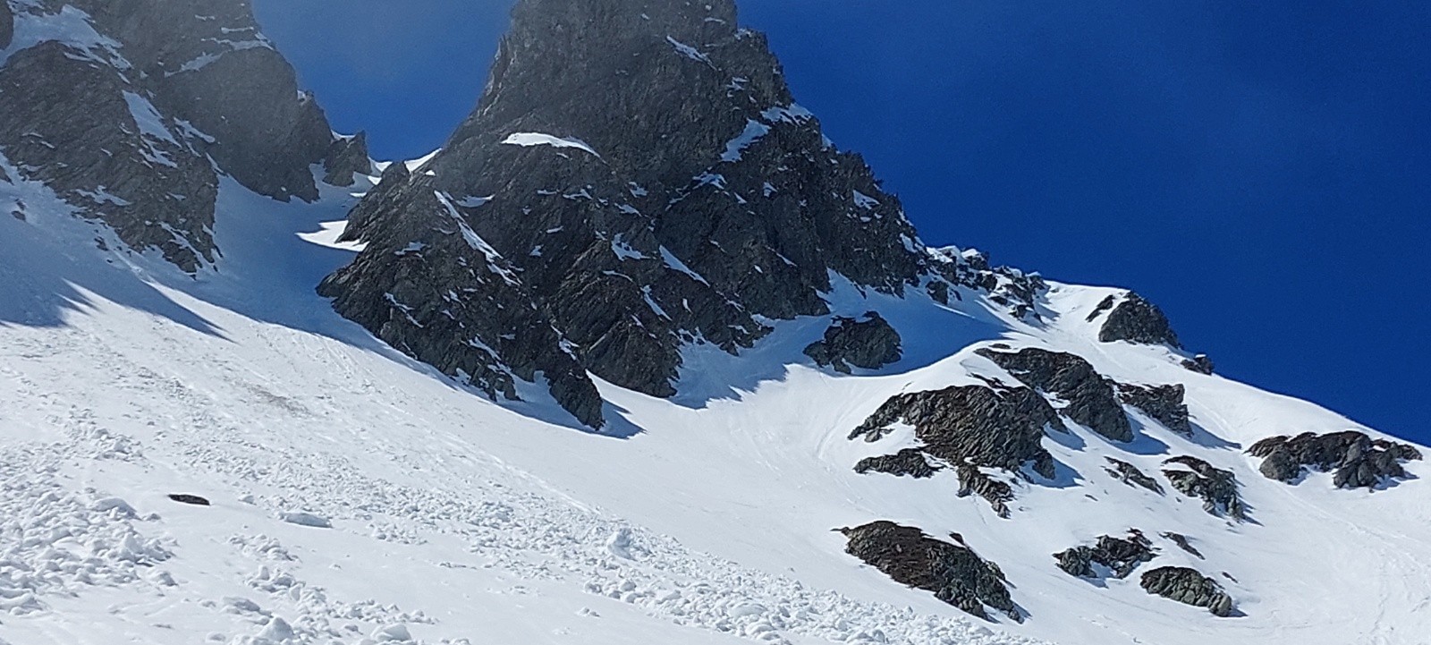 Peut-être serait-il actuellement plus judicieux/prudent de ne pas emprunter ce couloir, mais plutôt de chercher à rester sur l'arête rocheuse en rive droite (donc sur la gauche en montant), certes en mixte mais probablement plus rassurante.