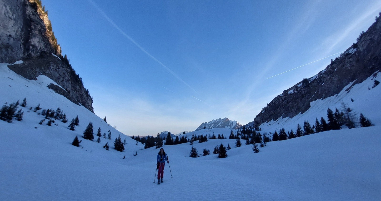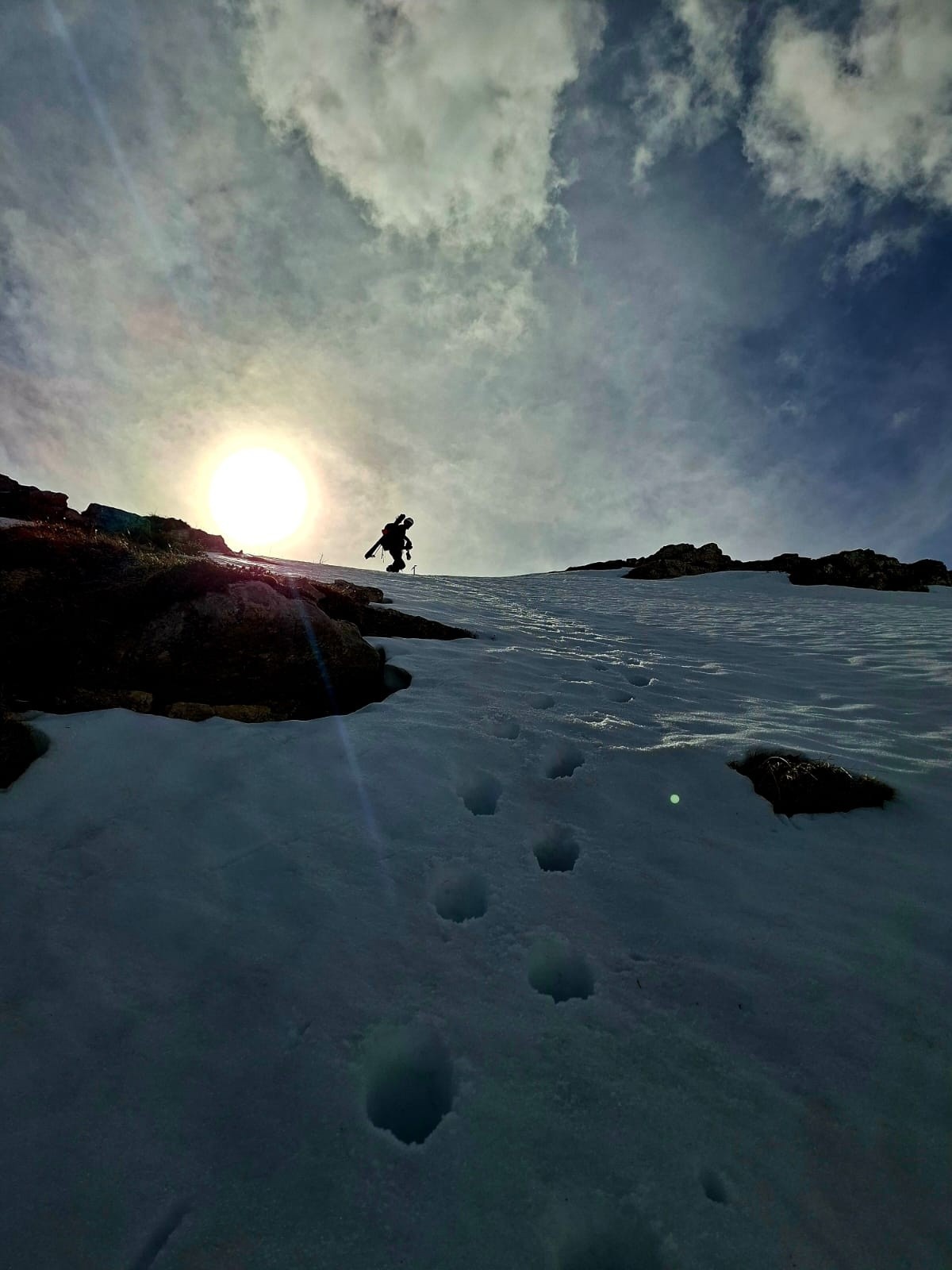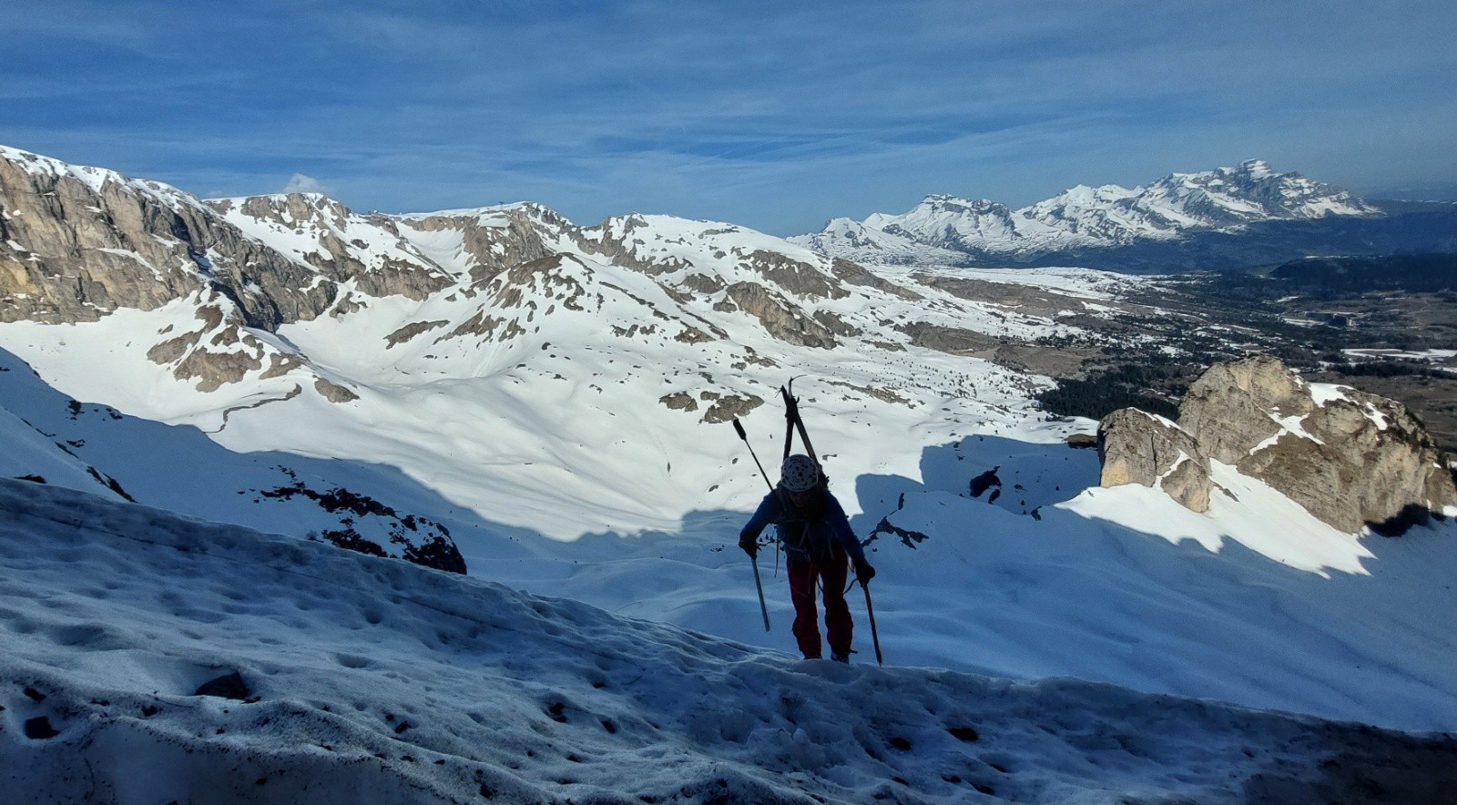 Réveil matinal, franchissement d'une petite congère sur la piste, crapahutage dans le bois rond puis on se retrouve à remonter le Vallon Froid (pas si froid que ça, même à 7H30). Sous l'écharpe, quelques vieilles coulées nous permettent de commencer à monter à ski puis on sort enfin les clous qui n'attendent que ça. La montée est dingue et sauvage. On est seuls au monde. Enfin. L'espace d'une demi-heure. Car arrivée au sommet, on aperçoit un autre binôme emprunter notre route. Dire que si on avait trainé 1H de plus au lit, Cissou Balou n'aurait même pas eu à faire les marches...