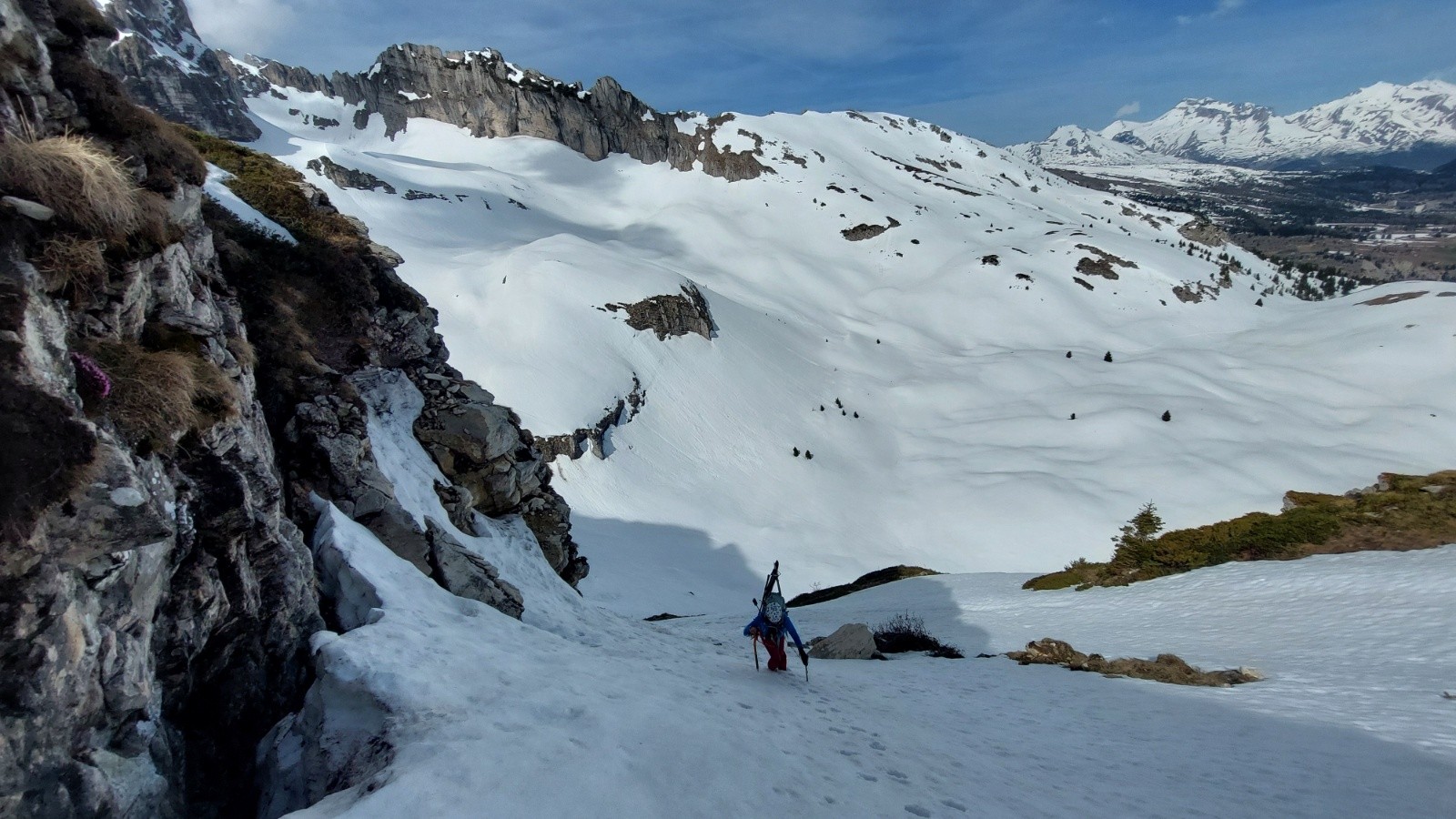 On descend dans le Vallon de Barges par la brèche, on s'arrête pour observer les alentours, et on jette notre dévolu sur une attirante petite rampe en N de la Crête de la Plane. Moyennant une petite traversée, on rechausse les crampons pour sortir sur la Crête. Sans oublier de repérer la belle grotte de l'église qui sera surement un terrain de jeu rafraichissant pour cet été.
