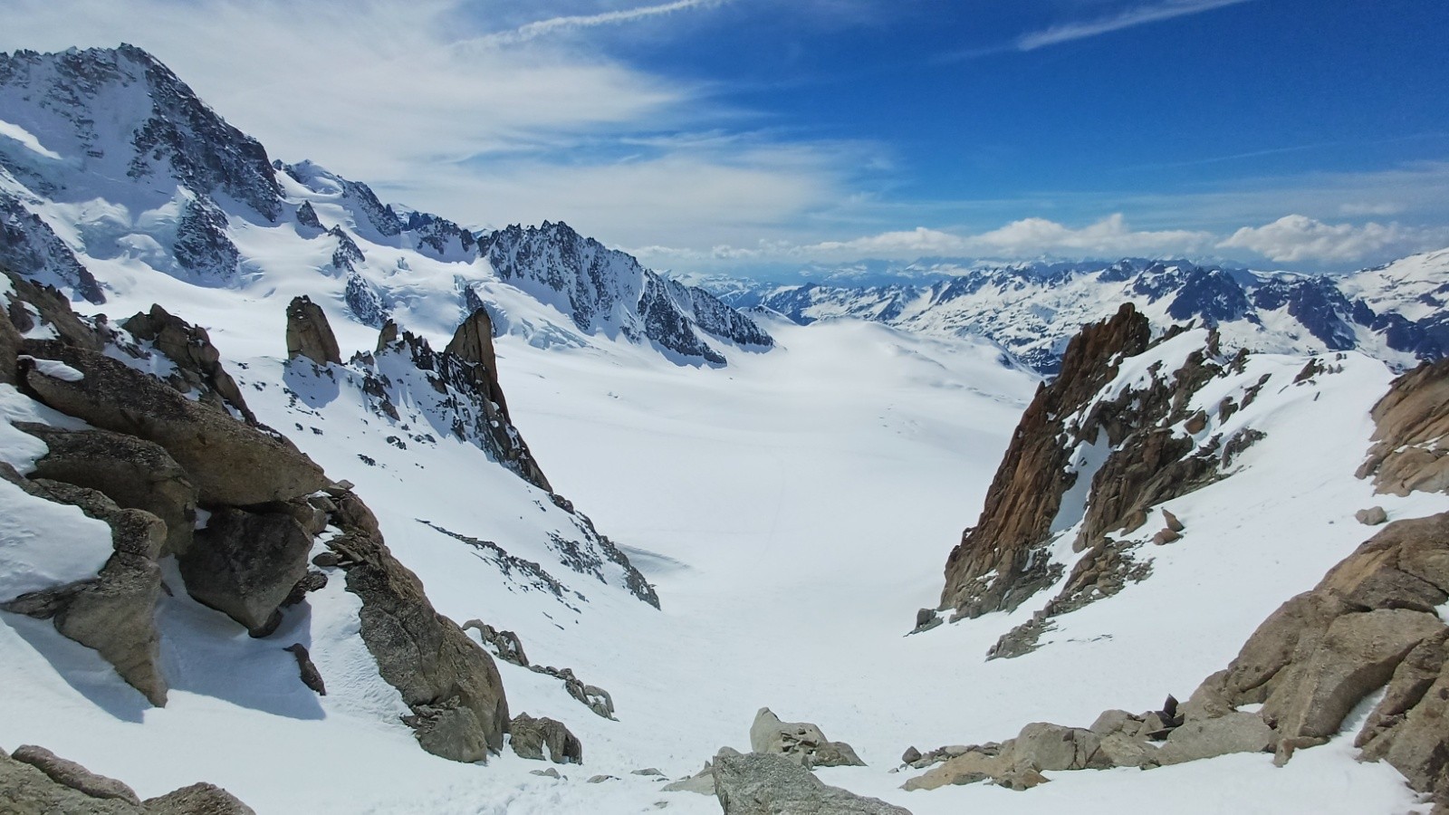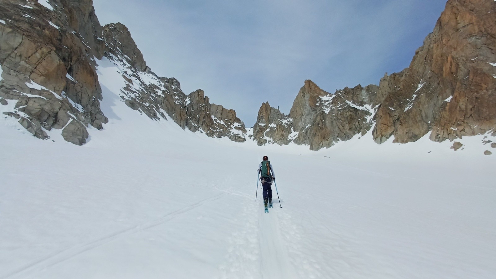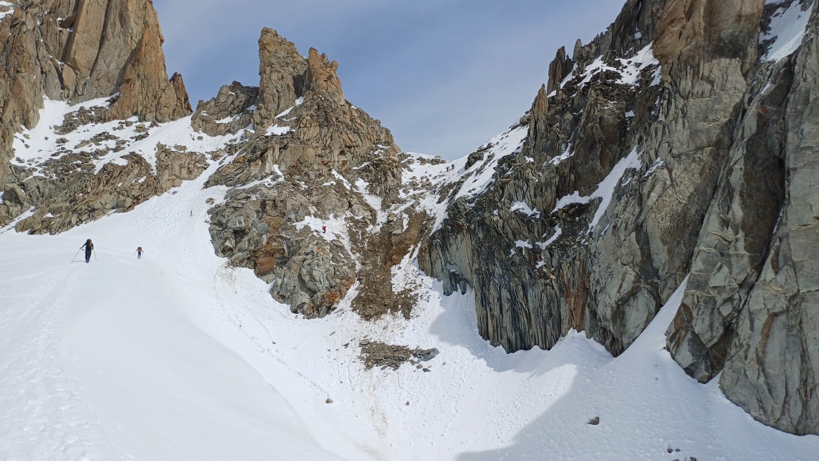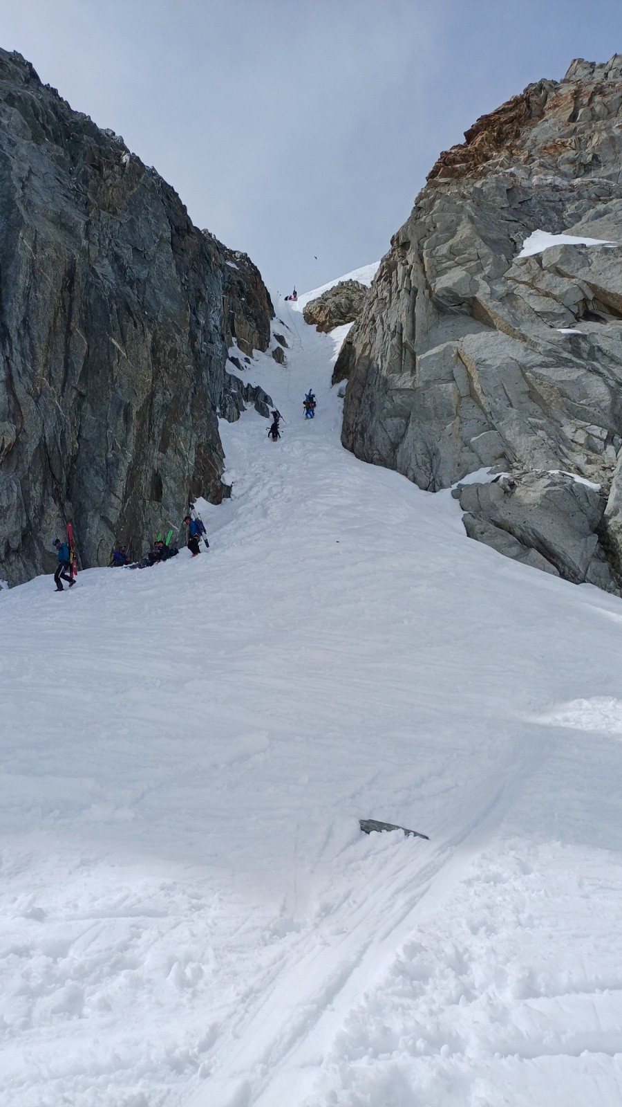 Bonnes conditions. Il faut monter rive gauche au départ du col du chardonnet, mettez direct les crampons au pied puis ski+couteaux a partir d'un replat. La redescente du col du Chardonnay passe tres bien en desescaladant avec la corde fixe a nœuds qui doit faire 40m je dirai, on a pris un brin de 60 et une cordelette pour rappeler mais franchement on aurait pu faire sans (les guides qui te passe devant et disent pas bonjour font comme ca avec leur client, en encordement court) Vous pouvez suivre ma trace gps sauf les derniers 100 metres galère (+++) de desescalade dans les vernes. J'ai pas trouvé l'échappatoire comme d'autre d'ailleurs 😅
