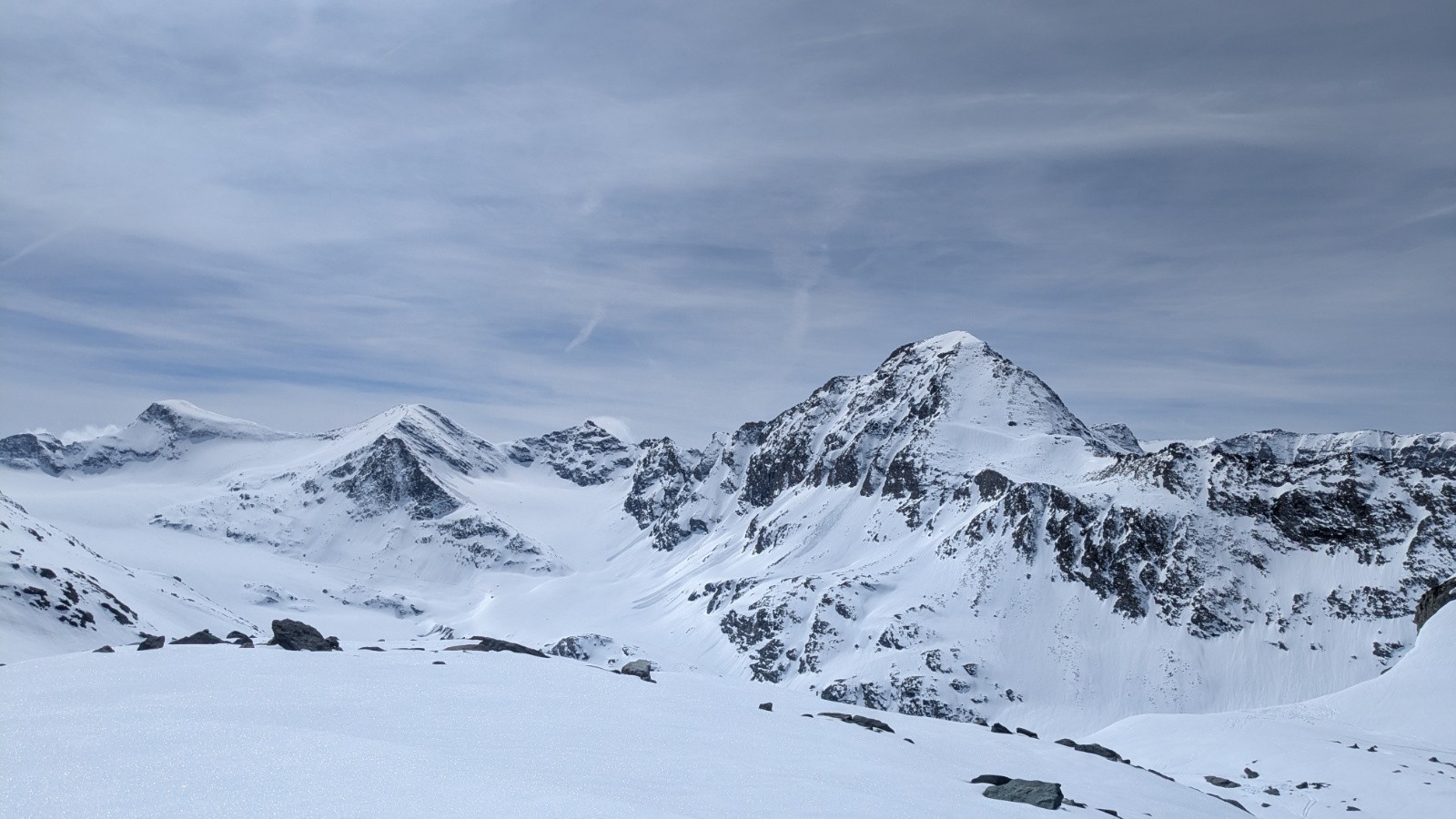 Conditions pour le ski : Poudreuse sous la Pointe Marie puis transfo en toutes orientations ou poudreuse rechauffée notamment en NE et pas ouvert au soleil