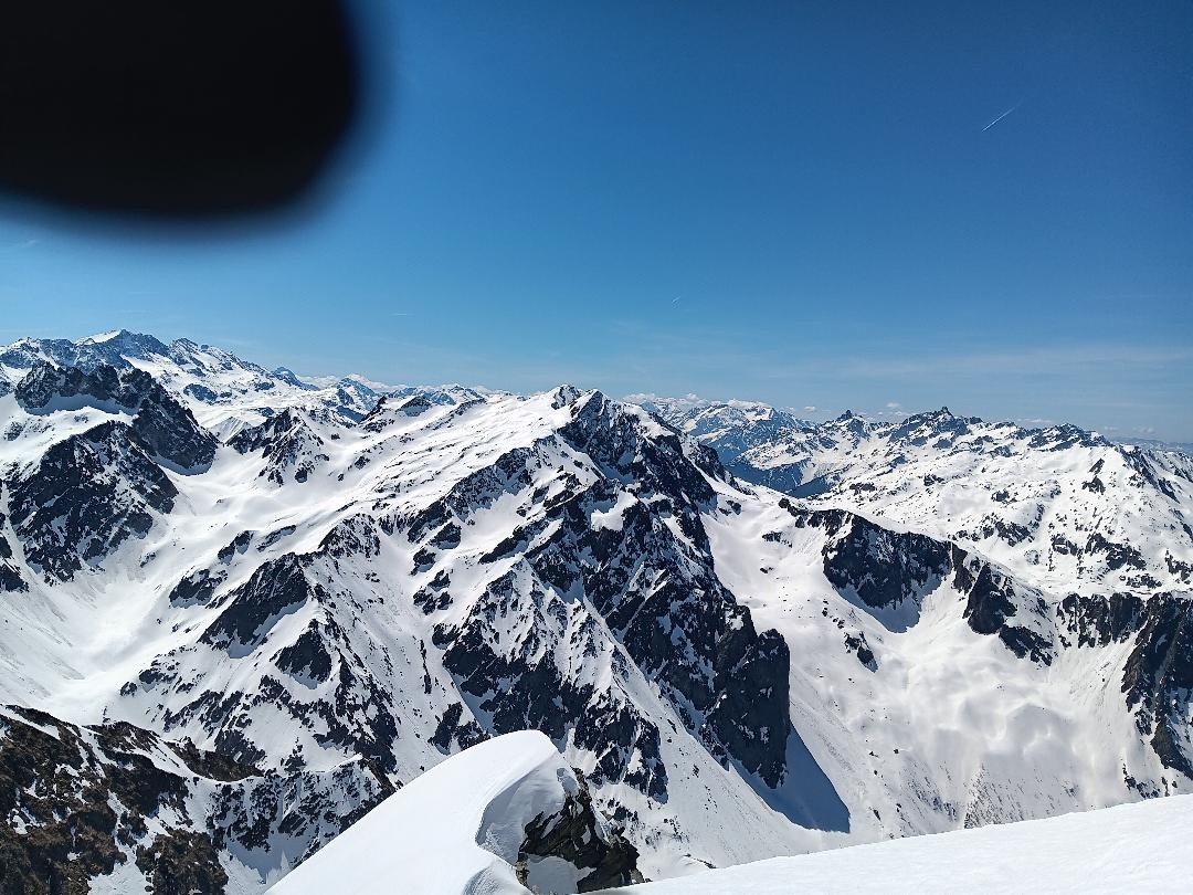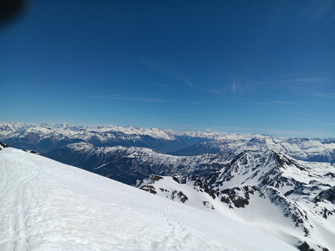 Début tranquille, basket au pied jusqu'à 1600m puis on chausse les skis dans une neige avec un bon grip qui rend toute la montée très plaisante. Cela ne s'enfonce pas et on n'a même pas besoin des couteaux: que demande le peuple!? Une personne est devant nous dans la montée du glacier d'Arguille sinon on est seuls au monde. On garde les skis au pied jusqu'au col d'Arguille, ou on déchausse à seulement 4/5m du col pour trois malheureux cailloux. Passé de l'autre côté , la neige est déjà bien revenue et ça ne tient pas trop, on met donc les skis sur le sac pour continuer à pied. On s'enfonce pas mal jusqu'au pied du petit couloir. Heureusement la neige porte plus dans le couloir et hormis deux trois fois où l'on se retrouve avec de la neige jusqu'au genou, ça passe tout seul. Arrivée en haut du couloir, on remet les skis au pied pour terminer les quelques mètres débonnaires jusqu'au sommet.