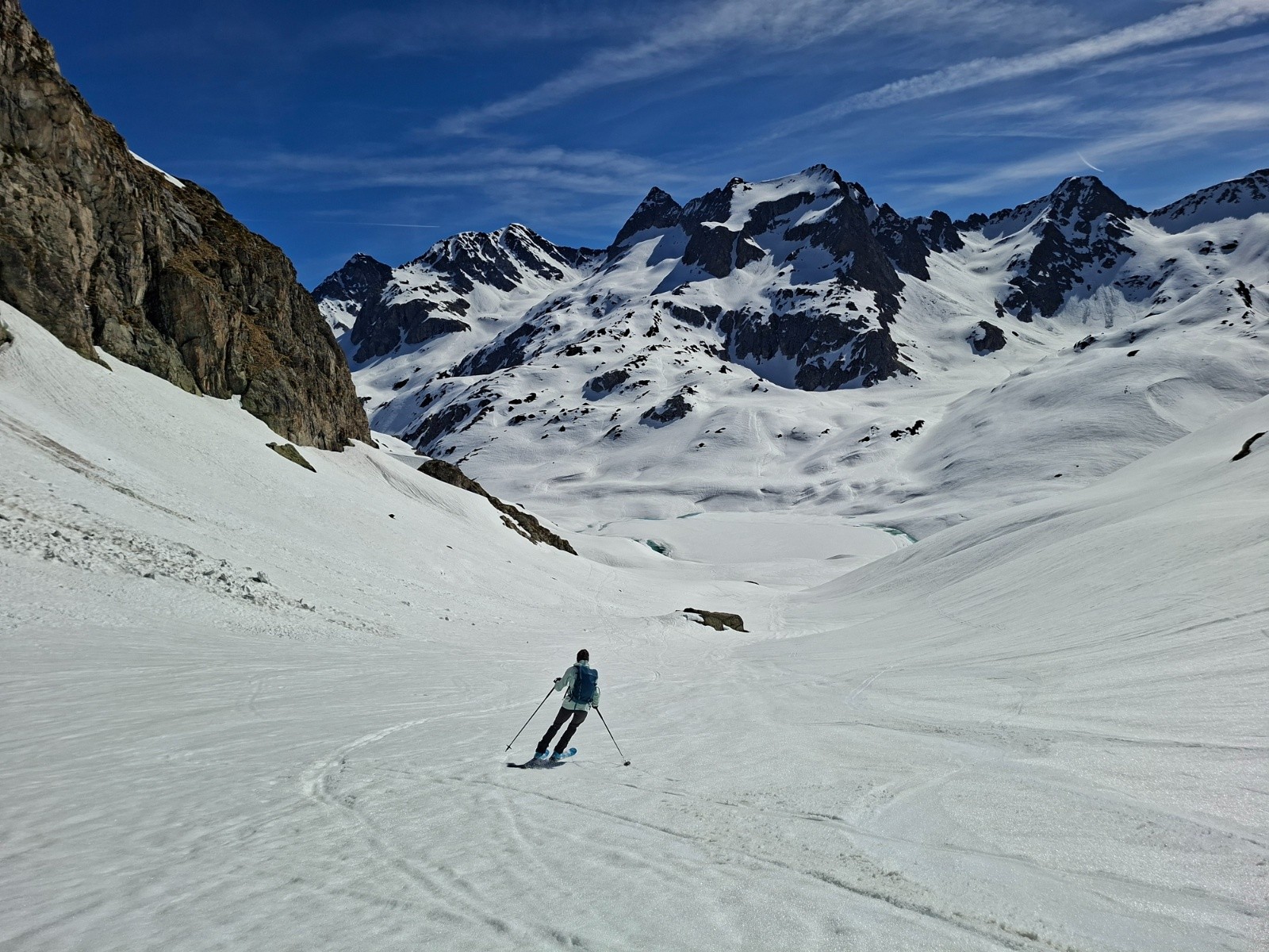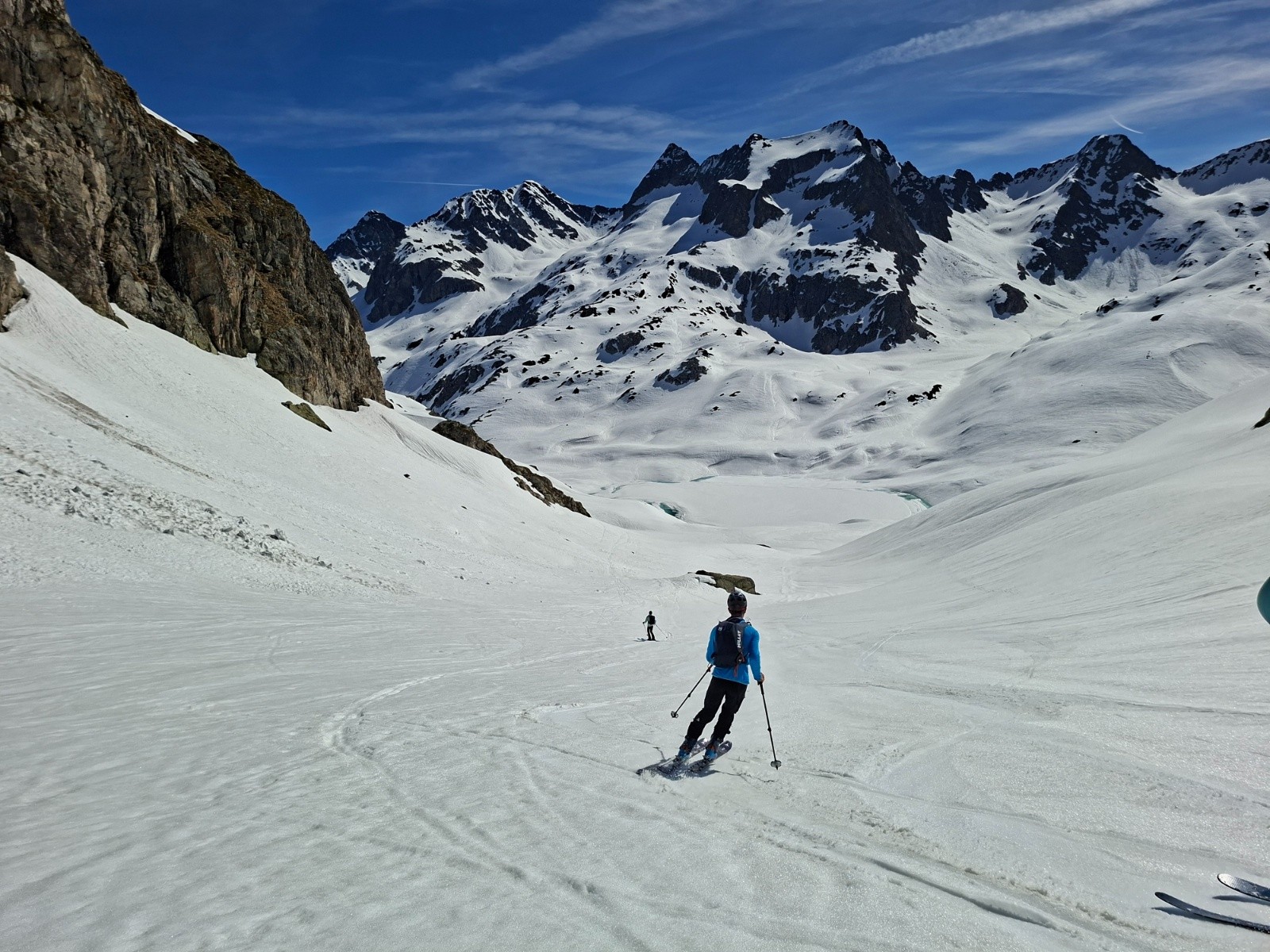 Pour remonter au col de la Vache, on a cette fois-ci remis les peaux jusqu’au pied du petit raidillon final, avec ou sans couteau. Pour les 50 derniers mètres, rebelote en crampons pour ne pas s’embêter. Ceux de devant sont passés à ski jusqu’à la corniche avant de finir les deux petits mètres manquants à pied, dans des marches. La descente sur le lac du Cos était super bonne : une top moquette dont on a bien profité, le sourire aux lèvres.