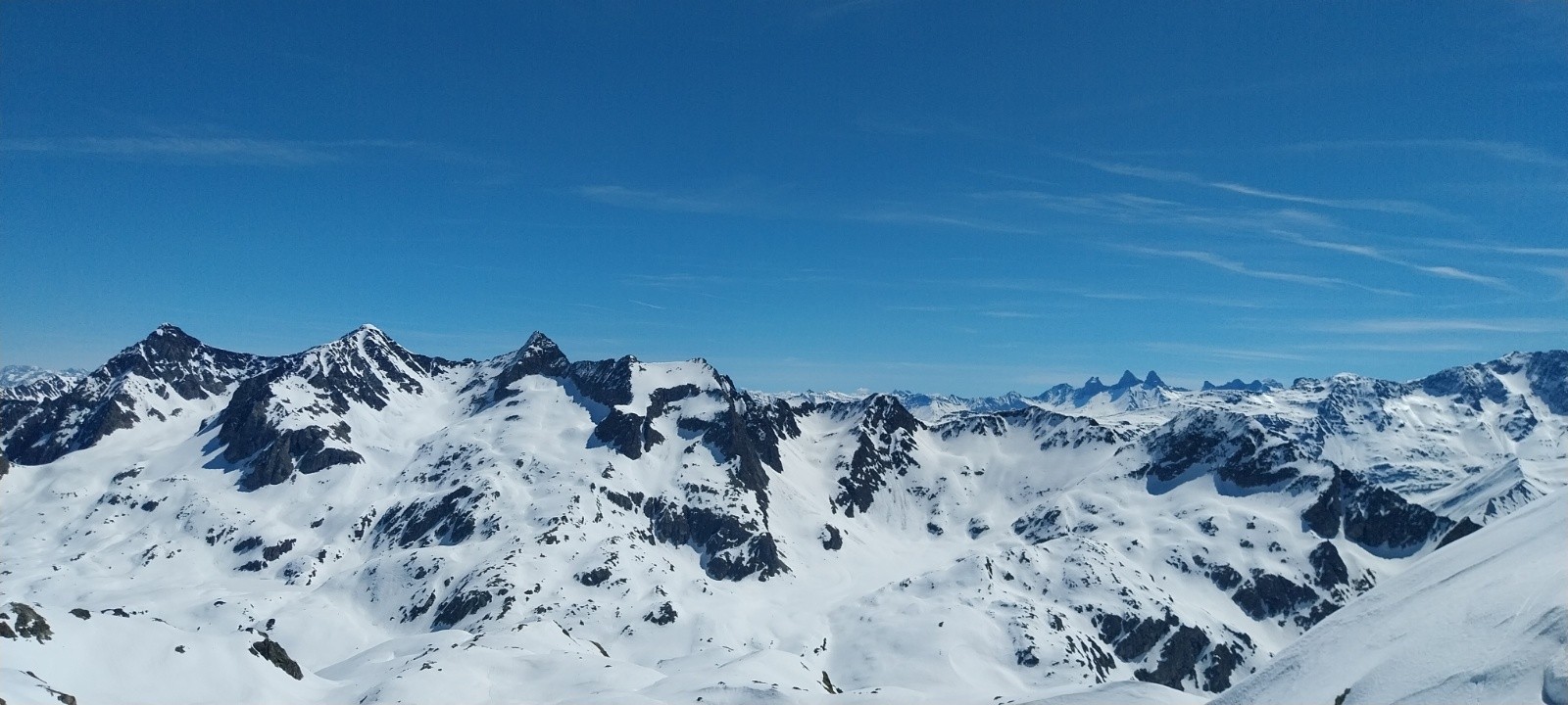 Une fois au petit barrage entre les deux lacs, il reste le retour. Toujours personne à l’horizon, mis à part un copain de Cédric avec qui on a fini le circuit (et, comme le monde est petit, aussi un copain de David qu’on a croisé en début de journée). La remontée au pic de la Belle Étoile est un peu longue : il y a quand même de la distance, mais le cadre est tellement exceptionnel qu’on n’y pense pas trop. Ça n’a même pas « zipper » dans la remontée jusqu’au sommet, ça fait plaisir de ne pas perdre d’énergie inutilement. Une fois sur le point culminant du jour, c’est la grosse foule : je n’avais jamais vu autant de monde là-haut. Après une pause sandwich bien appréciable, on s’est lancés dans la descente sud. Sur ce versant, ce sont les meilleures conditions que j’ai trouvées cette saison : le couloir se descend vraiment facilement et la pente de dessous est excellente. Sur la partie basse, c’est également super bon, sauf les 100 derniers mètres qui collaient un peu.
