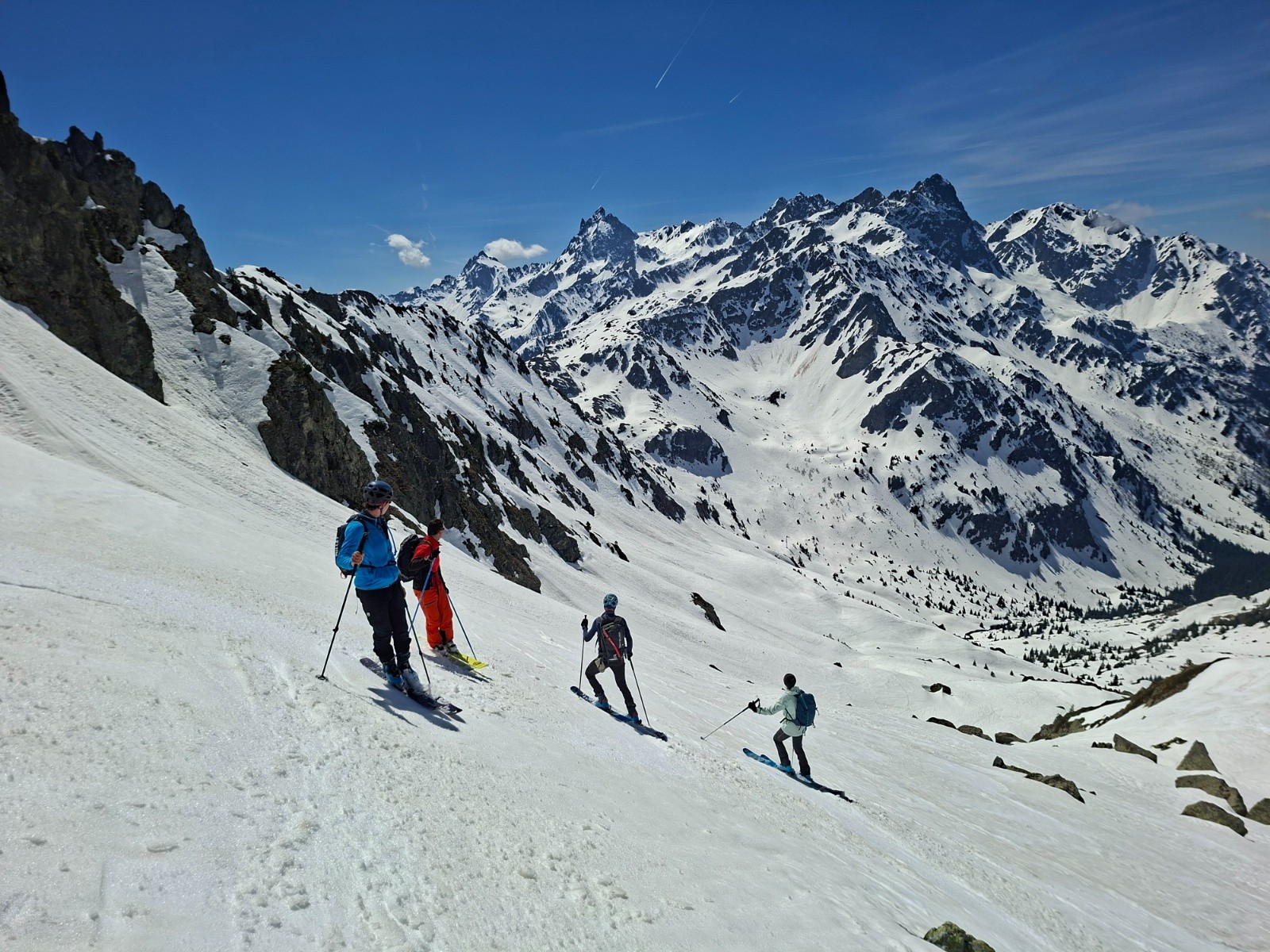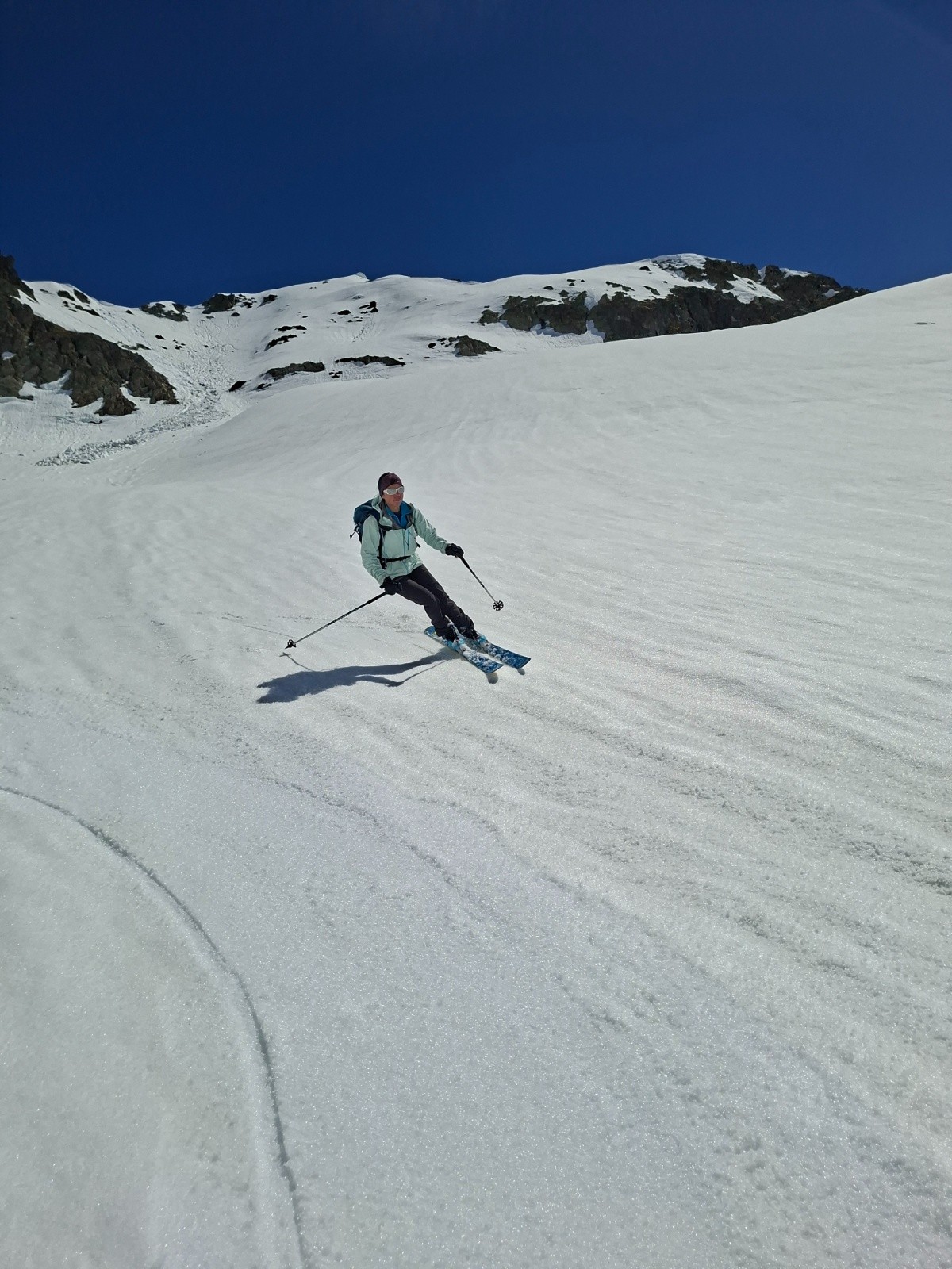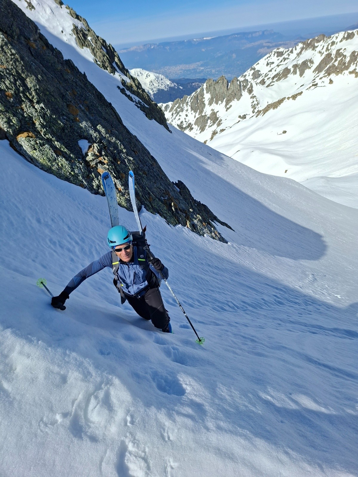 Après une première descente agréable, dans le timing prévu, on décide de ne pas repeauter. Ce sera en crampons pour passer le premier mur de la Belle Étoile sud. On n’a pas été les seuls à faire ce choix, mais d’autres sont bien passés à ski. Il y a eu quelques pas isolés où la croûte a cédé, mais c’était quand même un choix efficace qu’on n’a absolument pas regretté. On a été récompensés de cet effort par une belle descente en très bonne moquette. Dommage que ce soit un peu court : on aurait presque pu prolonger le plaisir un peu plus bas…