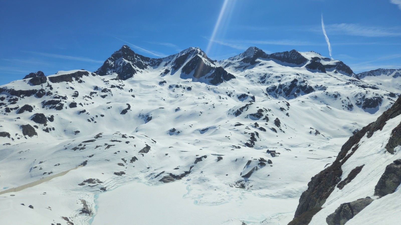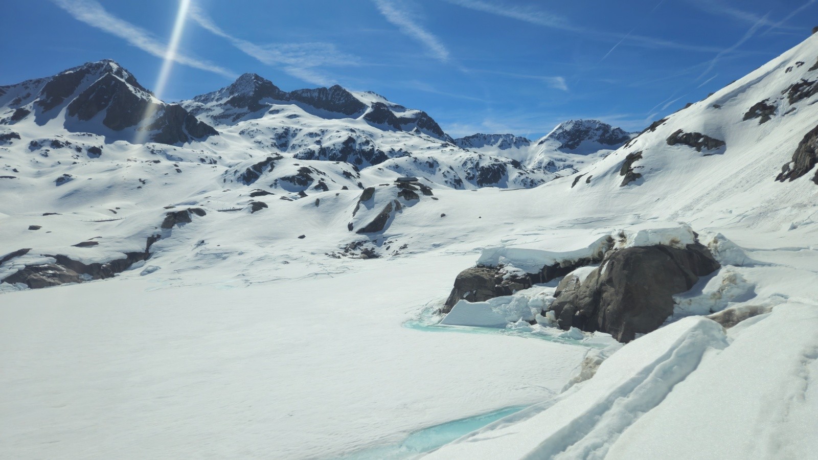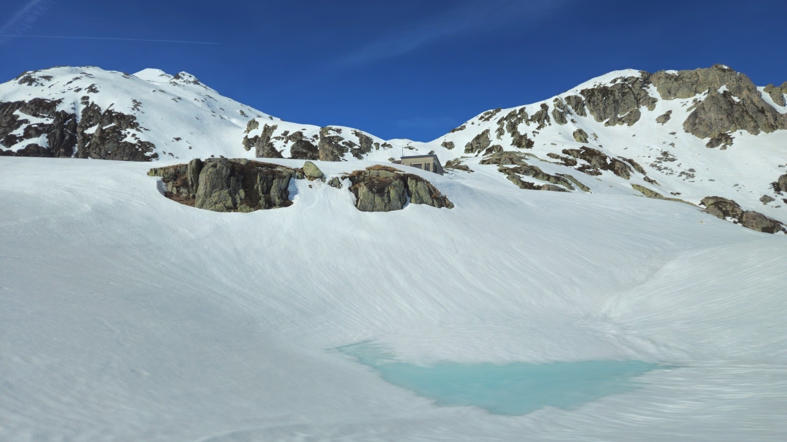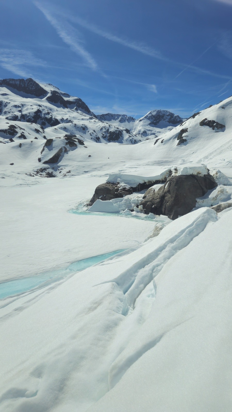 Arrivés au col la neige ne semble pas encore transfo. On décide de faire le piquenique pour laisser un peut plus de temps au soleil.