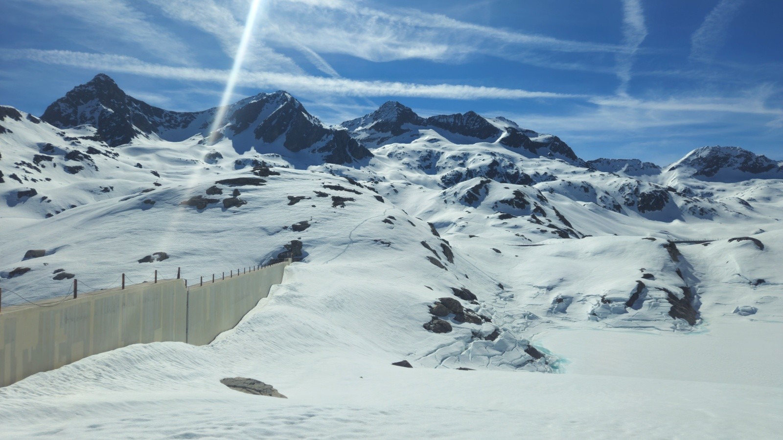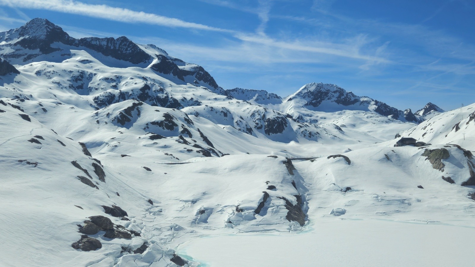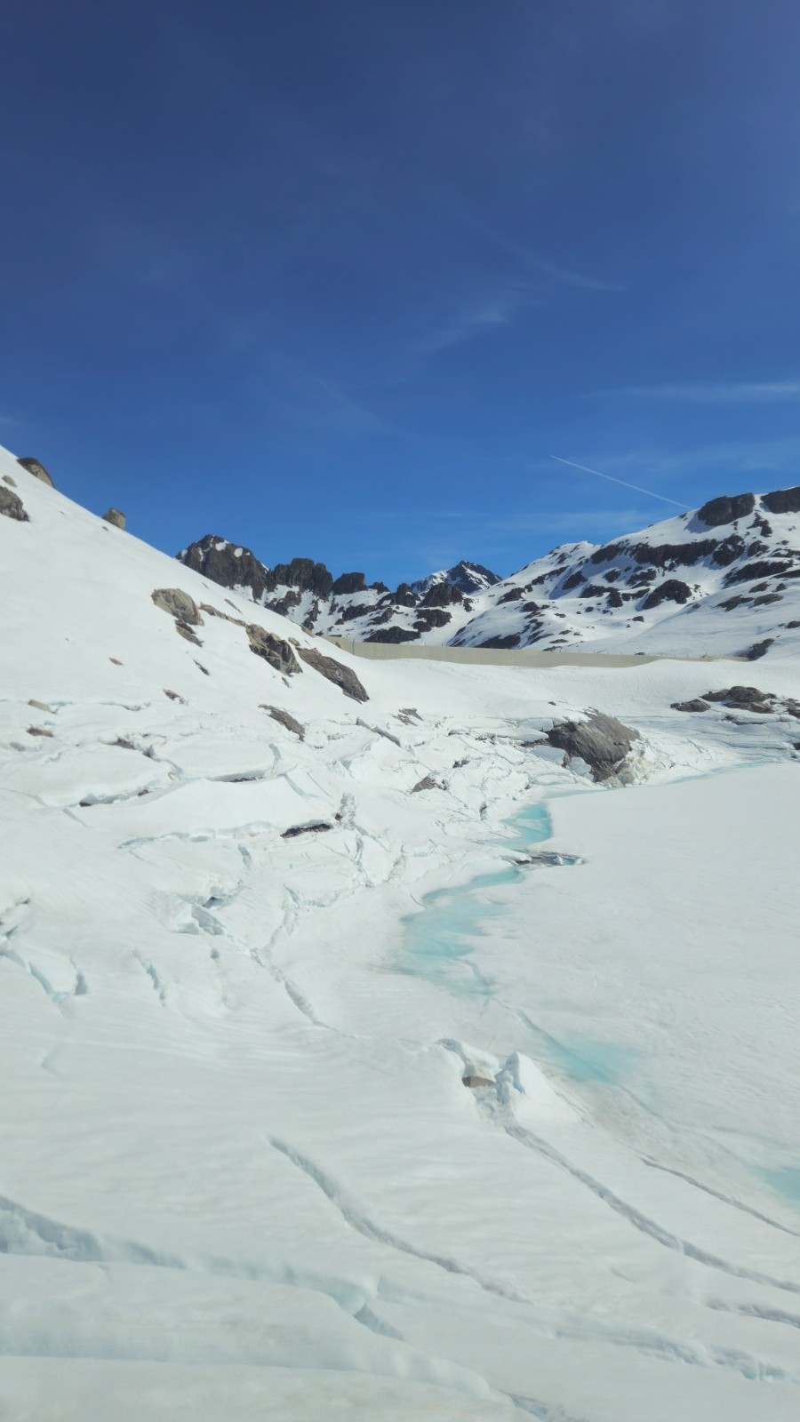 Après un Picnic au dessus du col on descend. les premiers virages sont très bons en moquette à poil très courts avec un bon grip, puis en neige assez dure, puis en neige assez molle...