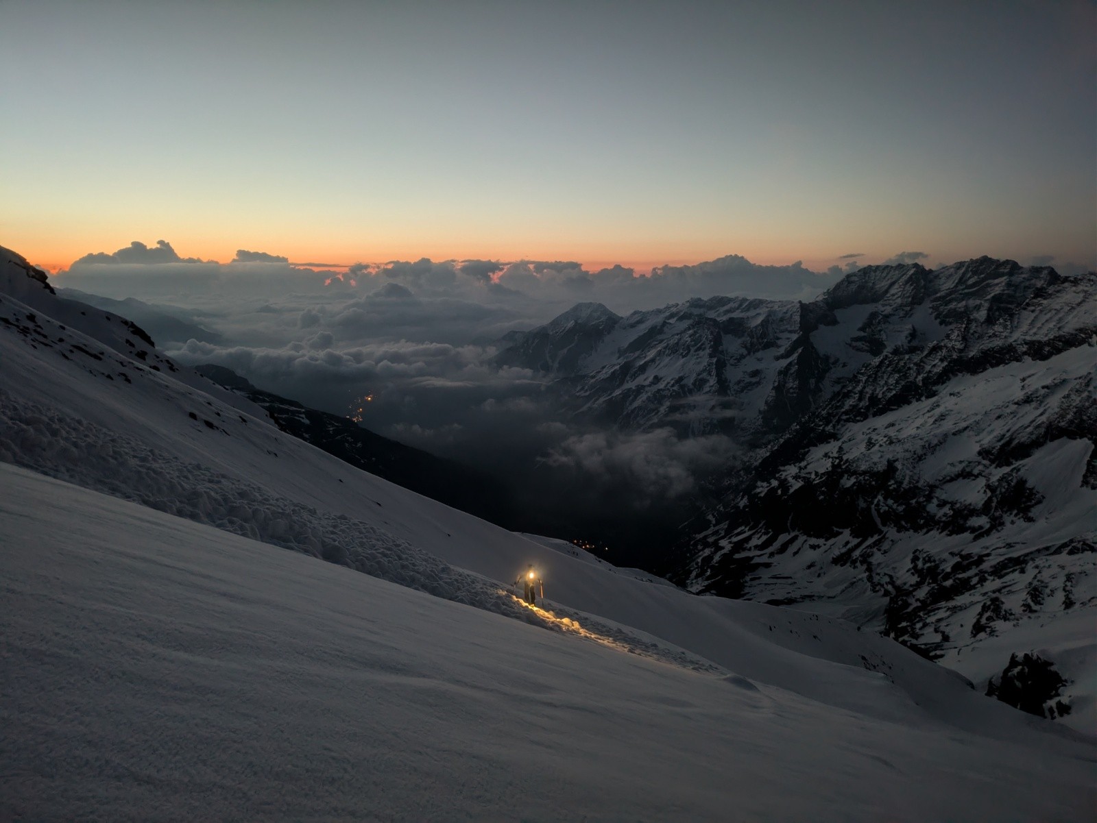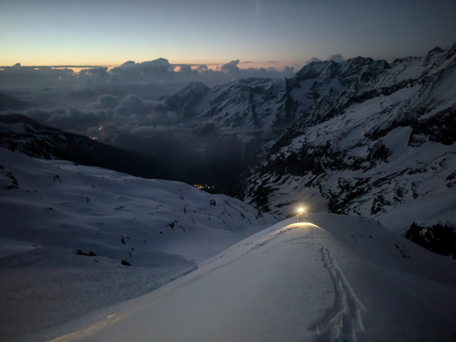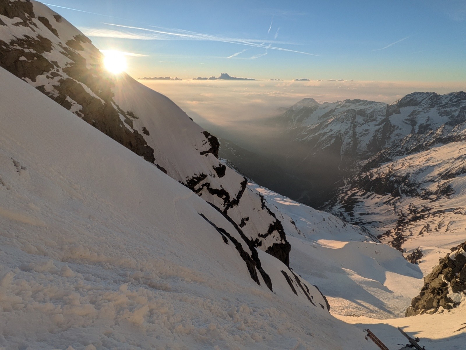 Du coup on se retrouve pour le classique dodo en van avec un départ depuis Bonneval. Départ à 5h, on entame les 5 bornes de ski de fond avant de commencer à monter vers le glacier du Mulinet. Froid polaire avec la brise descendante, on arrive un peu avant 9h au col de la Gura qui est déjà au soleil depuis un bon moment. Grosse ambiance côté Italien avec les cumulus qui accroches les somment en faisant des va et vient, c'est beau.