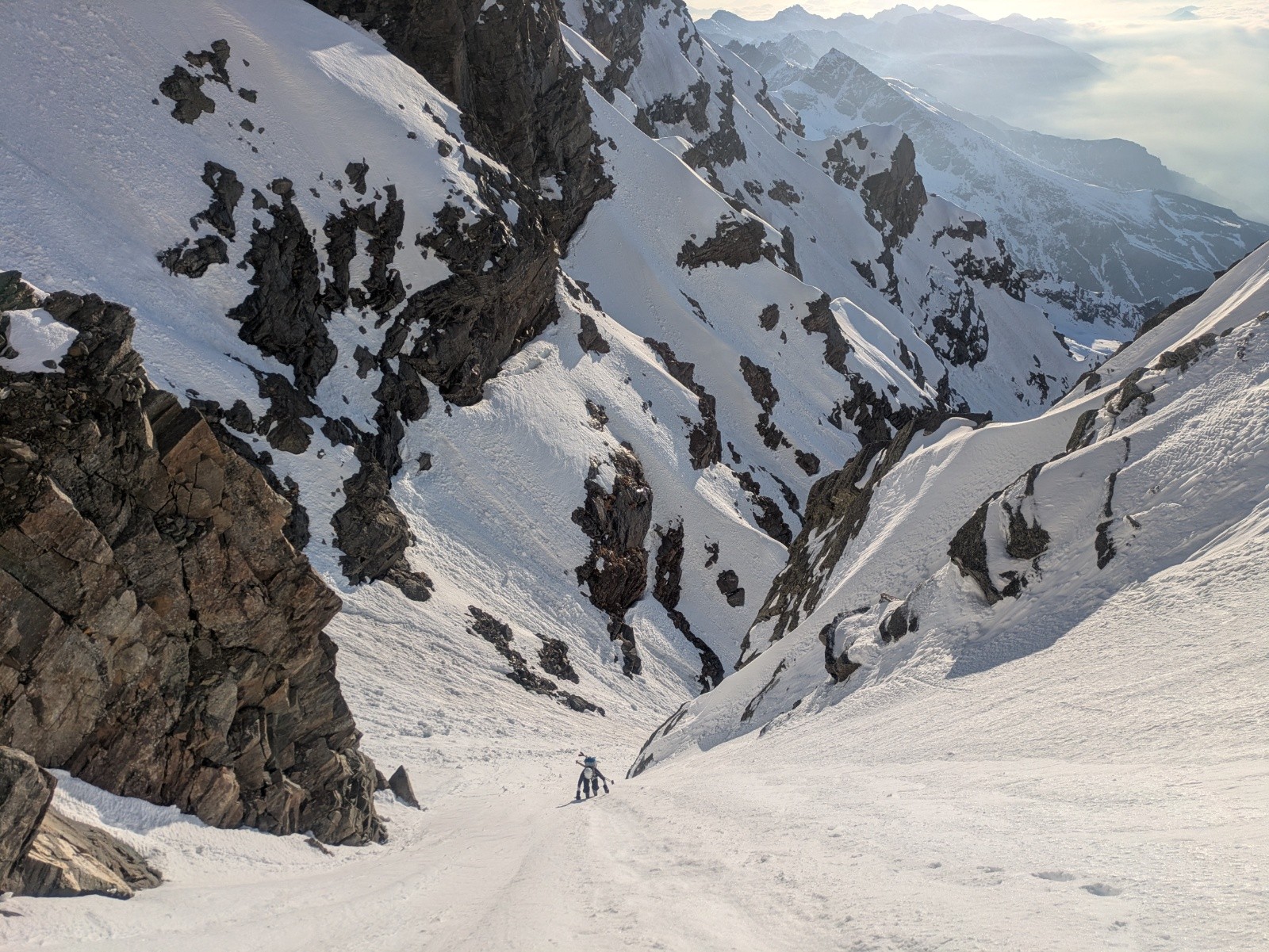 Trêve de rêverie, la suite ça ski plutôt bien, neige revenue (un peu trop) goulotte au centre du couloir mais lisse dans les contre pentes.