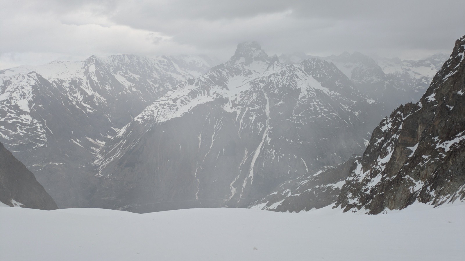 Conditions pour le ski : bon regel sur la partie à ski jusqu'à l'étroiture à presque 3000m. La barre passe bien en diagonal. Par contre la neige est pourrie en profondeur sur la suite (1m de neige consistance en dessous des 10cm regelés, très compliqué de monter...)